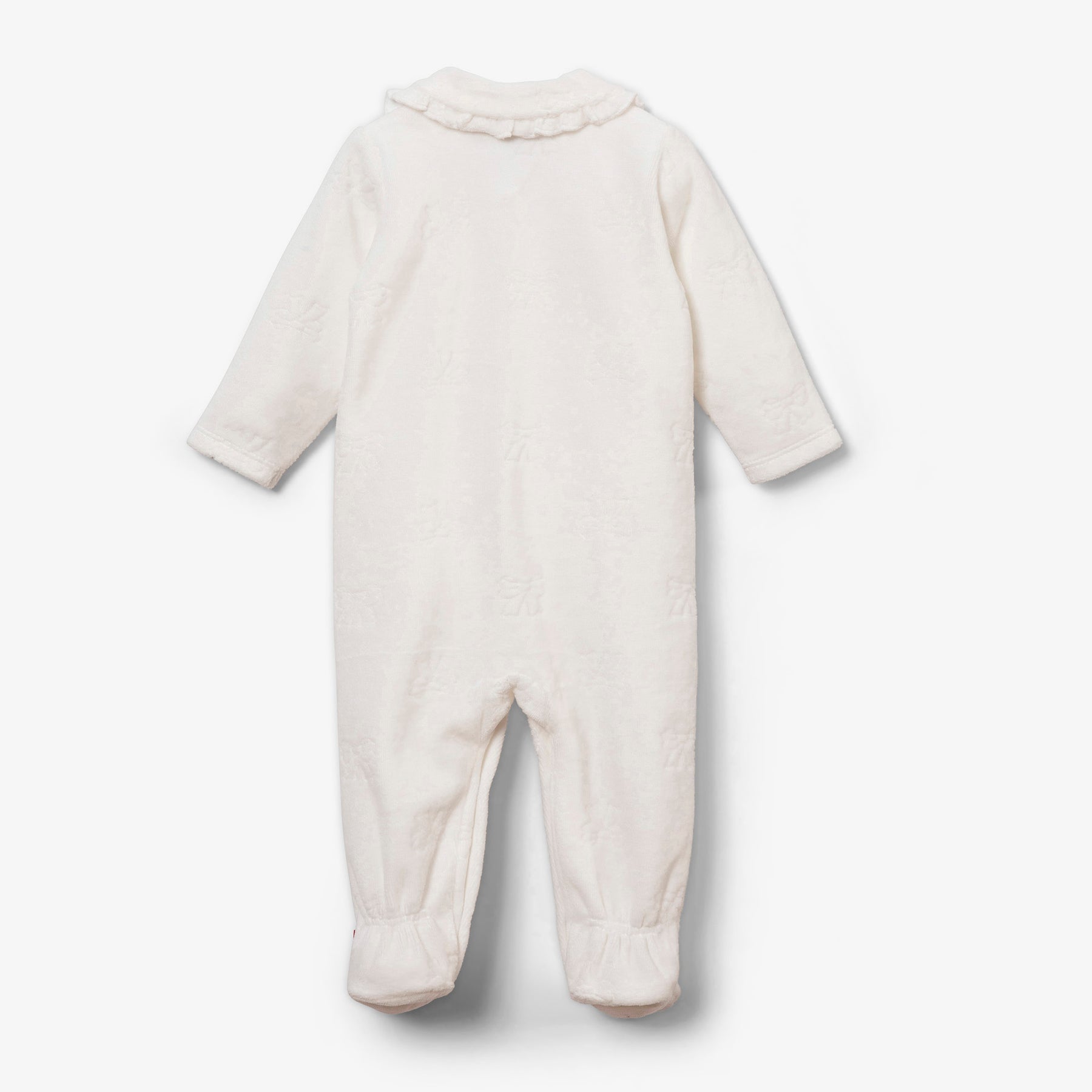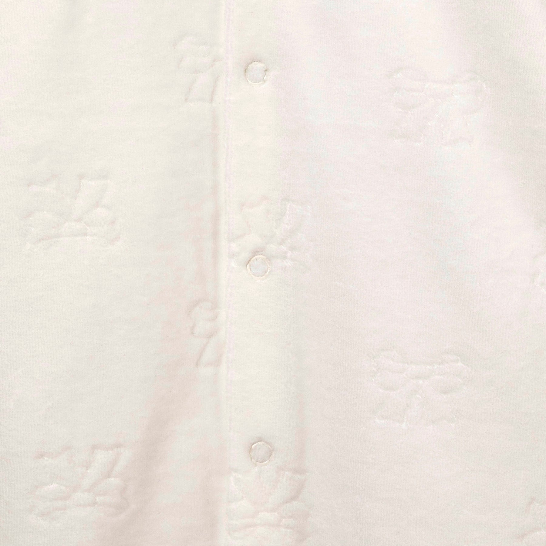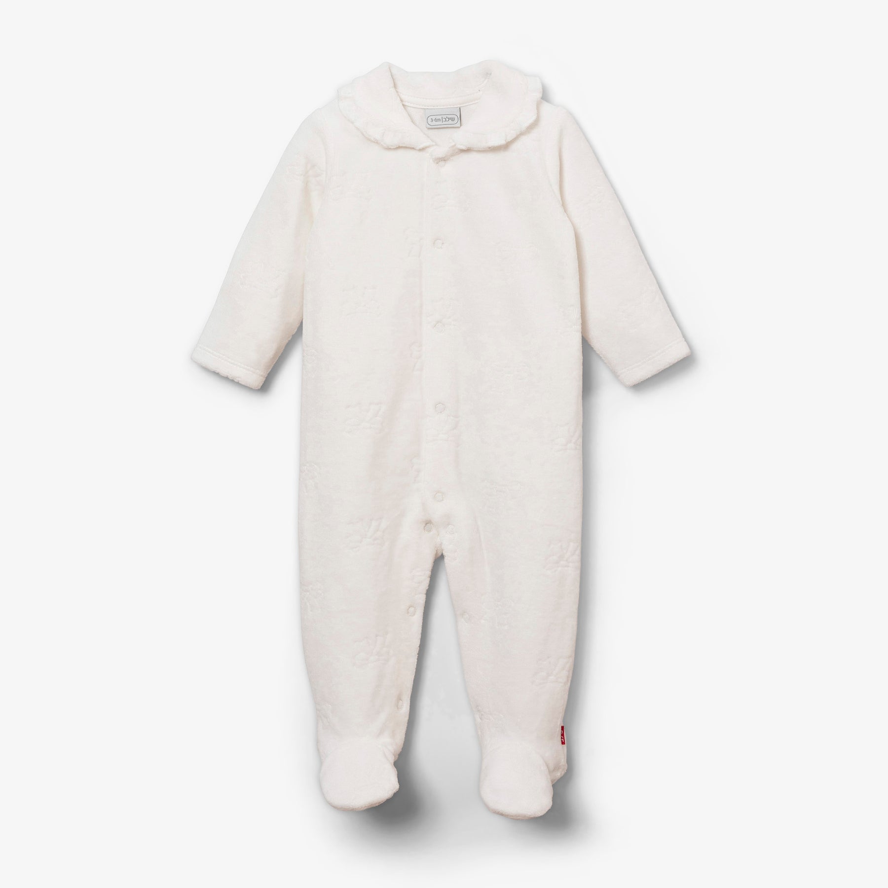 אוברול קטיפה עם רגליות בטקסטורת פפיונים אולאובר. לאוברול סגירת לחצניות וצווארון מלמלה.
