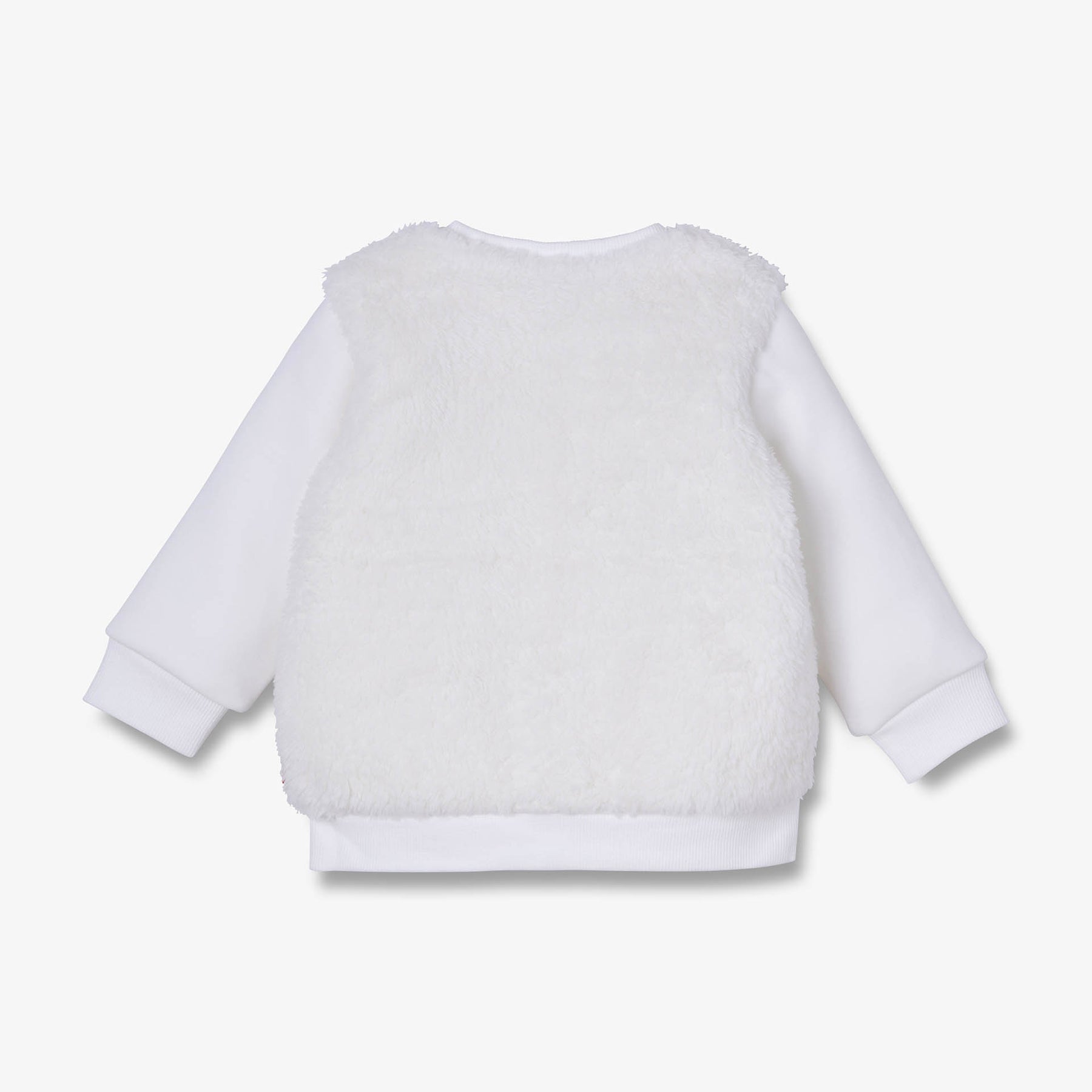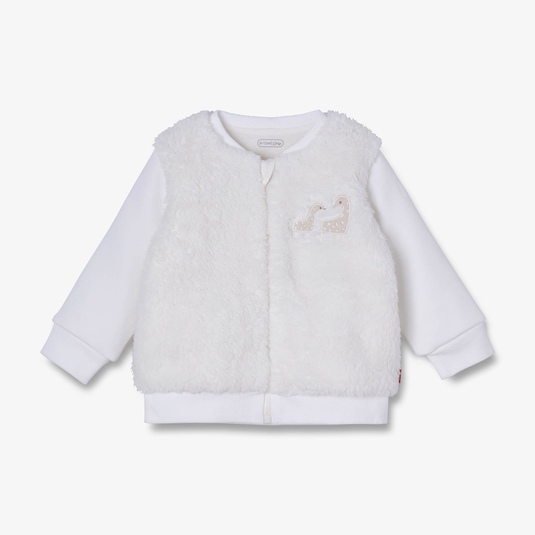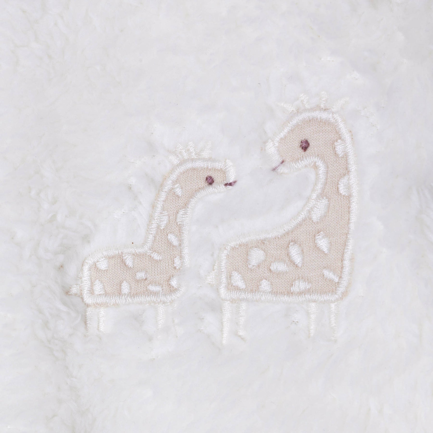 קרדיגן פרוותי בצבע אוף וויט ועם רקמת ג'ירפות. לקרדיגן סגירת רוכסן.
