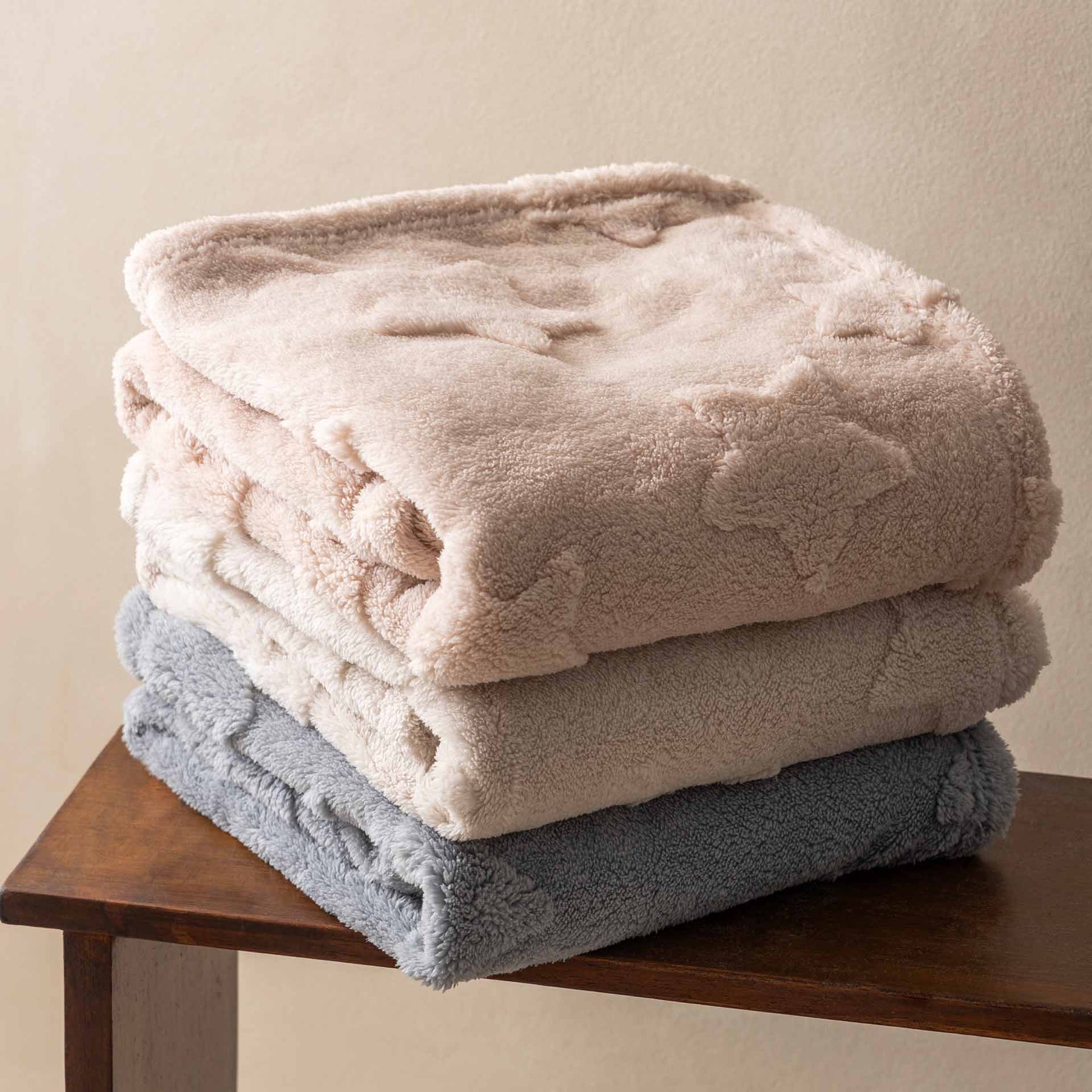 שמיכת פליז למיטת תינוק/ת בצבע אבן ועם טקסטורת כוכבים מובלטים. מידה: 90X120 סמ. 100% פוליאסטר.