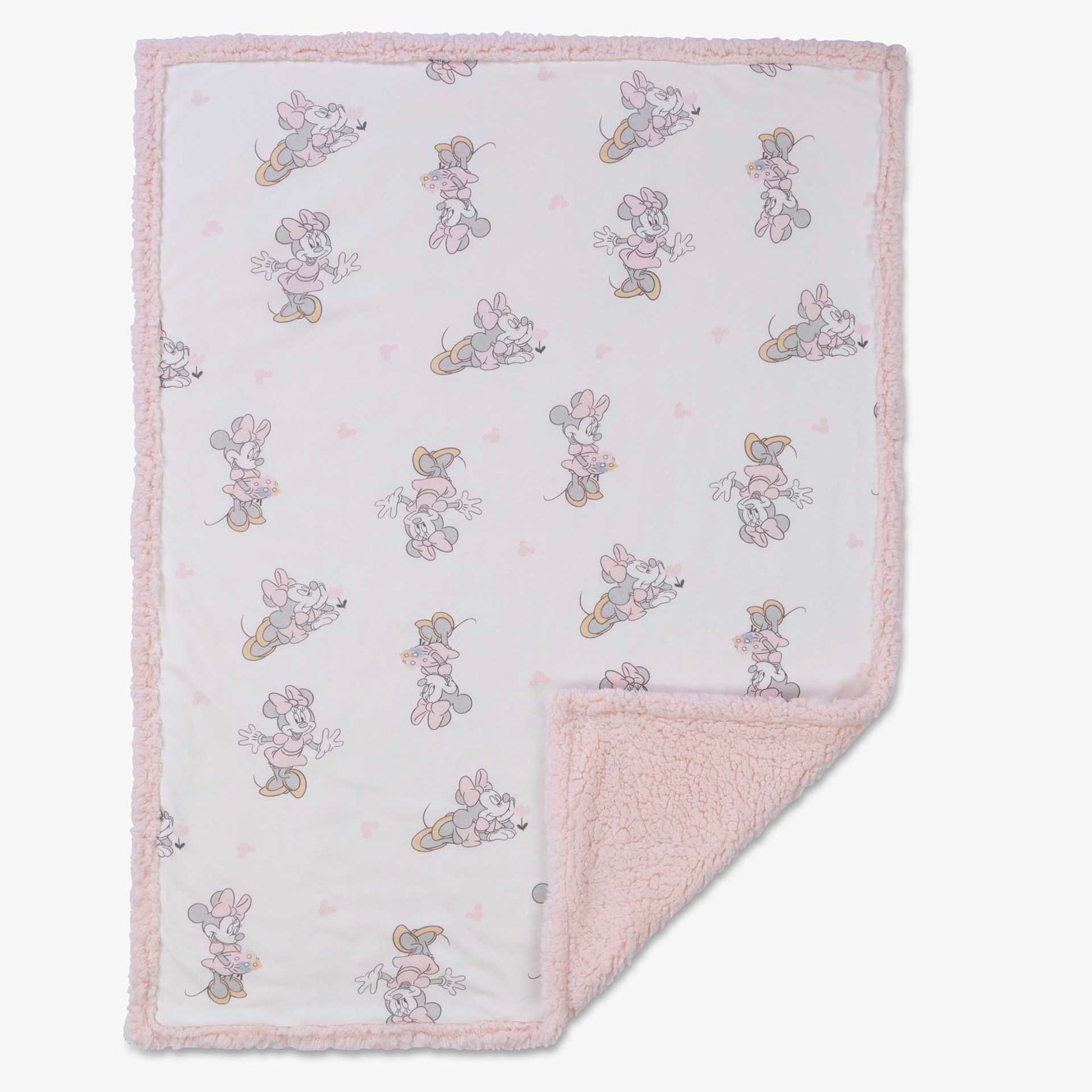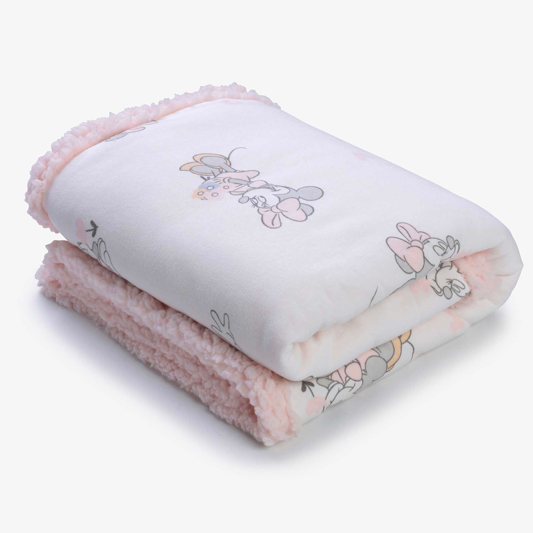שמיכת פוטר דו- צדדית למיטת התינוק בהדפס מיני מאוס ופרוות שרפא ורודה. מידה: 90X120 סמ. הרכב הבד: 65% כותנה 35% פוליאסטר/ שרפא 100% פוליאסטר.