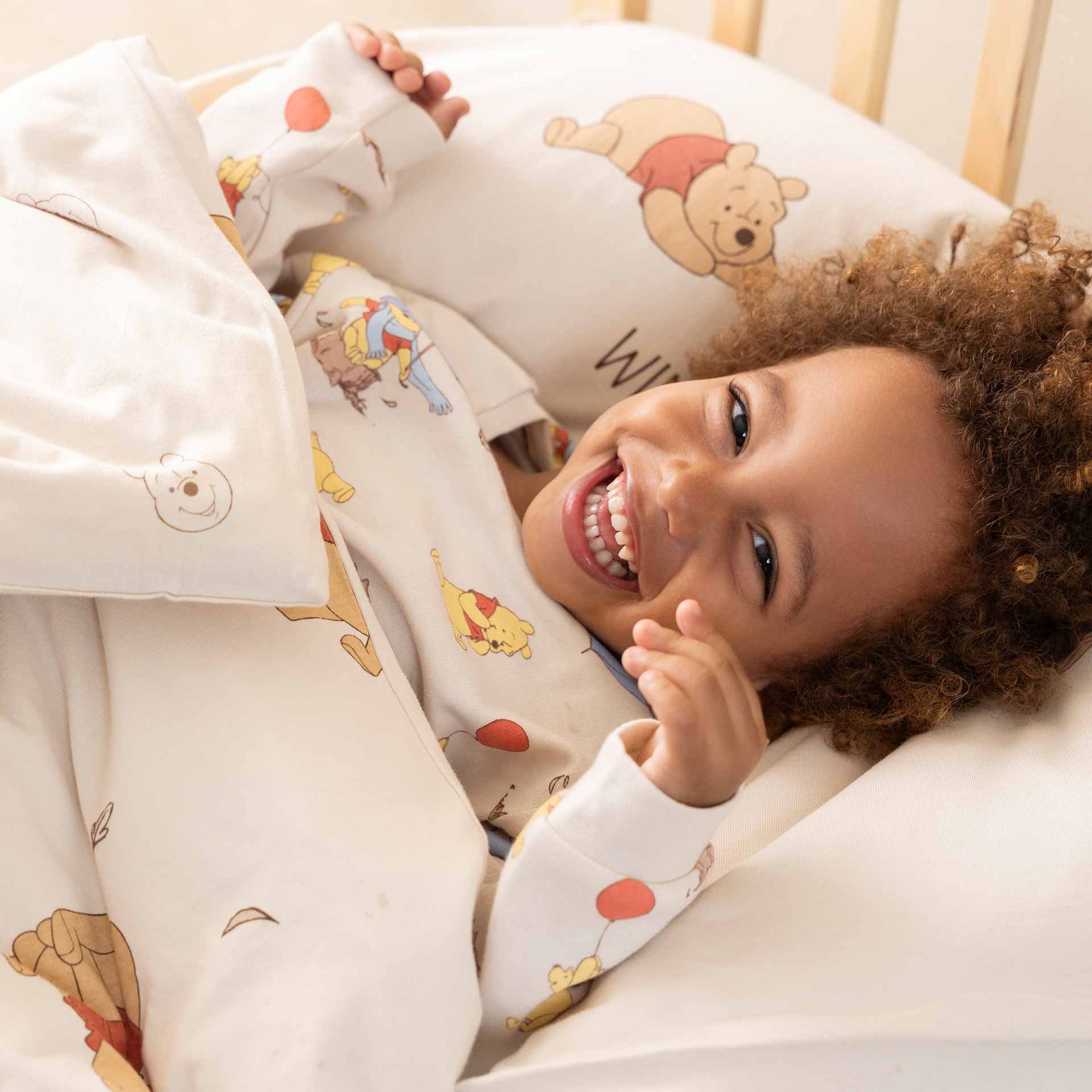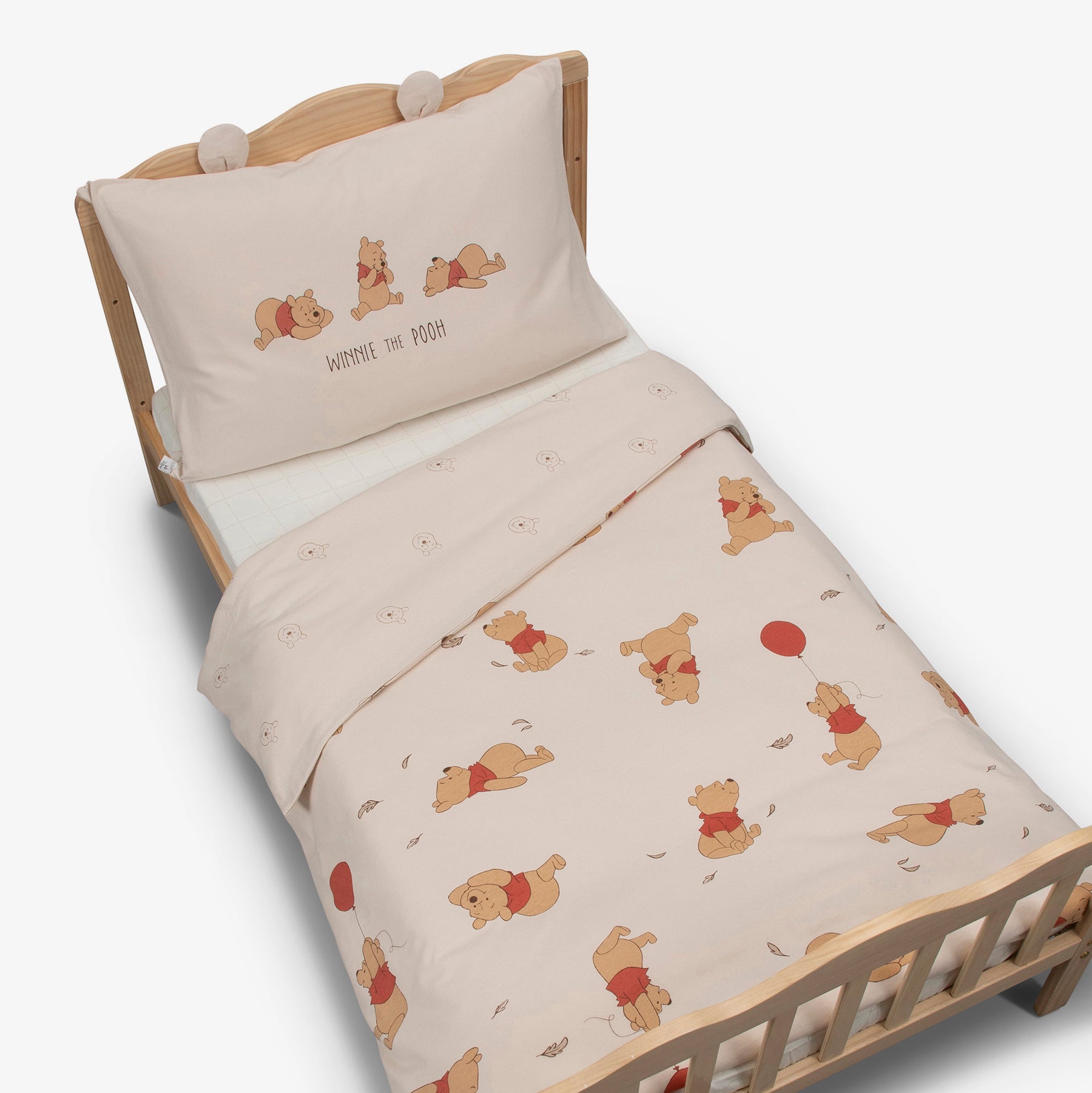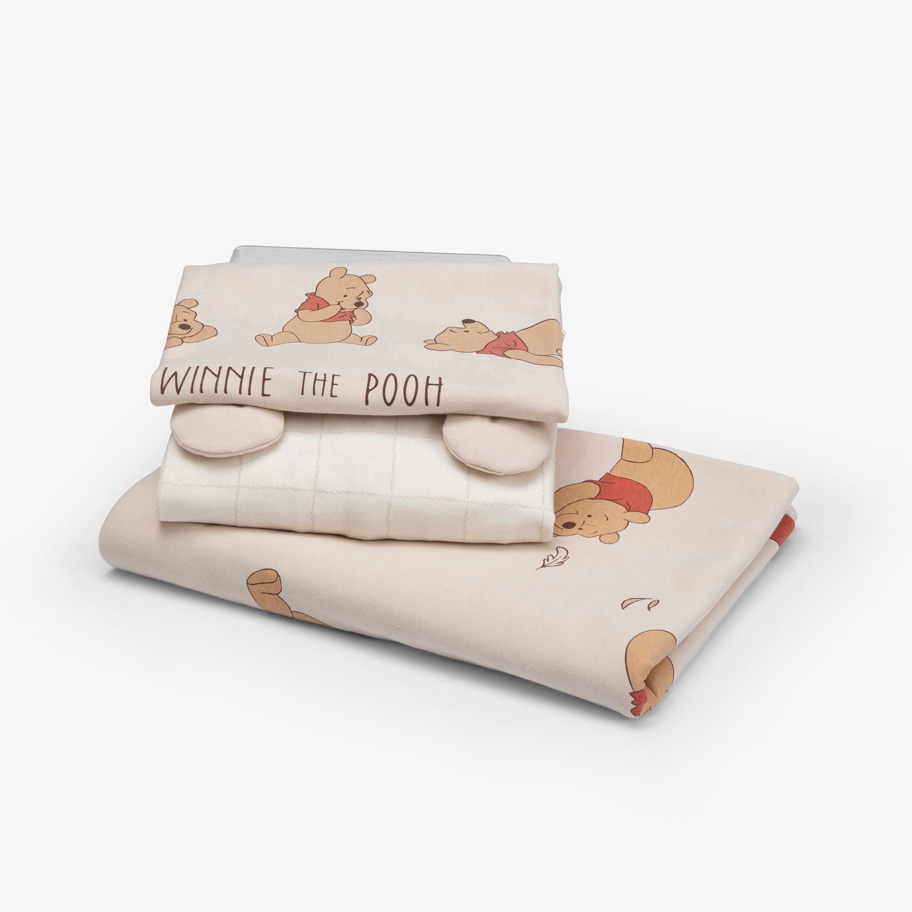סט מצעים מכותנה איכותית למיטת מעבר טודלר מתוך קולקציית החורף החדשה בעיצוב דמותו של פו הדב. הסט כולל ציפית לכרית 70X50 סמ/ סדין 70X130 סמ/ ציפה לשמיכה 100X140 סמ. 100% כותנה.