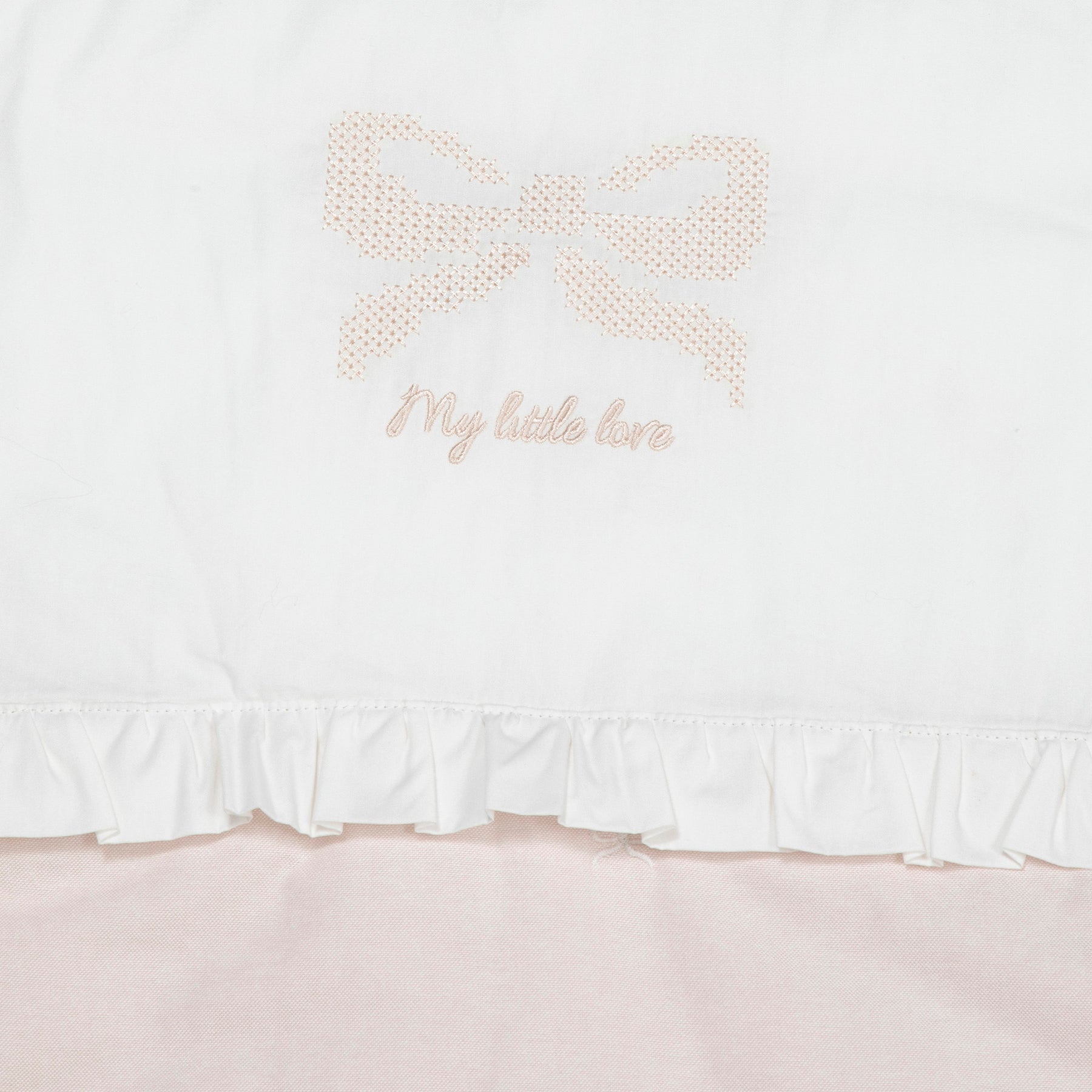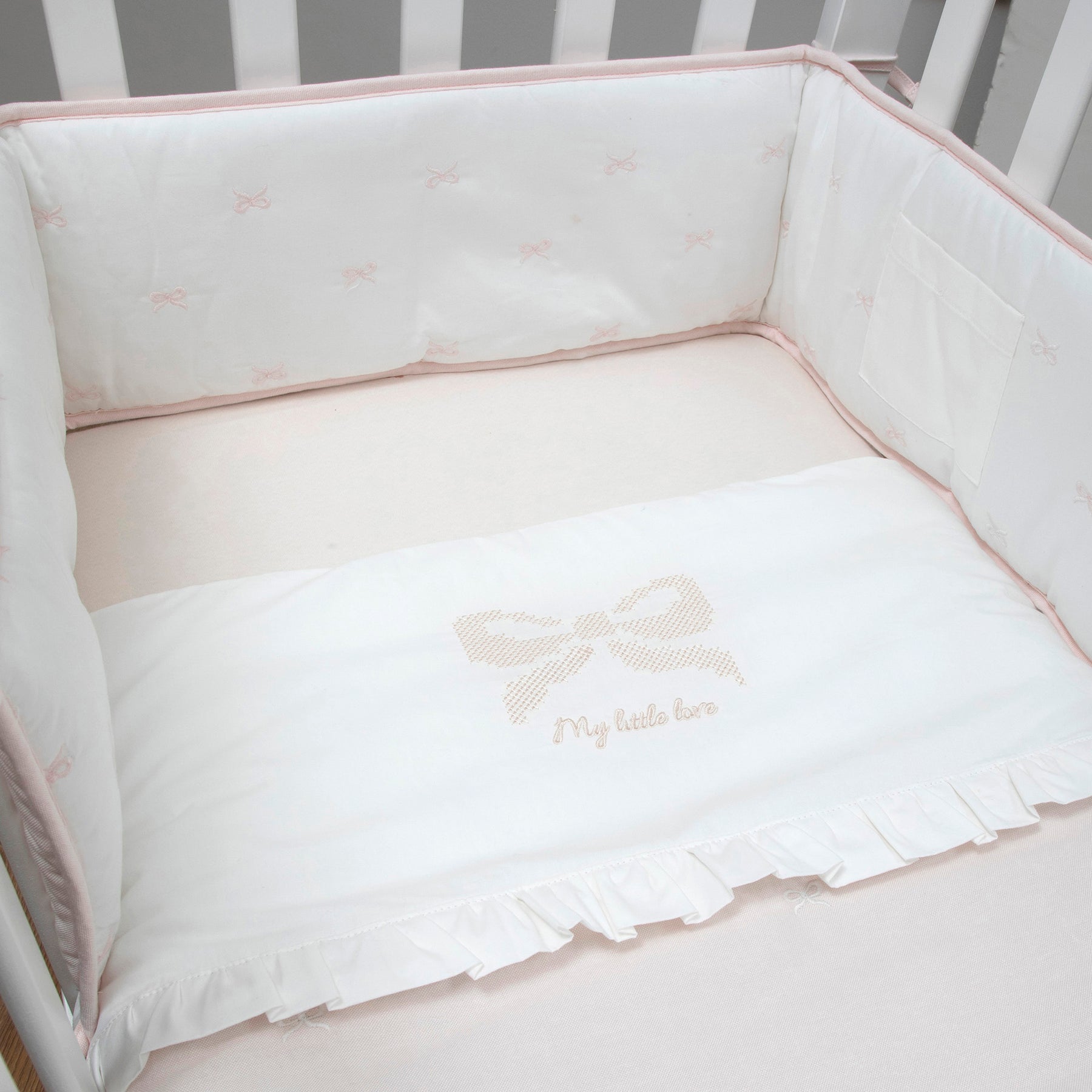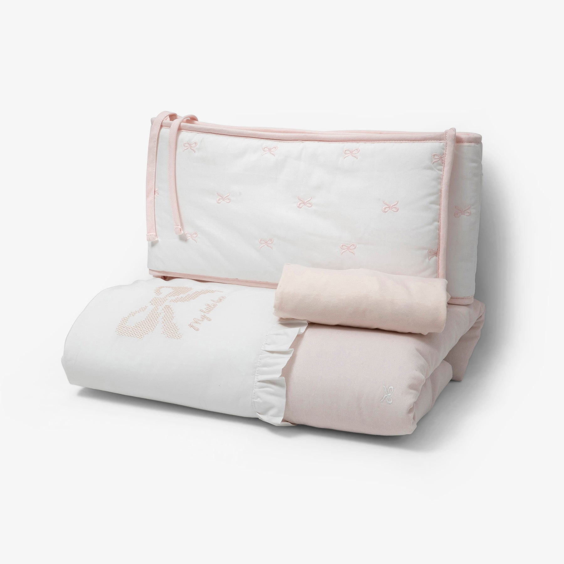 סט מצעים איכותי לעריסת התינוקת בעיצוב רקמת פפיון. הסט כולל מגן ראש במידה 20X126 סמ 100% כותנה+ מילוי 100% הוליפייבר שמיכה דו צדדית 80X62 סמ 100% כותנה+ מילוי 100% הוליפייבר סדין 100% כותנה במידה 84X45 סמ.