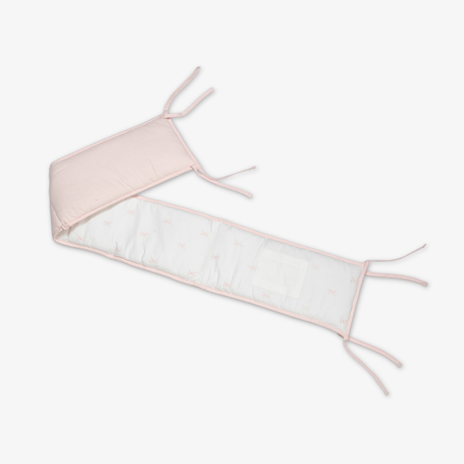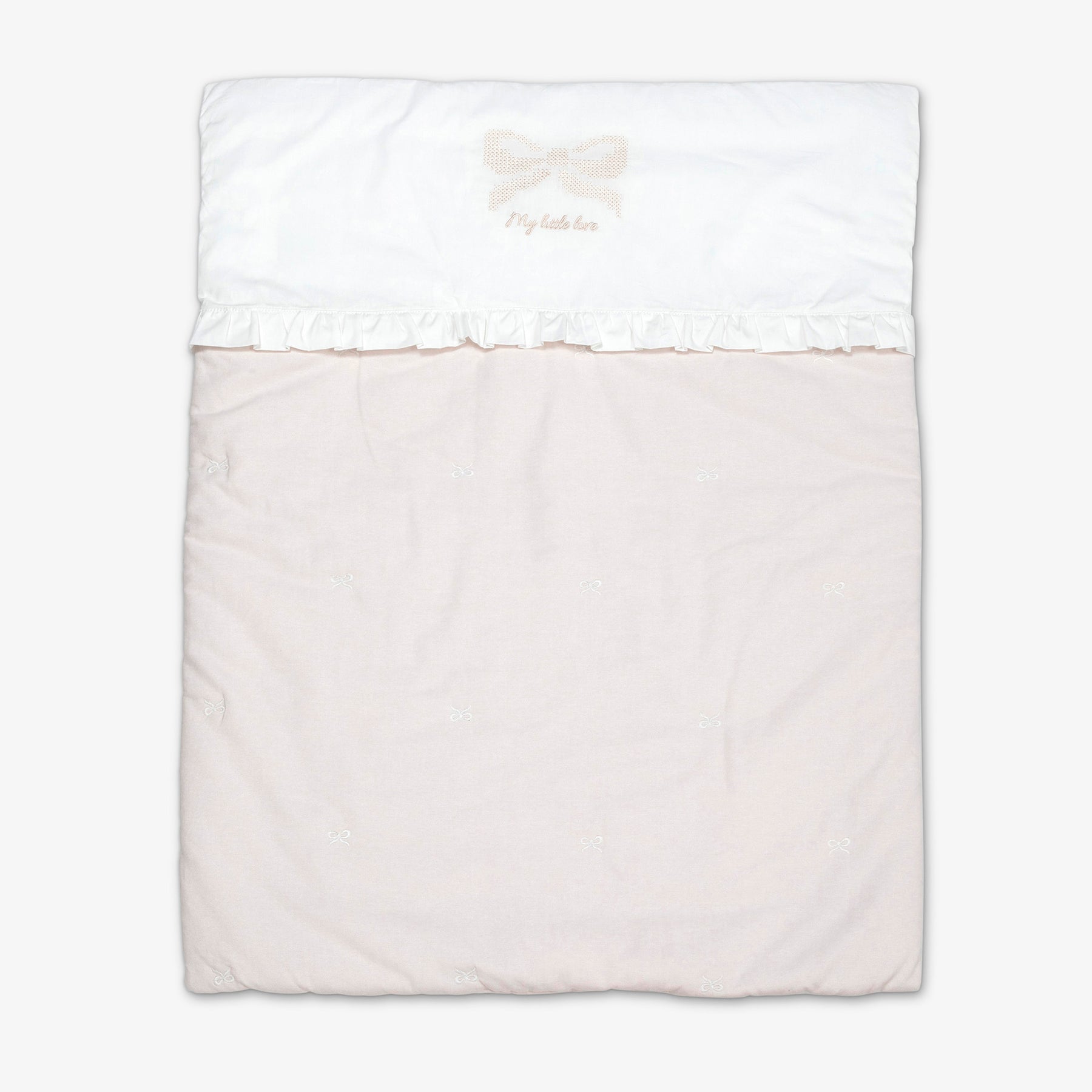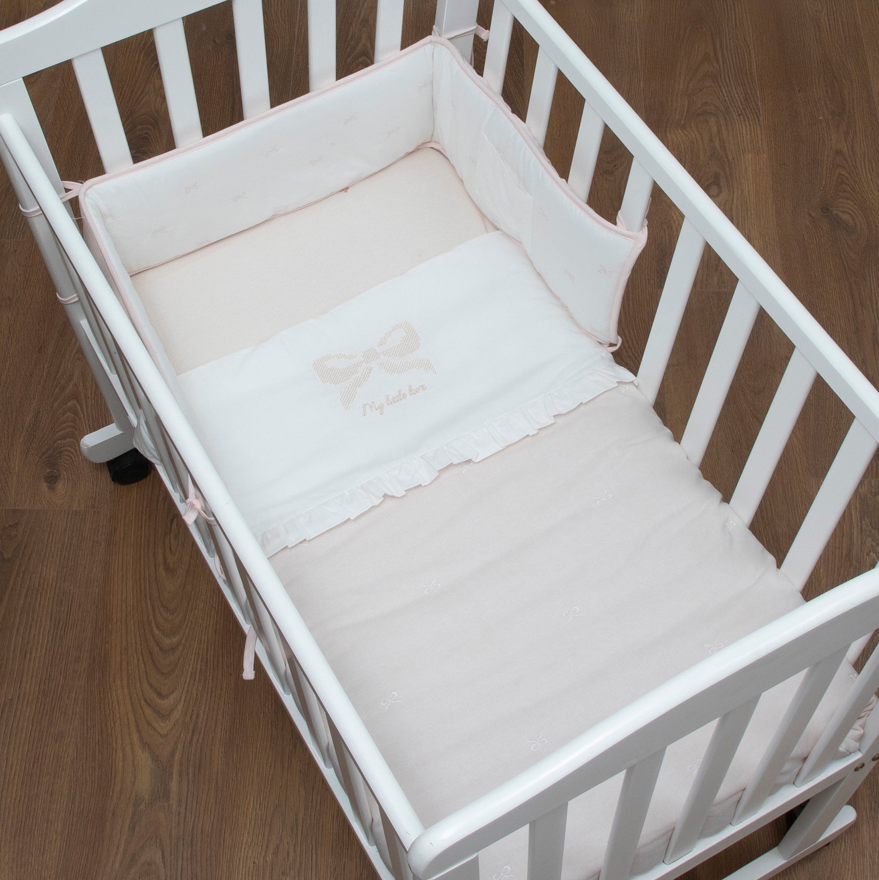 סט מצעים איכותי לעריסת התינוקת בעיצוב רקמת פפיון. הסט כולל מגן ראש במידה 20X126 סמ 100% כותנה+ מילוי 100% הוליפייבר שמיכה דו צדדית 80X62 סמ 100% כותנה+ מילוי 100% הוליפייבר סדין 100% כותנה במידה 84X45 סמ.
