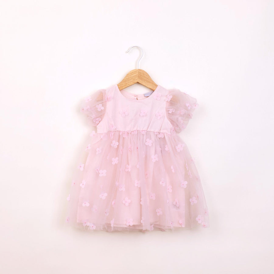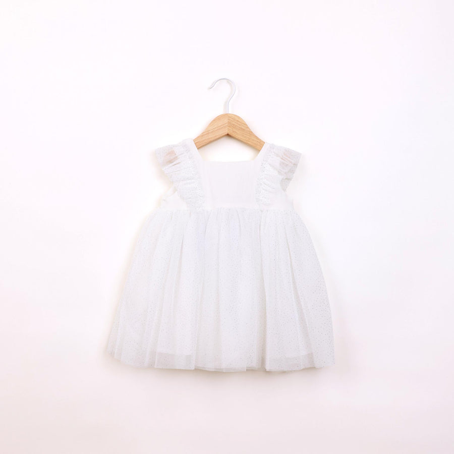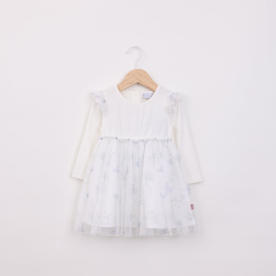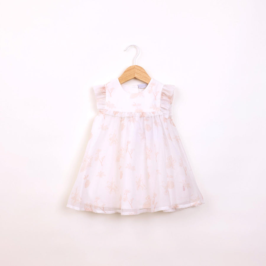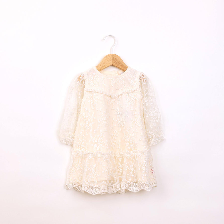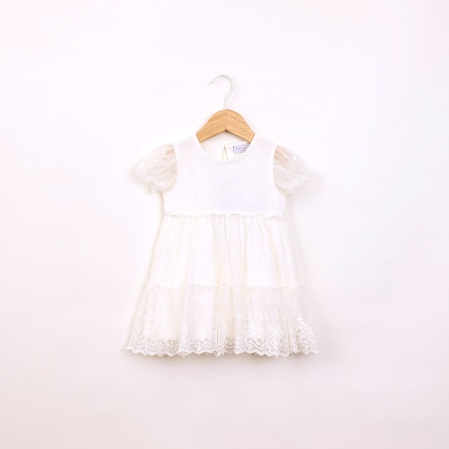 שמלה חגיגית עם שכבת טול ורקמת פרחים בגוון שמנת