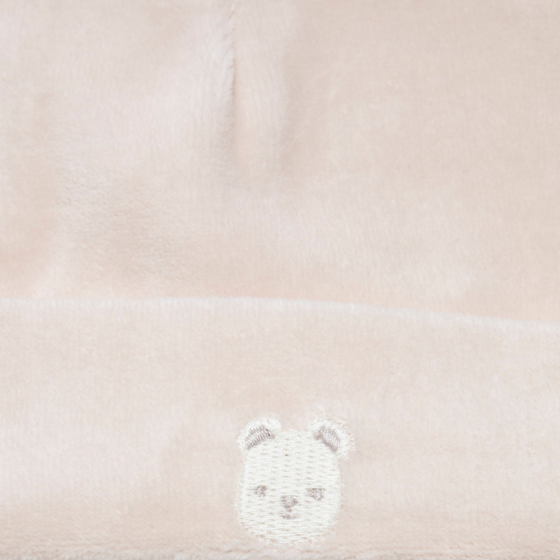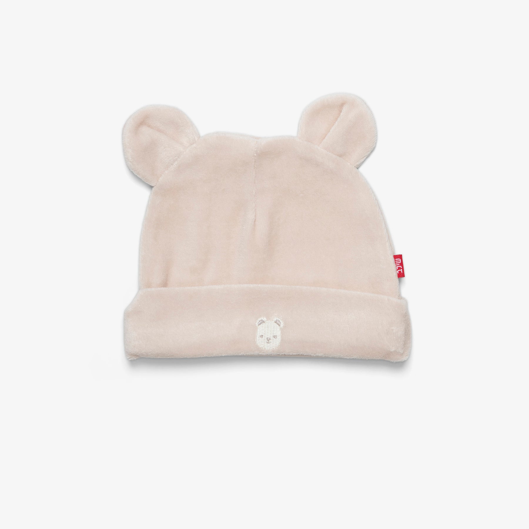 כובע קטיפה ראשוני עם רקמת דובי ואוזניים מובלטות. הכובע בצבע אבן.
