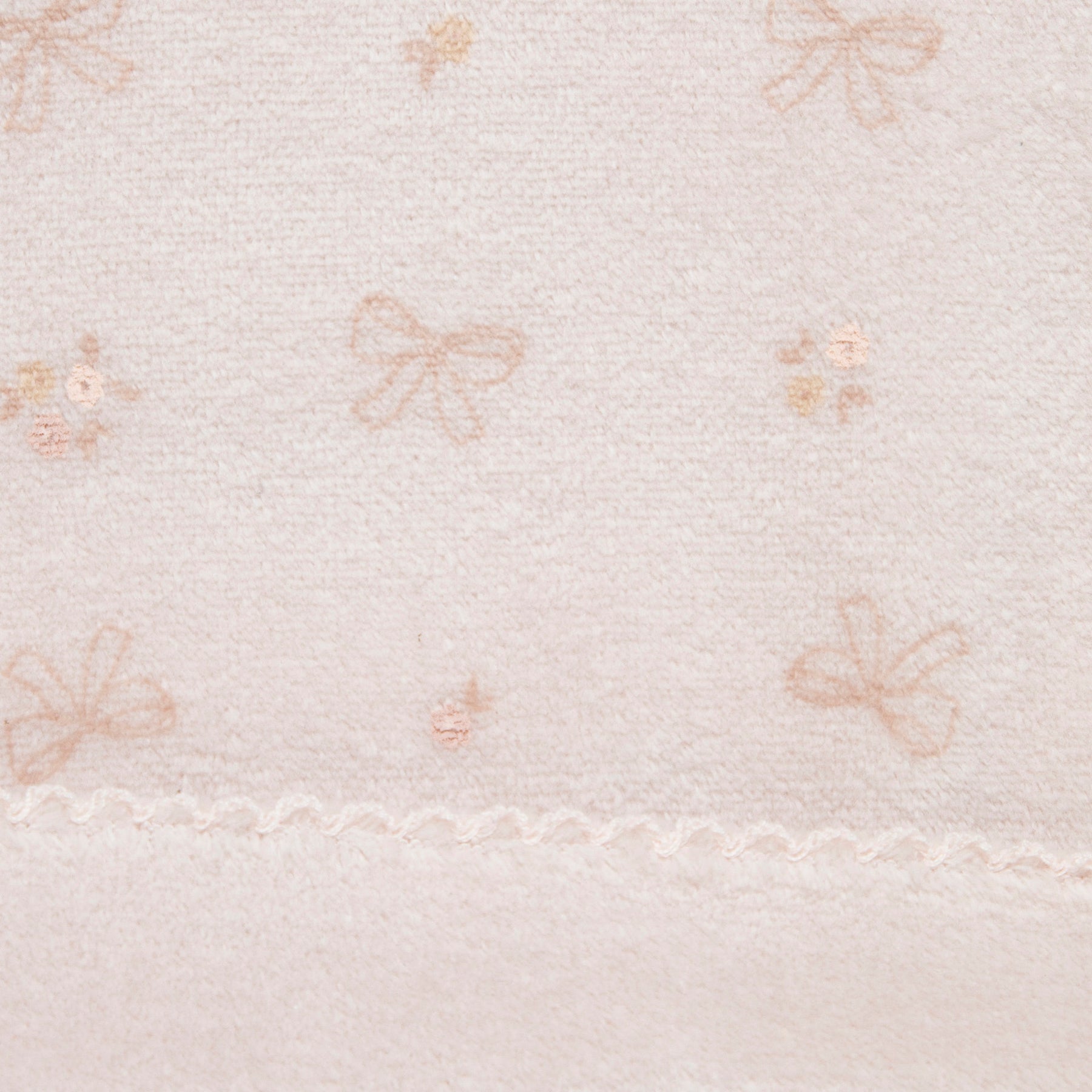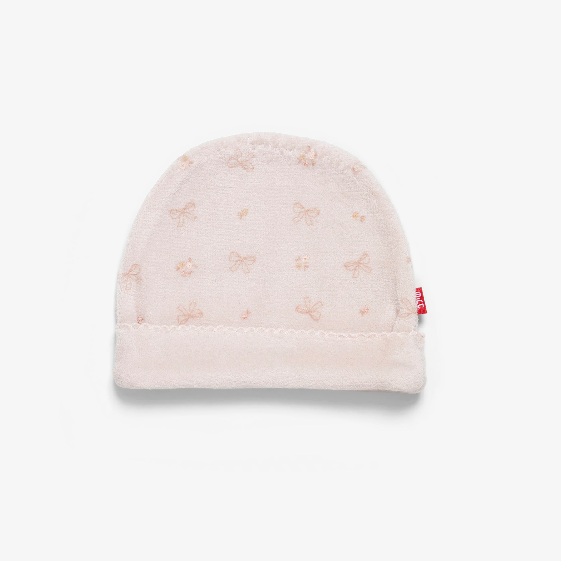כובע קטיפה ראשוני בצבע פודרה ובהדפס פפיונים.