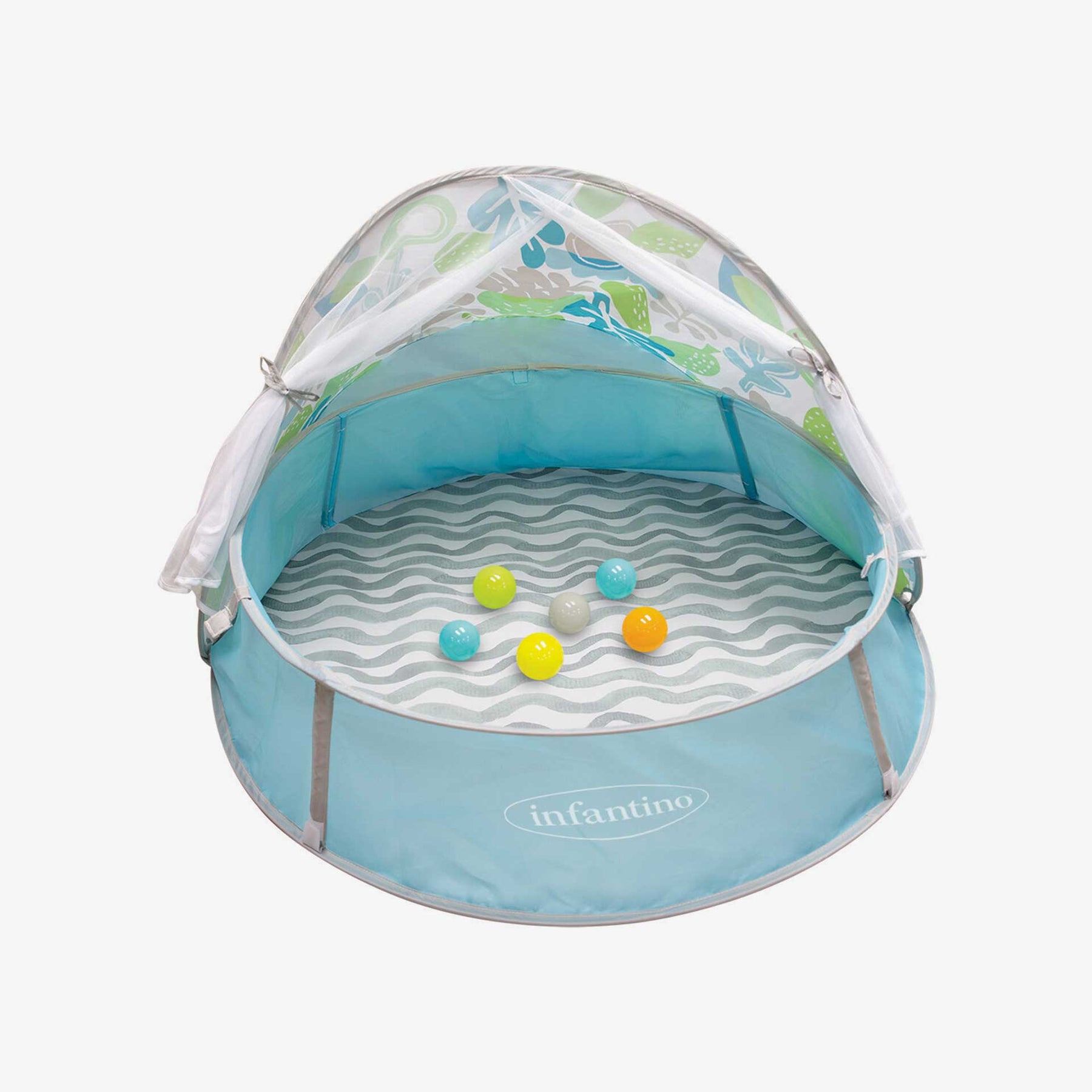 אוהל בריכת כדורים נייד של אינפנטינו. אוהל 3 1-ב המלווה את התינוק בשלבים השונים של ההתפתחות. 3 אפשרויות משחק בהתאם לגיל התינוק. בתחילה ניתן להשתמש באוהל והמתחם ביחד ליצירית מקום משחק לתינוק בהמשך ניתן לקפל את התחימה וליצור מרחב משחק פתוח יותר כאשר התינוק יושב עצמאית מגיל עשרה חודשים ניתן להשתמש בבריכת הכדורים לבדה. עשוי מבד עם מסנן קרינה קל לקיפול ולאחסון בתיק נשיאה המצורף. מגיע עם 6 כדורי משחק צבעוניים. מתאים לשימוש מגיל 6 חודשים ומעלה.גודל 10010060 סמ