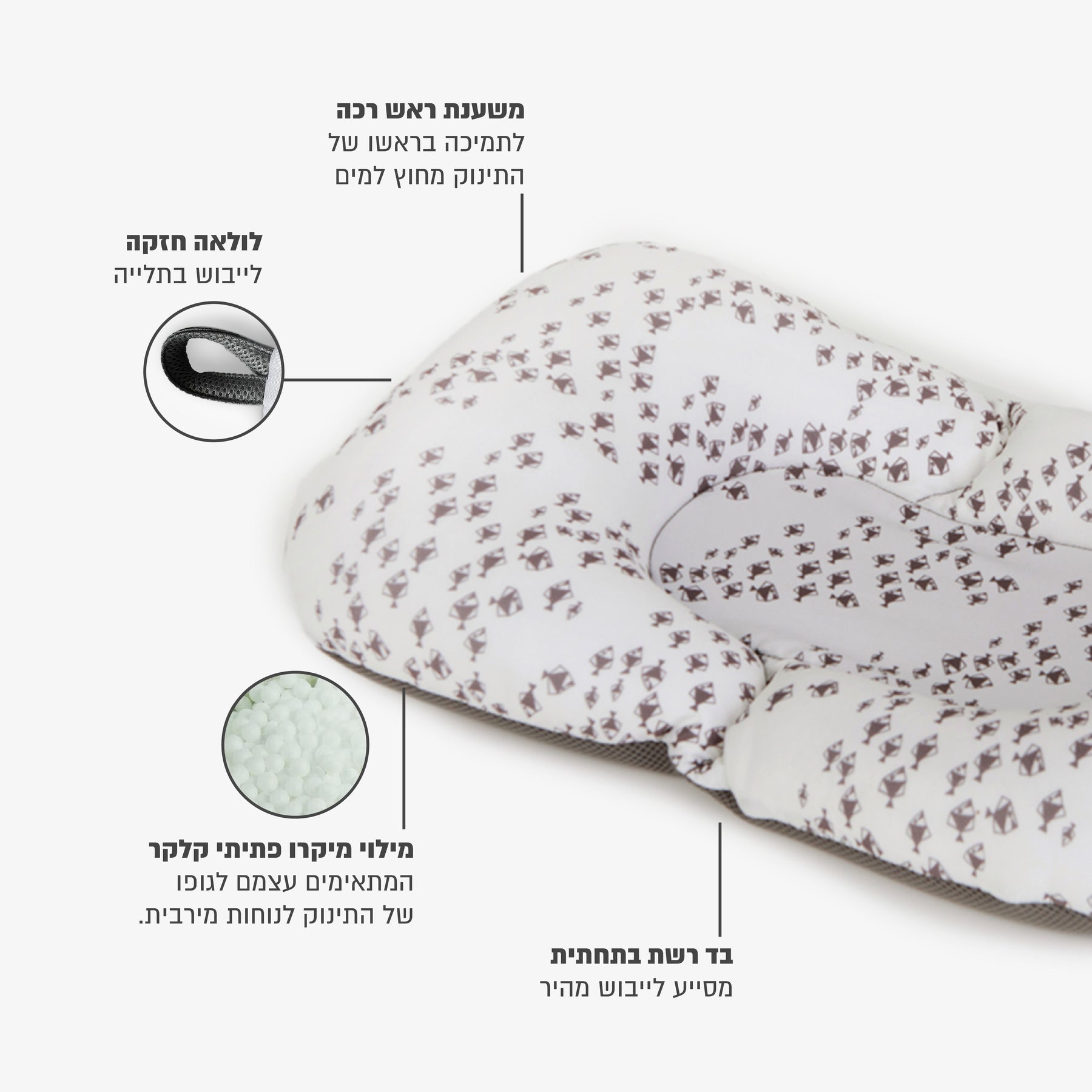 הכרית עשויה בד רך ומפנק עם מילוי פתיתי קלקר המתאימים עצמם לגופו של התינוק