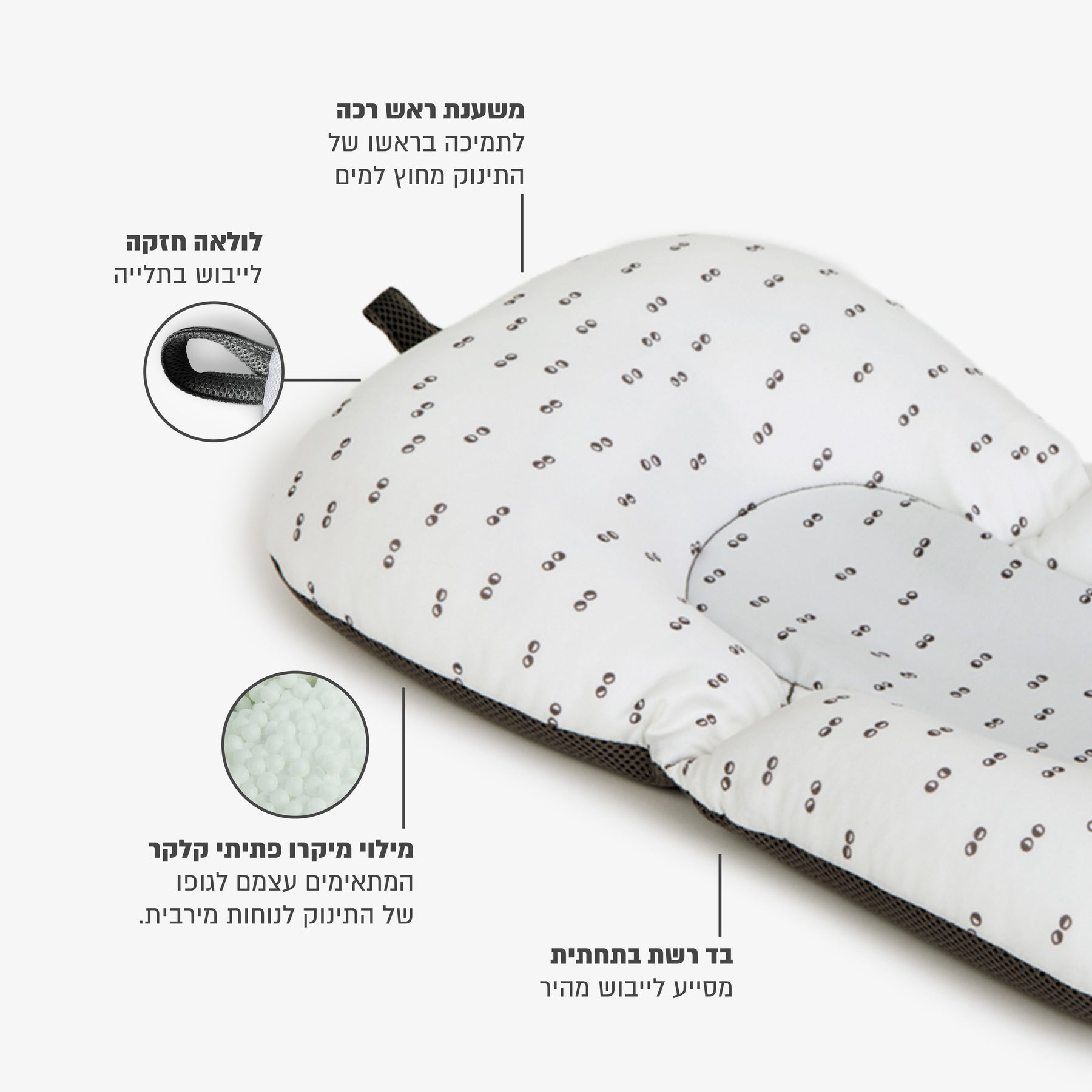 הכרית עשויה בד רך ומפנק עם מילוי פתיתי קלקר המתאימים עצמם לגופו של התינוק