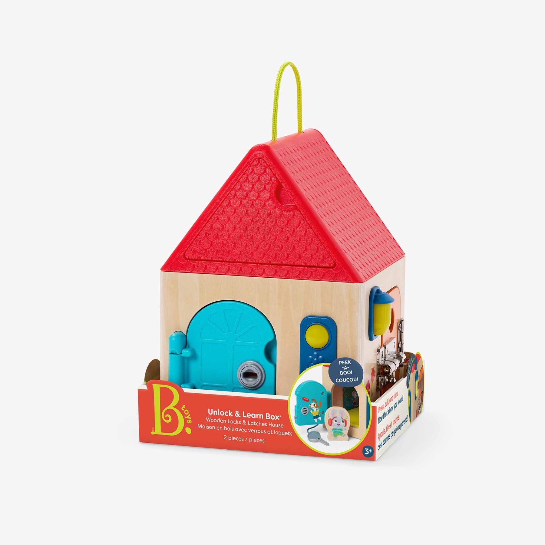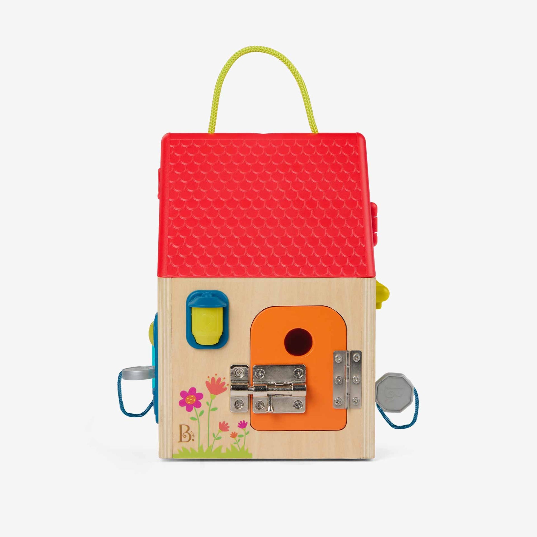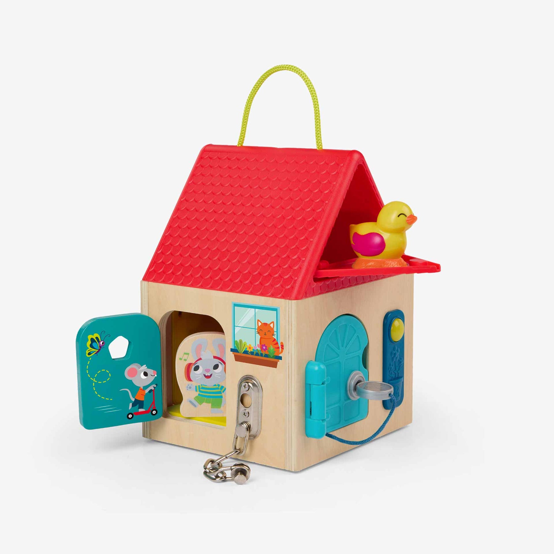 בית פעילות מעץ ללמידה מהנה מלא בדלתות לפתיחה ובהפתעות 2!לגלות דלתות עם מנעולים ומפתחות 2 דלתות עם בריח תאורת מרפסת עובדת פעמון דמות של ארנב 2 חלונות.אפשר לקחת את קופסת המנעולים לכל מקום בזכות ידית נשיאה נוחה. עשוי עץ חזק ועמיד - מושלם למשחק על הרצפה או על שולחן.מסייע בפיתוח פתרון בעיות ומוטוריקה עדינה באמצעות משחק המצריך מיומנות ודיוק. מתאים מגיל 3 שנים ומעלה.