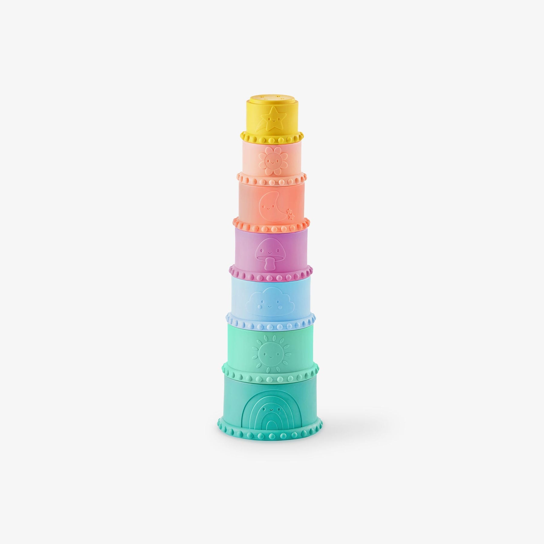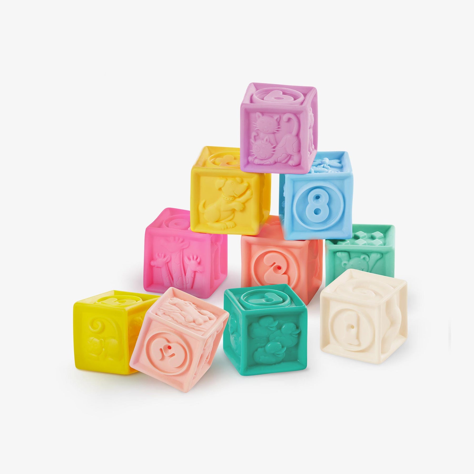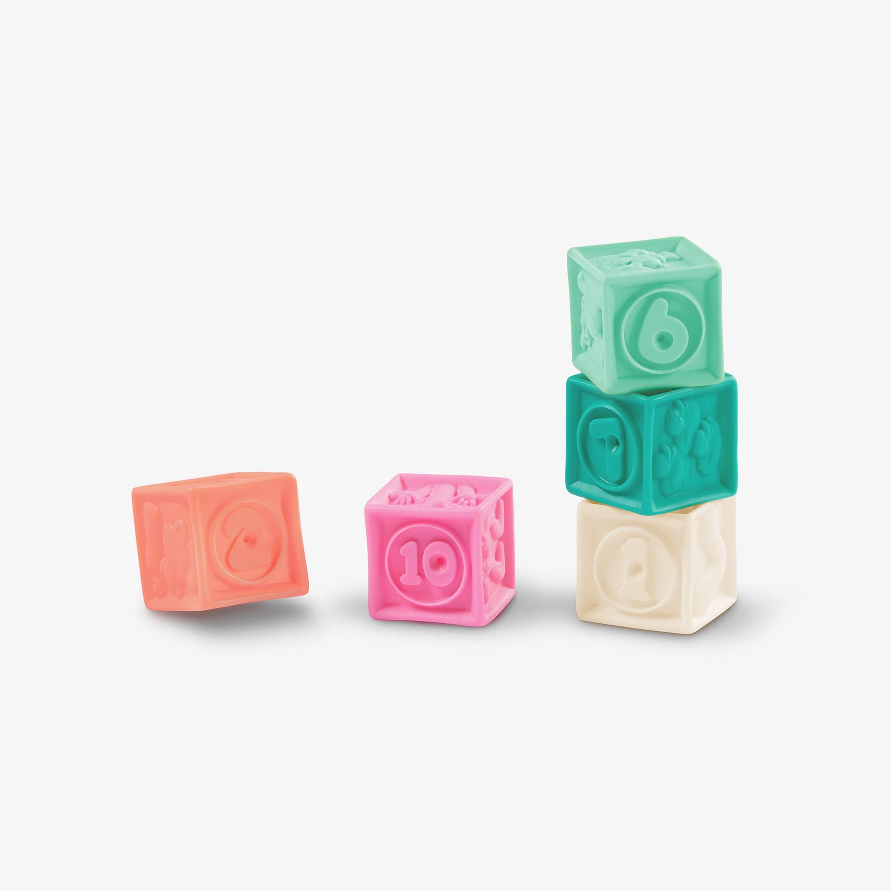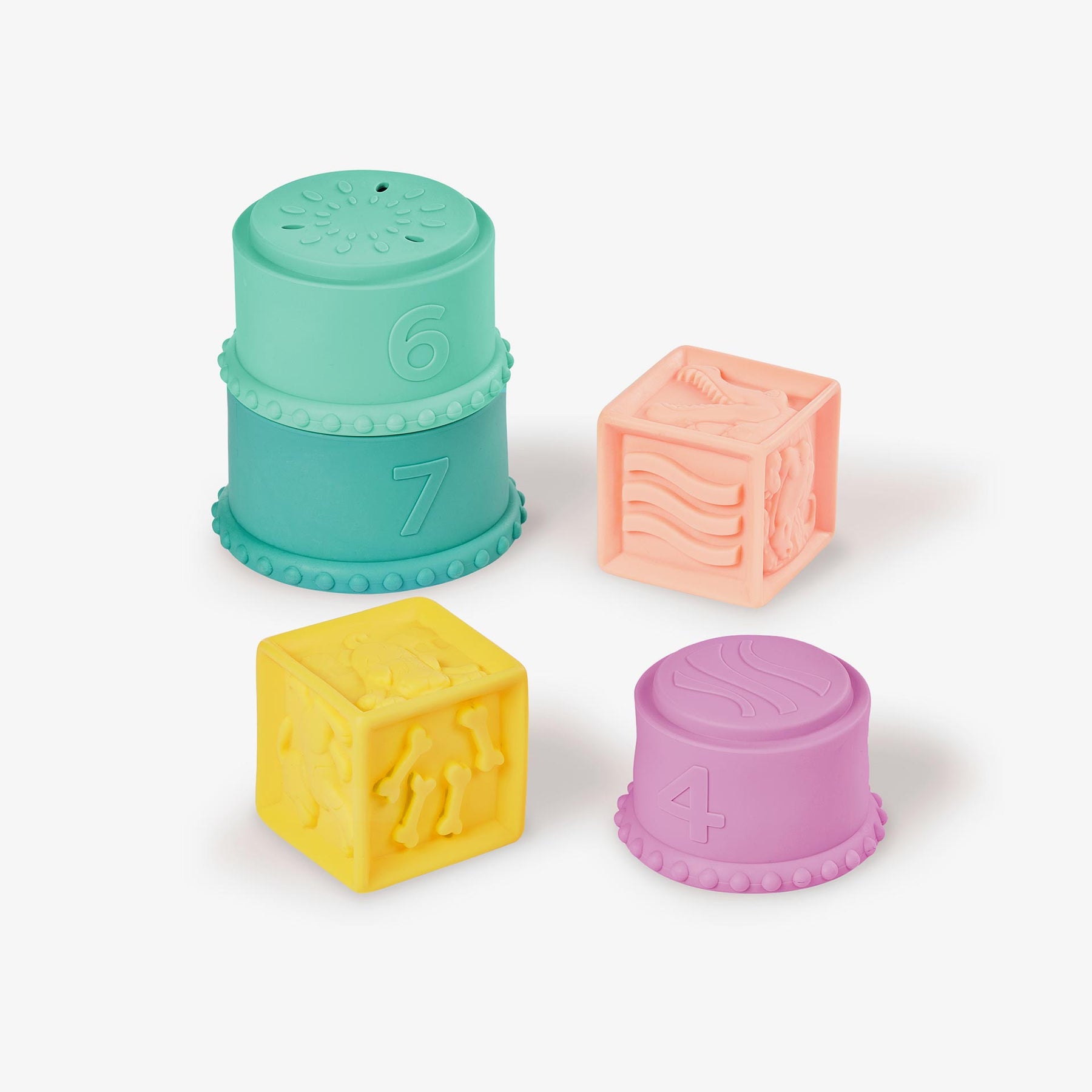 סט משחק רך וחושי עם 17 חלקים בצבעים עדינים . הקוביות בעלות מרקם וכוללות עיצובים עם מספרים צורות וחיות חמודות.הכוסות הרכות משמשות גם כמשחק אמבטיה מהנה בעזרת החורים שבצידן התחתון. המשחק מסייע בשיפור המוטוריקה הגסה והעדינה ומקדם קואורדינציה עין-יד. מתאים לשימוש מגיל 6 חודשים ומלה.