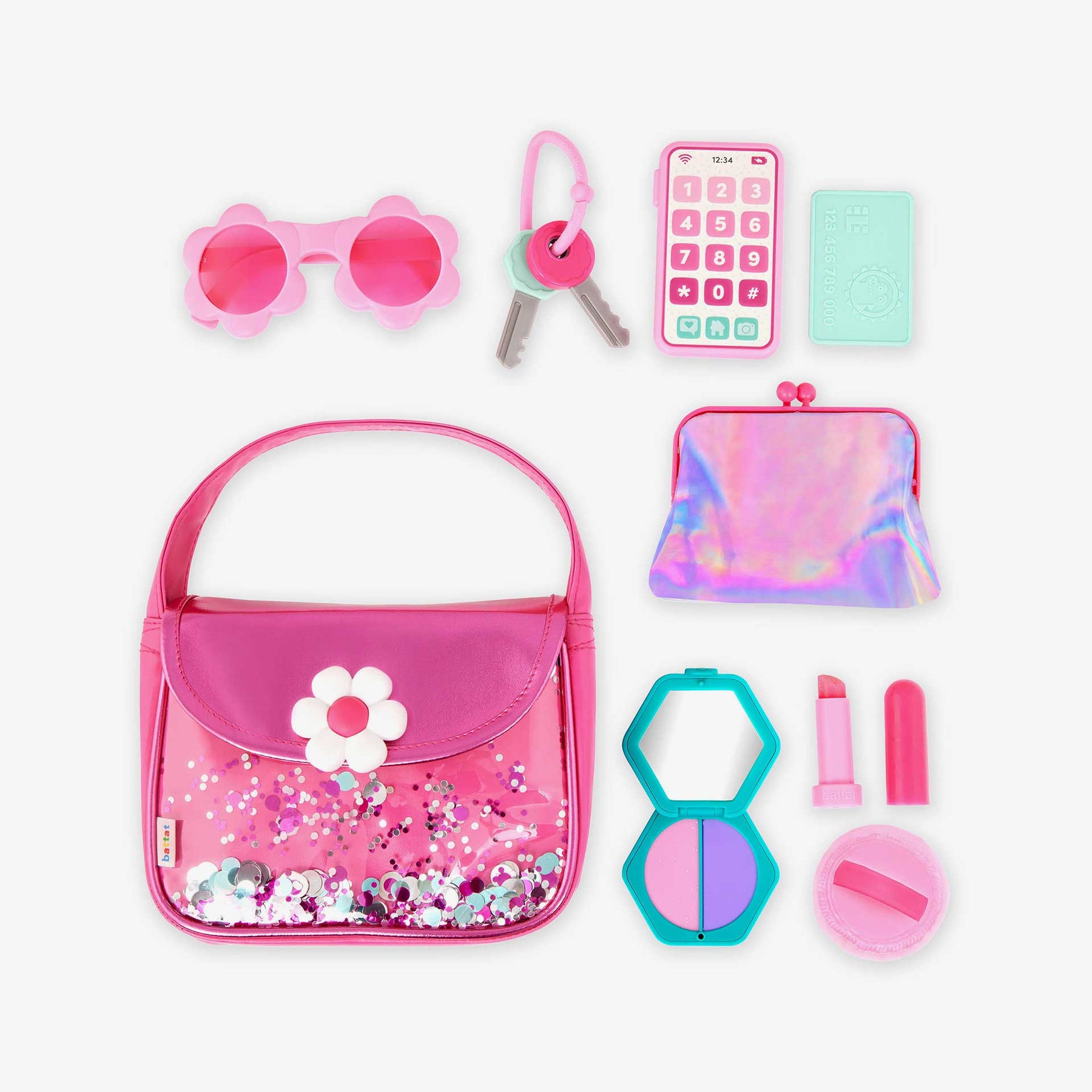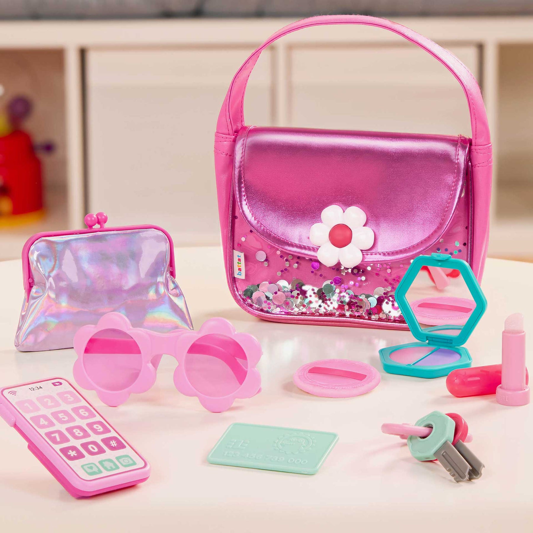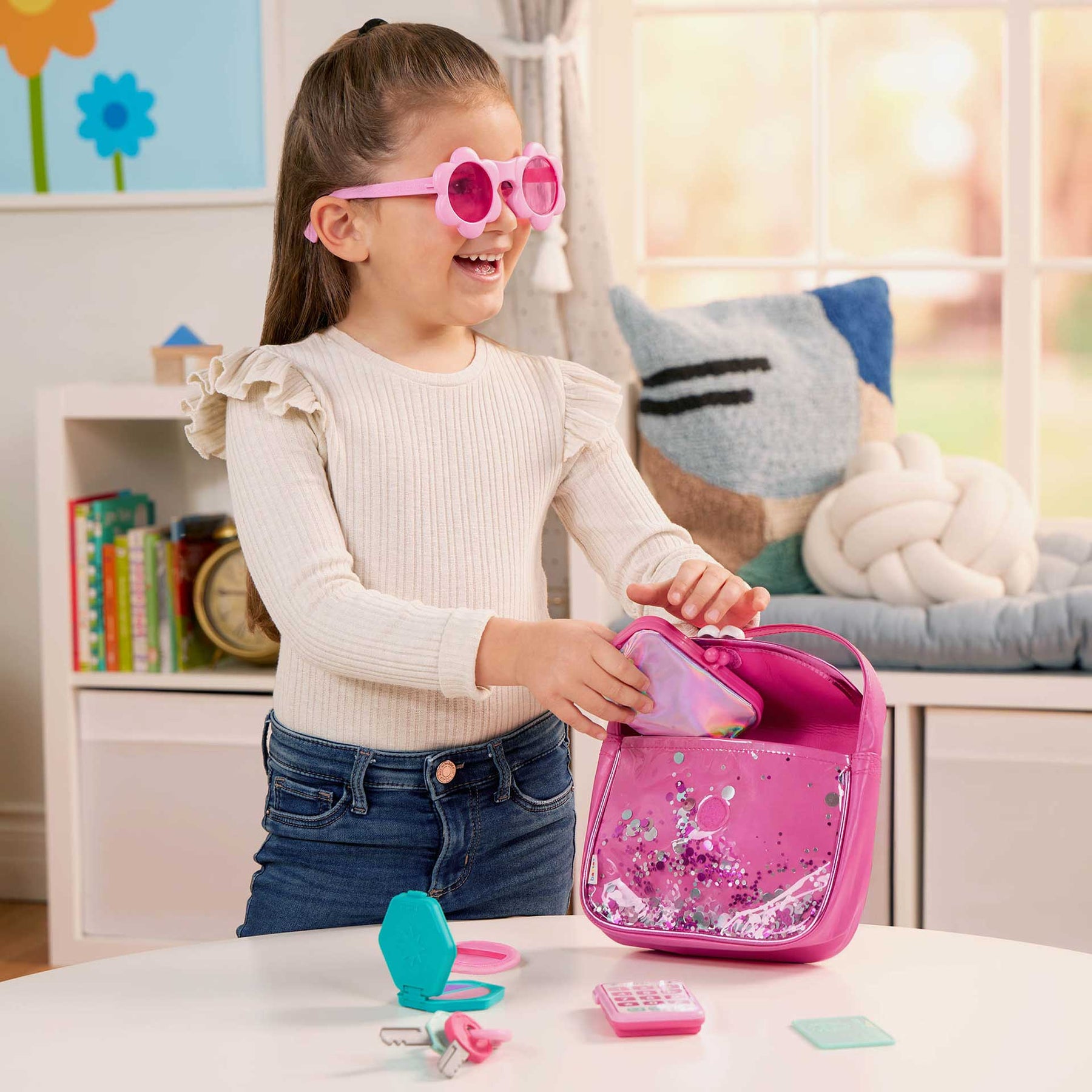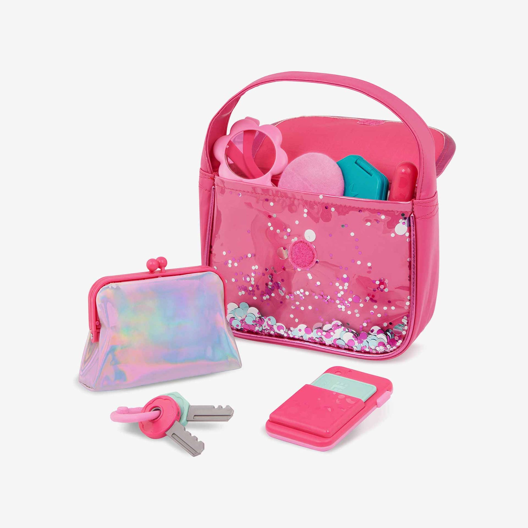 תיק משחק ורוד עם אביזרים . כולל ארנק איפור משחק מפתחות משקפי שמש (ללא הגנת UV לשימוש בתוך הבית בלבד) כרטיס אשראי טלפון משחק.לפיתוח דמיון ומיומנות חברתיות אצל ילדים. מתאים לשימוש מגיל 3 שנים ומעלה.
