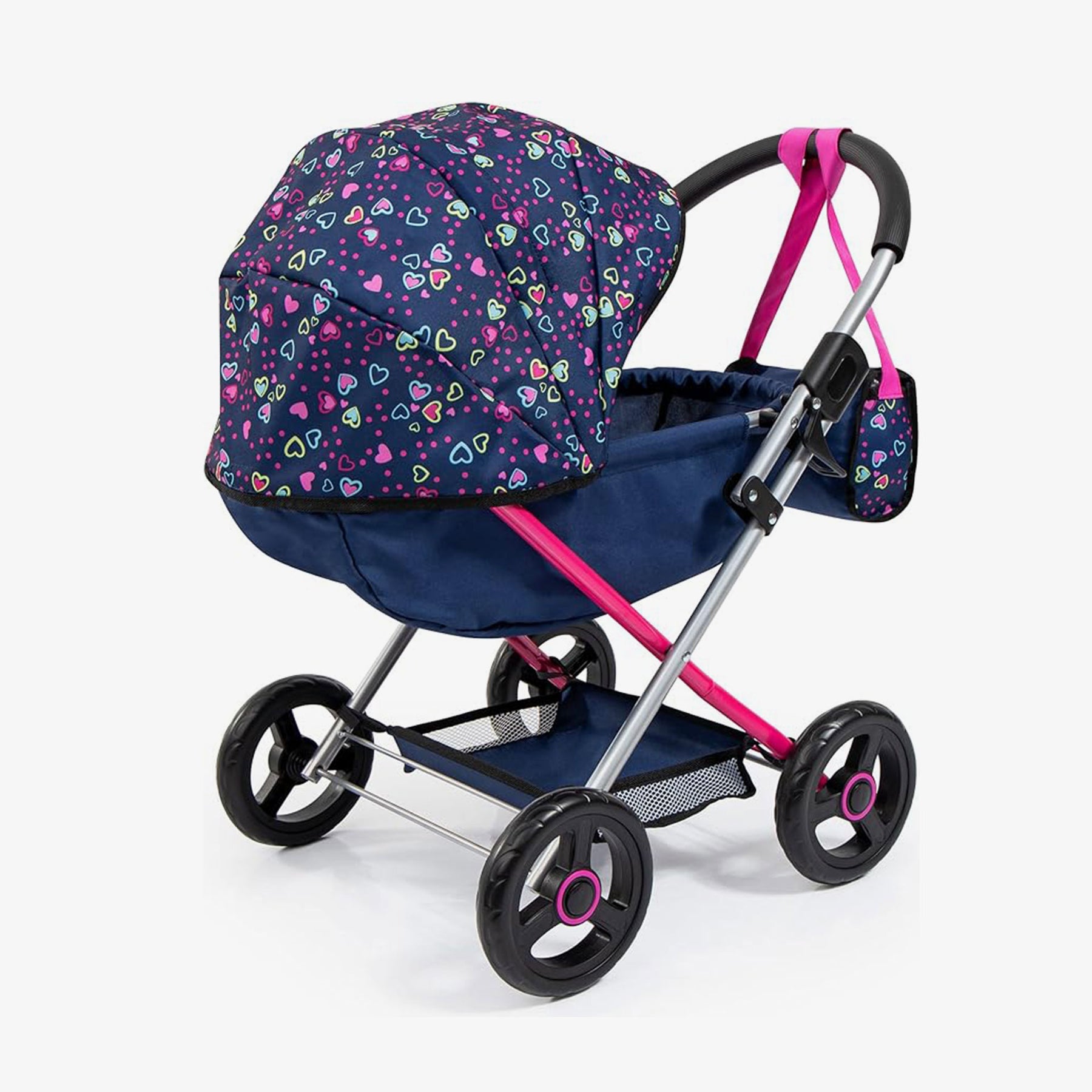 העגלה בעלת ידית מתכווננת וגלגלים גדולים ליציבות מתקפלת בקלות וקלה להרכבה. הסט כולל תיק כתף ושק שינה לבובה .