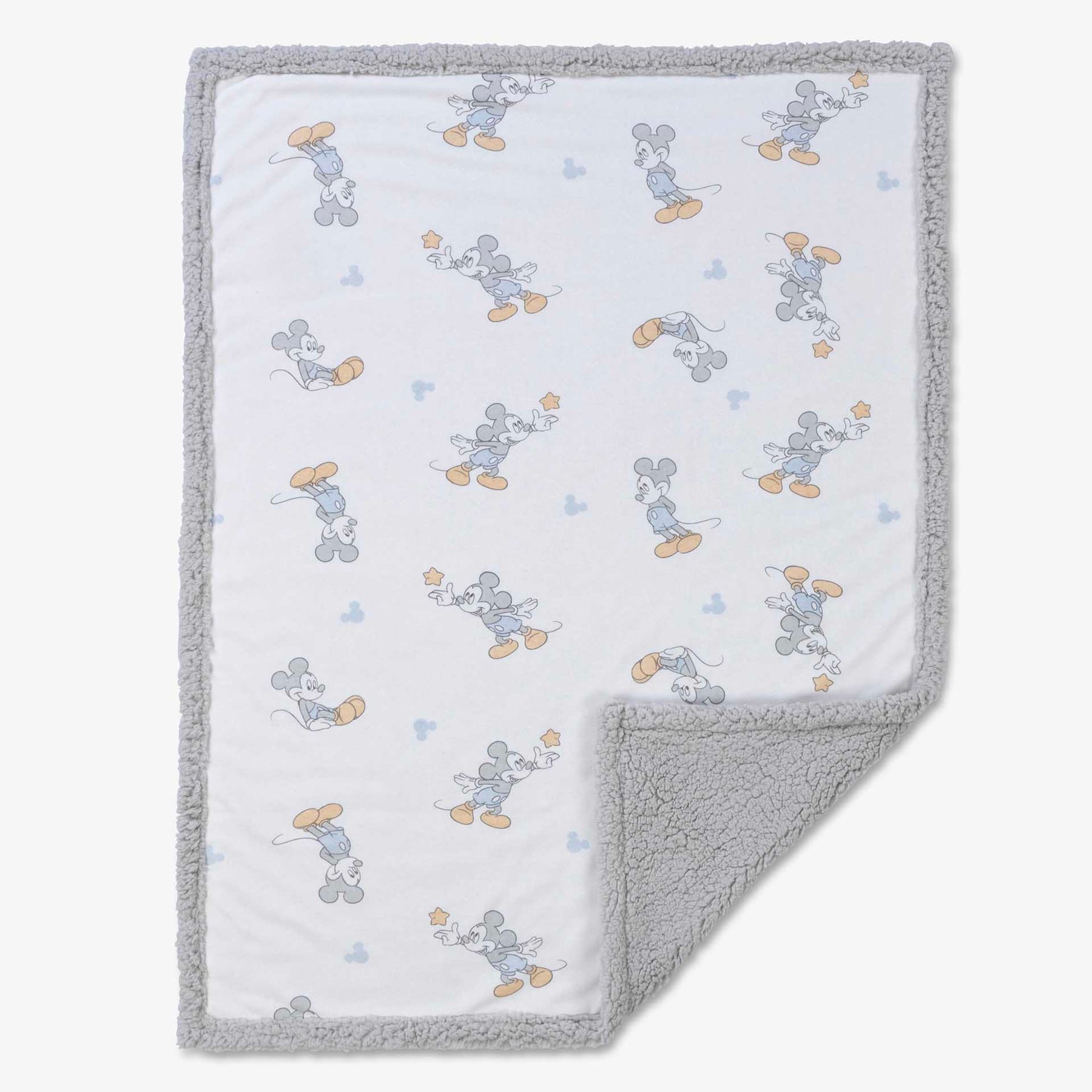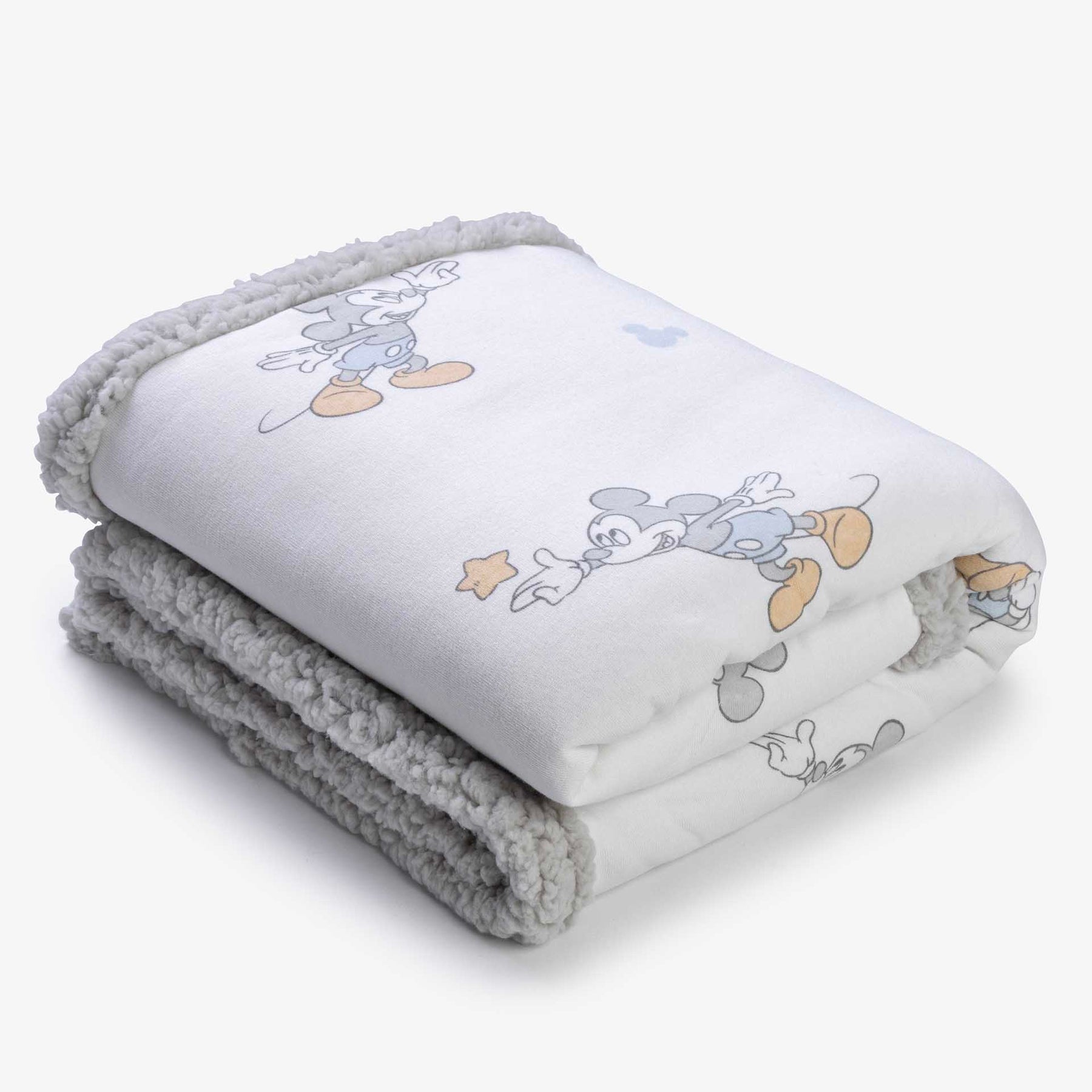 שמיכת פוטר דו- צדדית למיטת התינוק בהדפס מיקי מאוס ופרוות שרפא אפורה. מידה: 90X120 סמ. הרכב הבד: 65% כותנה 35% פוליאסטר/ שרפא 100% פוליאסטר.