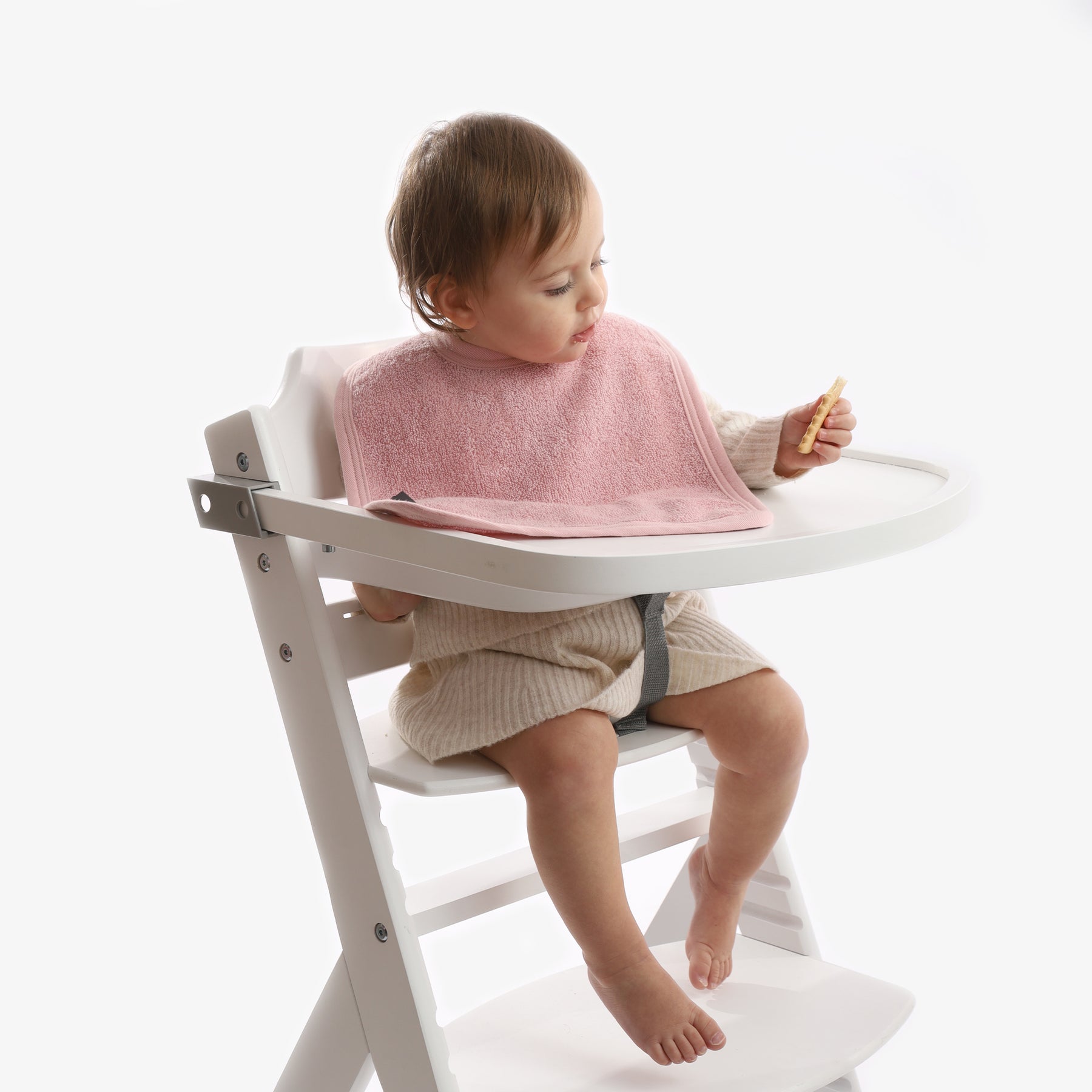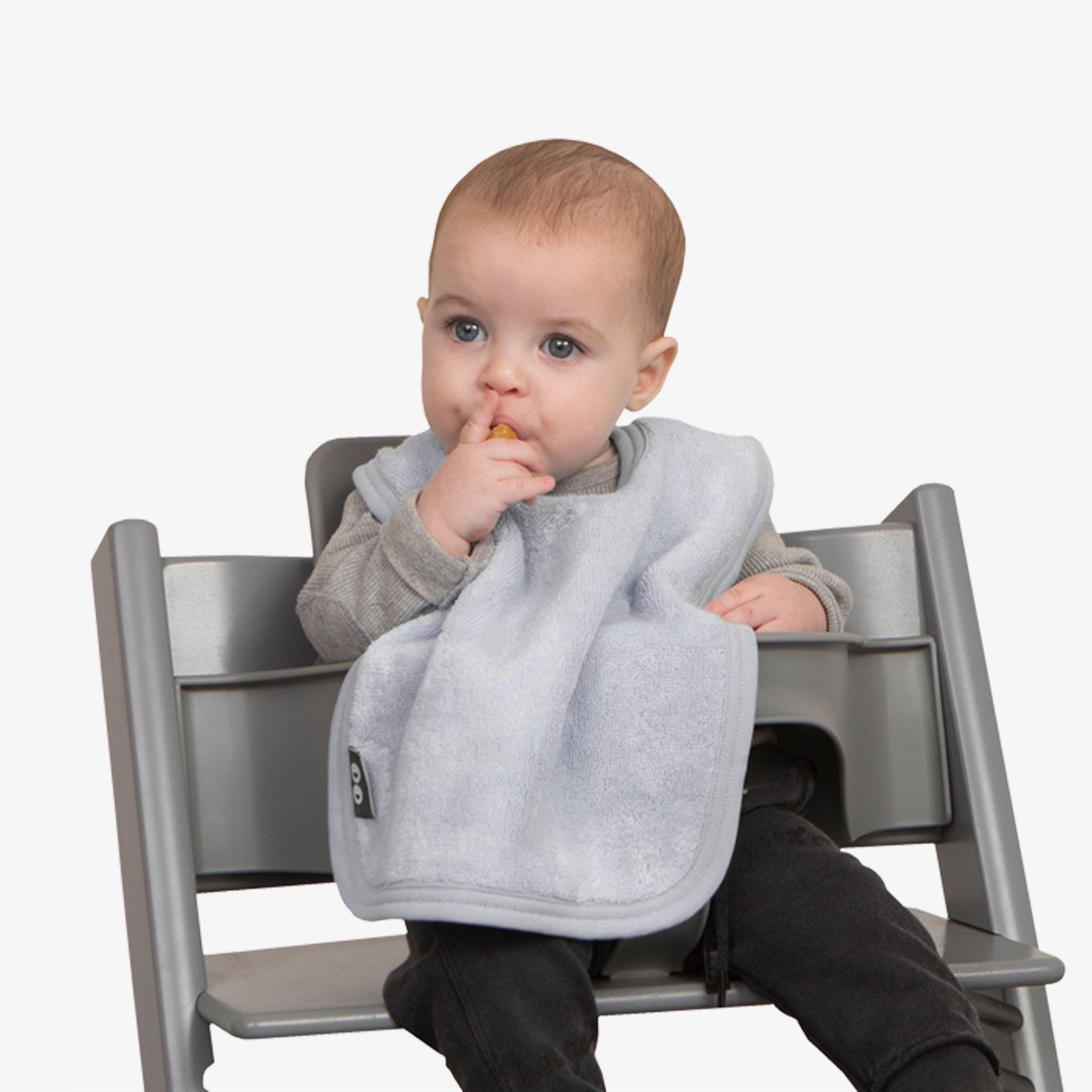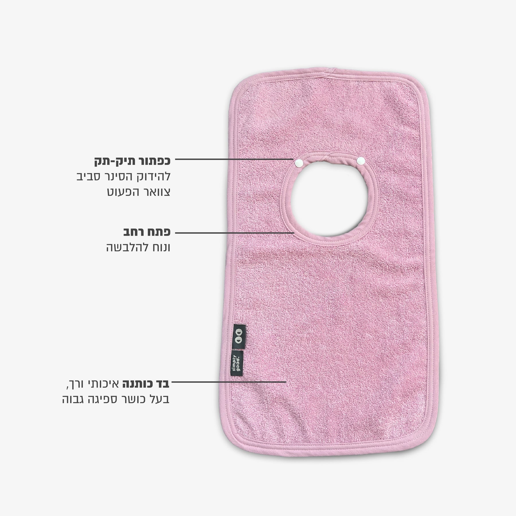 סינר מגבת איכותי בעל כושר ספיגה גבוה ופתח רחב ונוח להלבשה כולל כפתור תיק-תק להידוק הסינר סביב צוואר הפעוט.