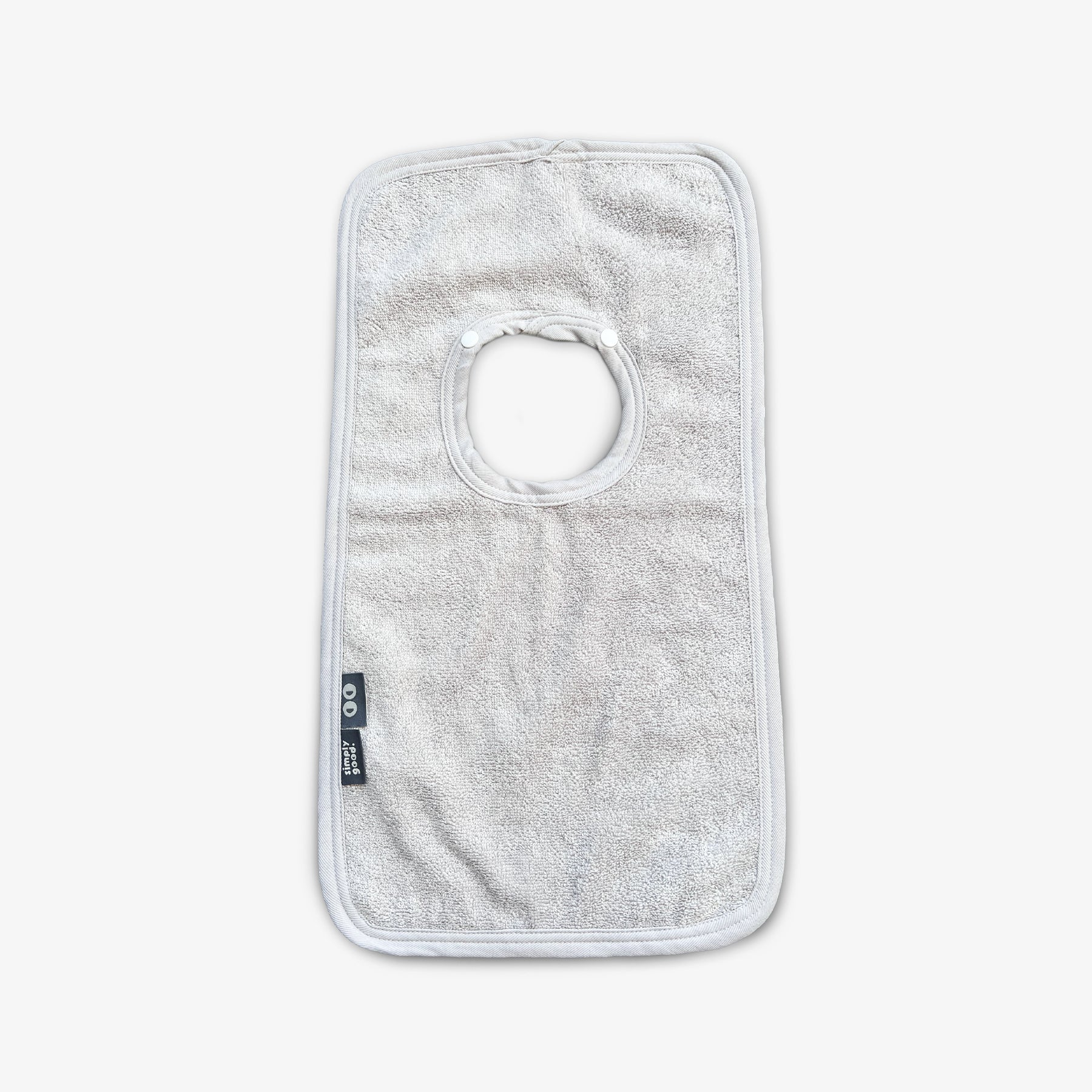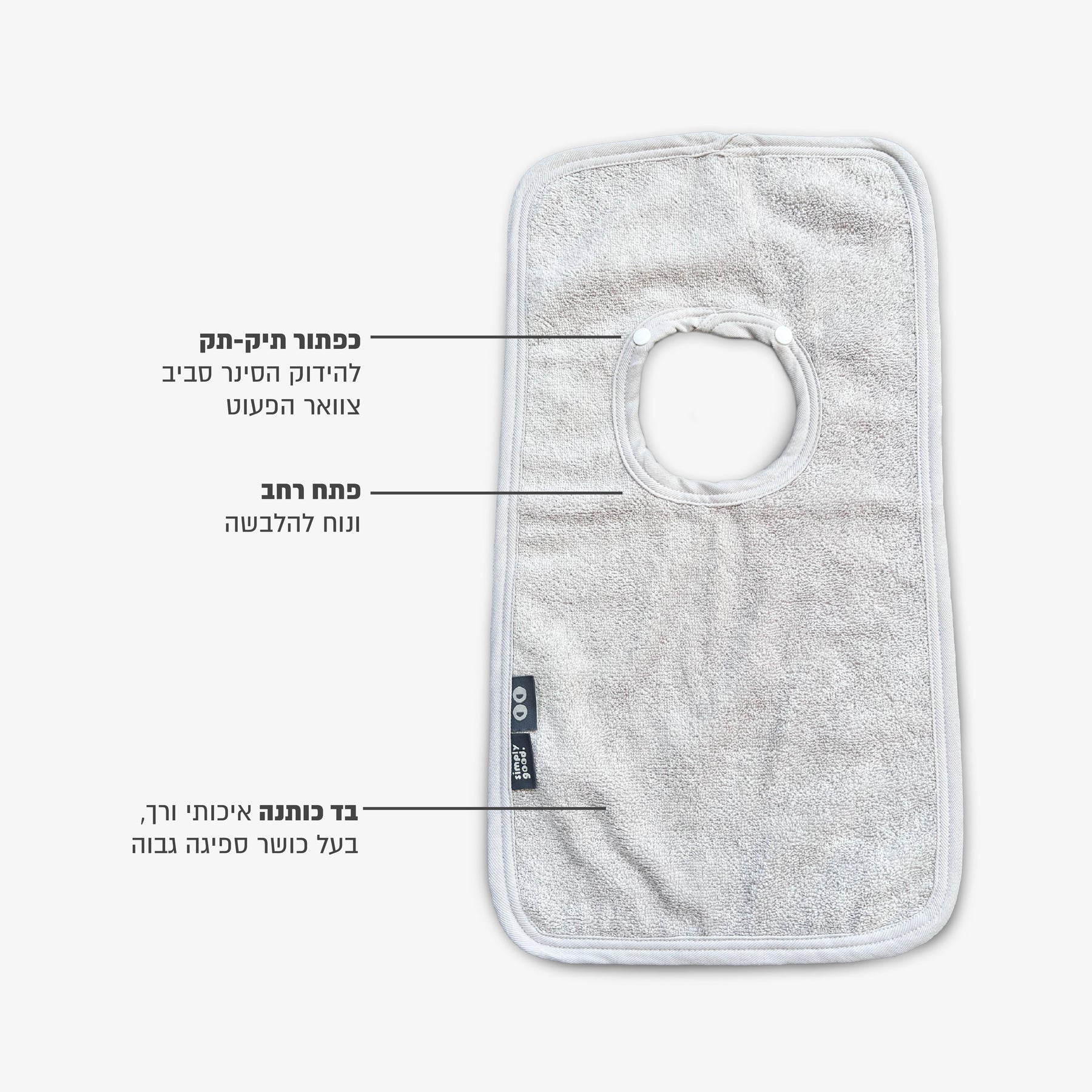 סינר מגבת איכותי בעל כושר ספיגה גבוה ופתח רחב ונוח להלבשה כולל כפתור תיק-תק להידוק הסינר סביב צוואר הפעוט.