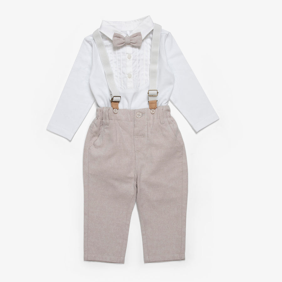 סט ביגוד הכולל מכנסי אוקספורד עם שלייקס בצבע חום מוקה בגד גוף לבן עם צווארון קלאסי ופפיון.
