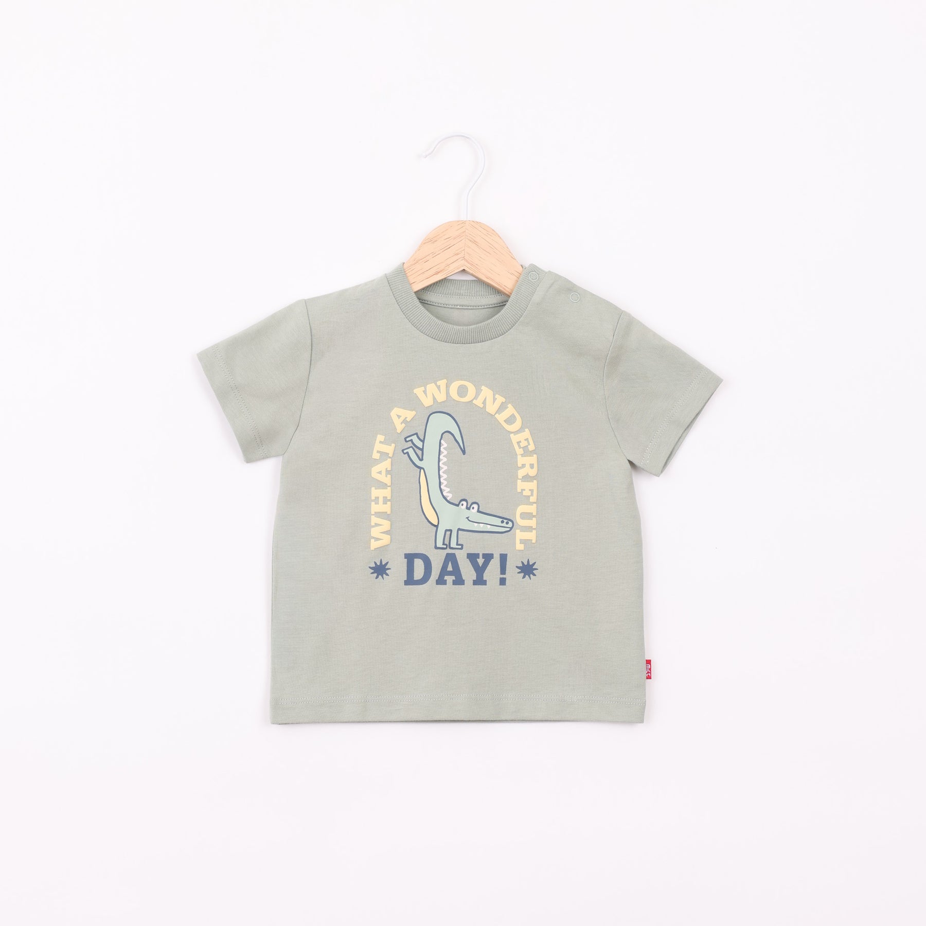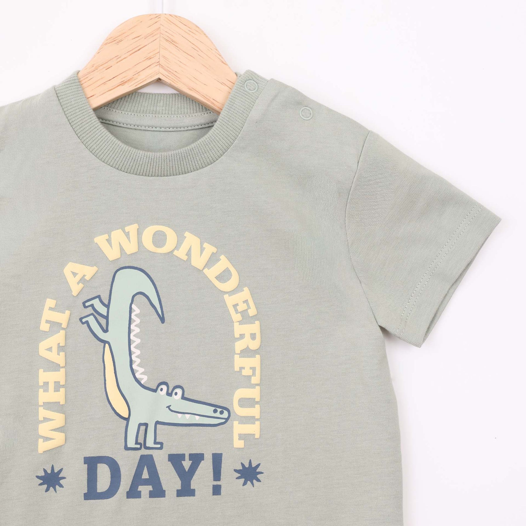 חולצה קצרה ומדליקה בגוון ירוק מרווה עם הדפס תנין חייכני מתוק והכיתוב What A Wonderful Day. עשוייה בד איכותי ונח %100-מ כותנה. עם שני כפתורים לצד הצווארון להלבשה קלה ונוחה. מתאימה במיוחד לימי הקיץ ולכל פעילות.