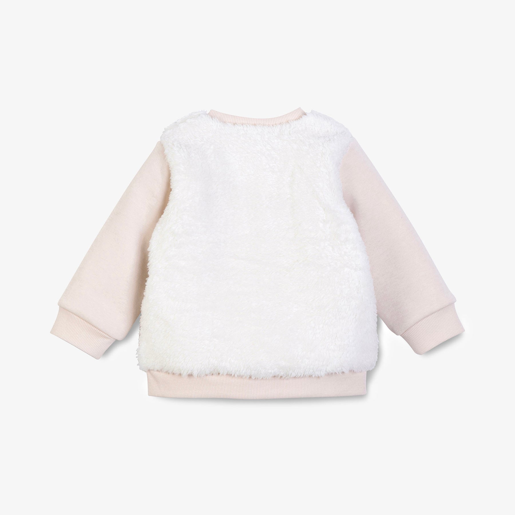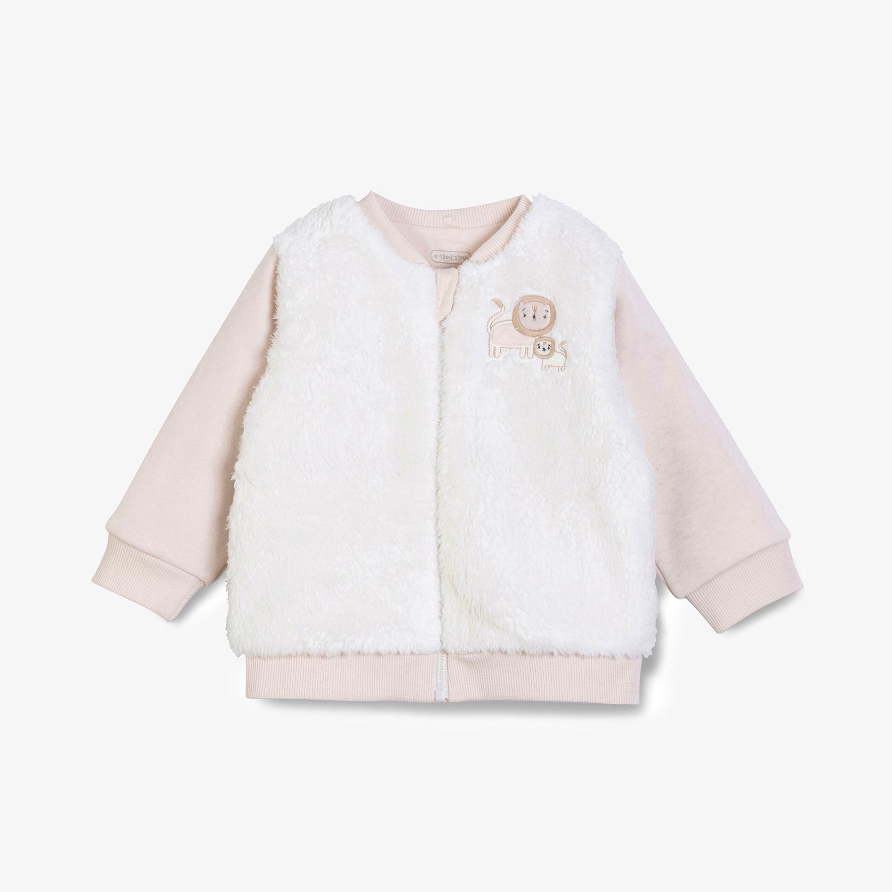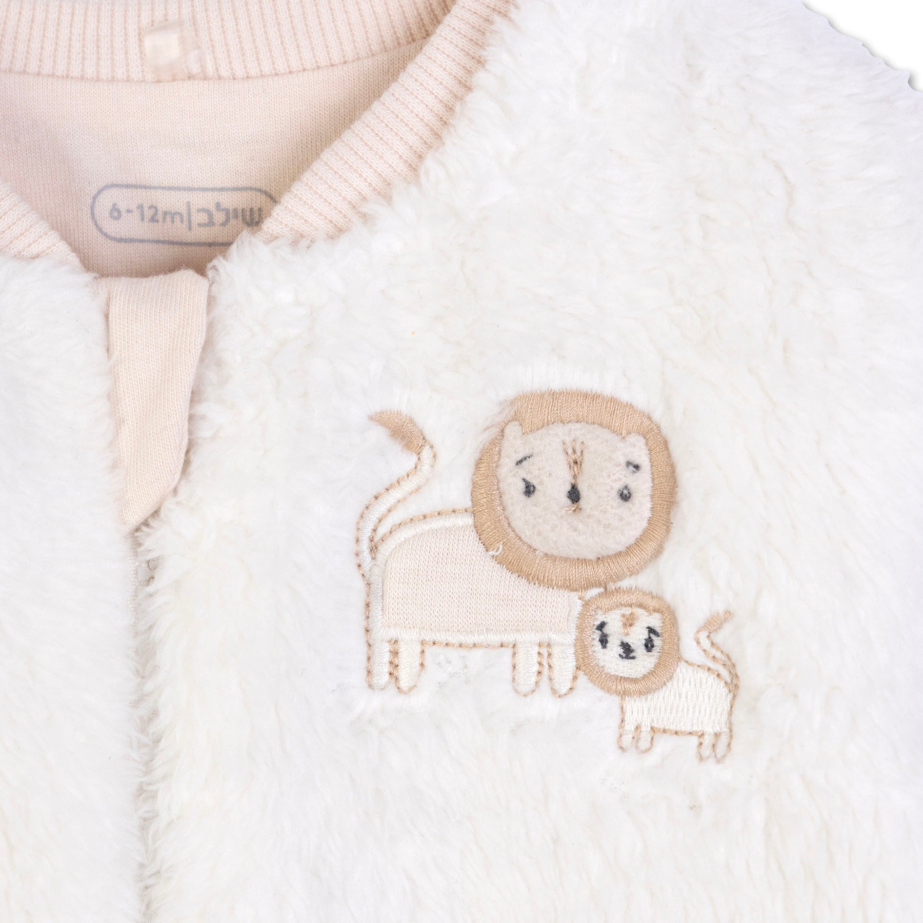 קרדיגן פרוותי בצבע אבן ועם רקמת אריות. לקרדיגן סגירת רוכסן.