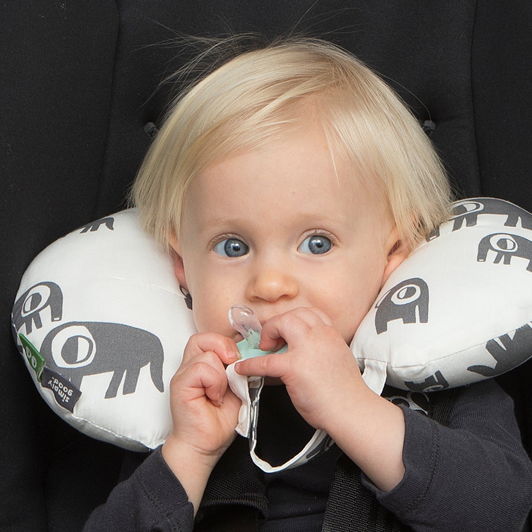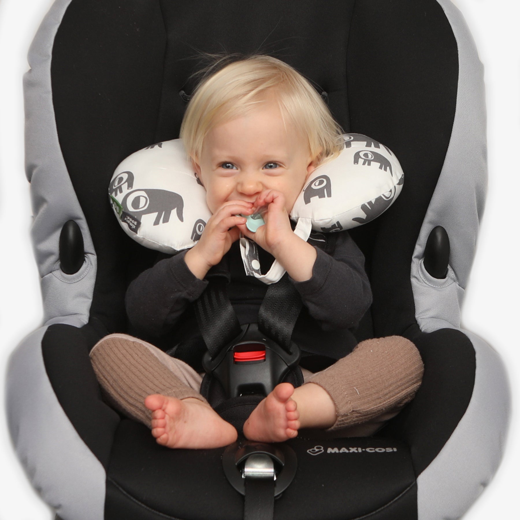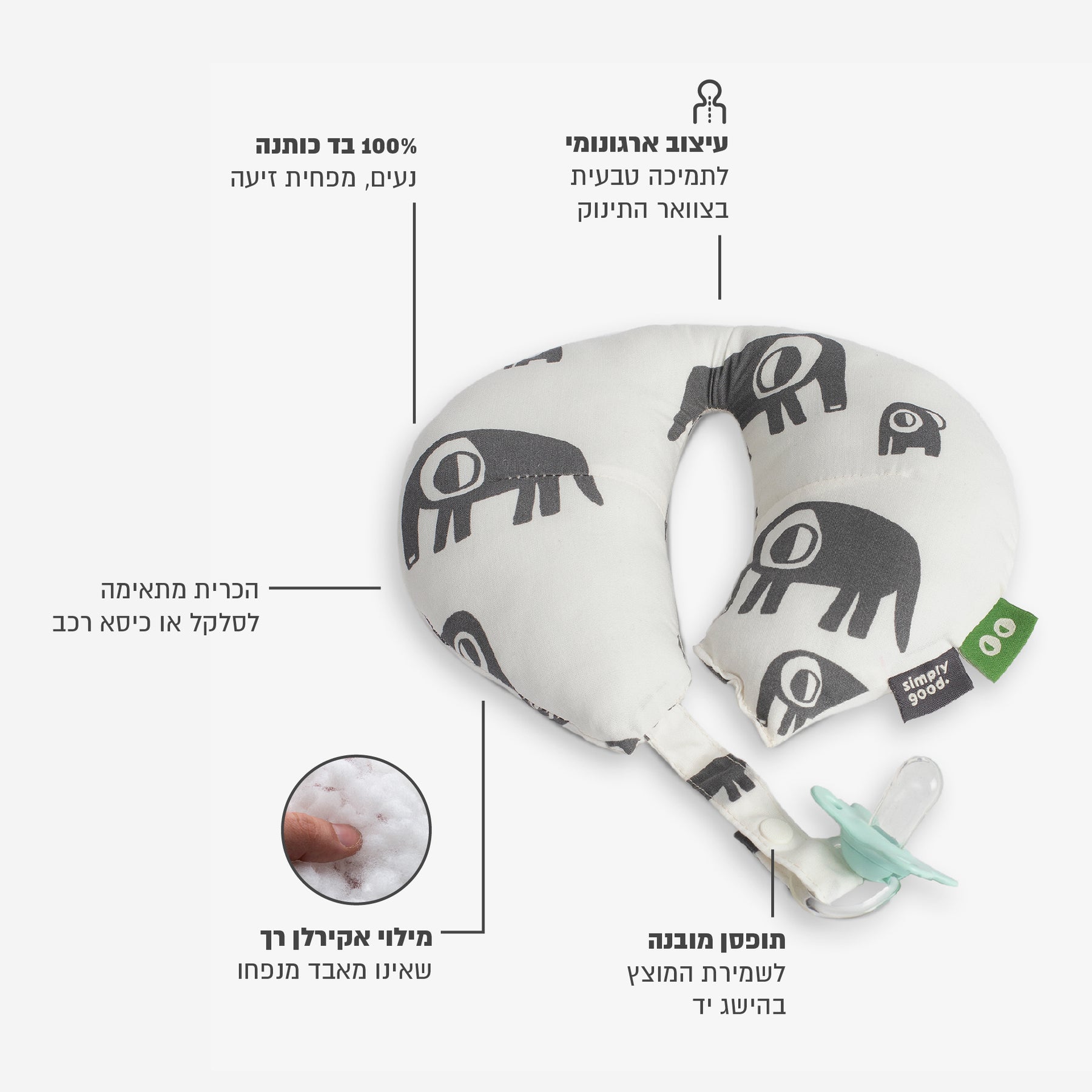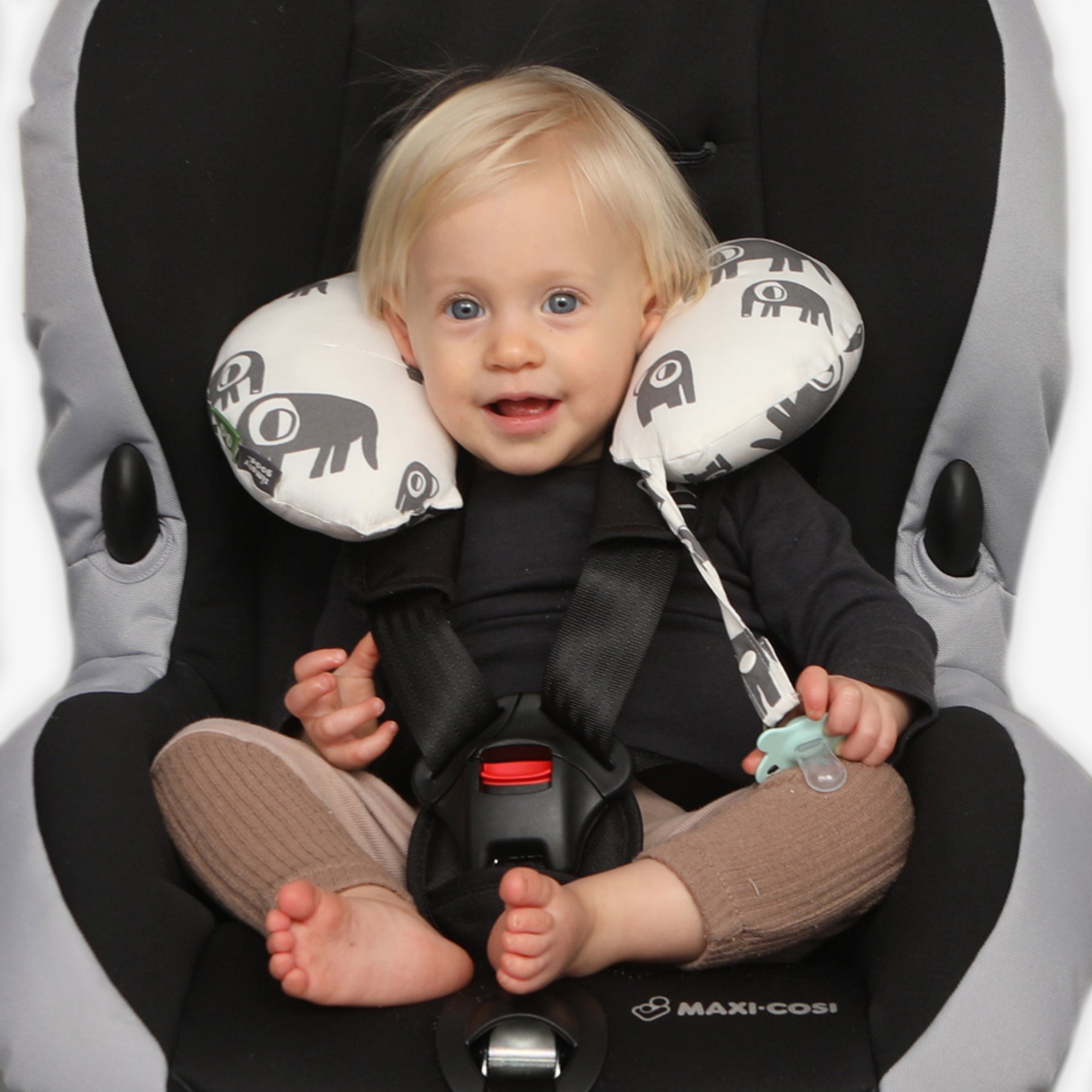 כרית לצוואר השומרת על צוואר התינוק במהלך הנסיעה משלבת תפסן למוצץ כחלק מעיצוב הכרית המאפשר להורה נהיגה בטוחה מבלי לשלוח יד אחורנית על מנת לחפש את המוצץ שהילד הפיל.