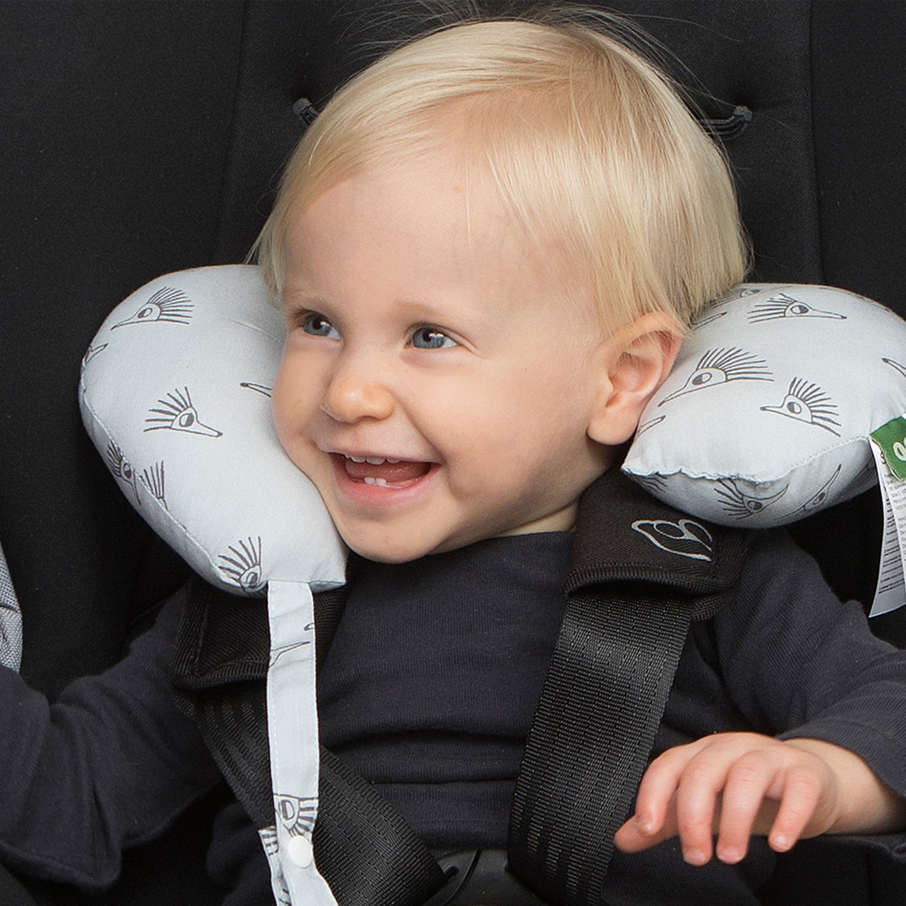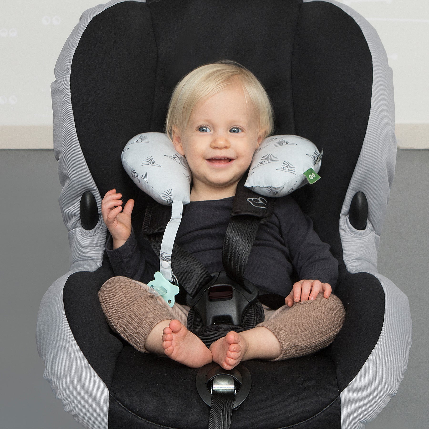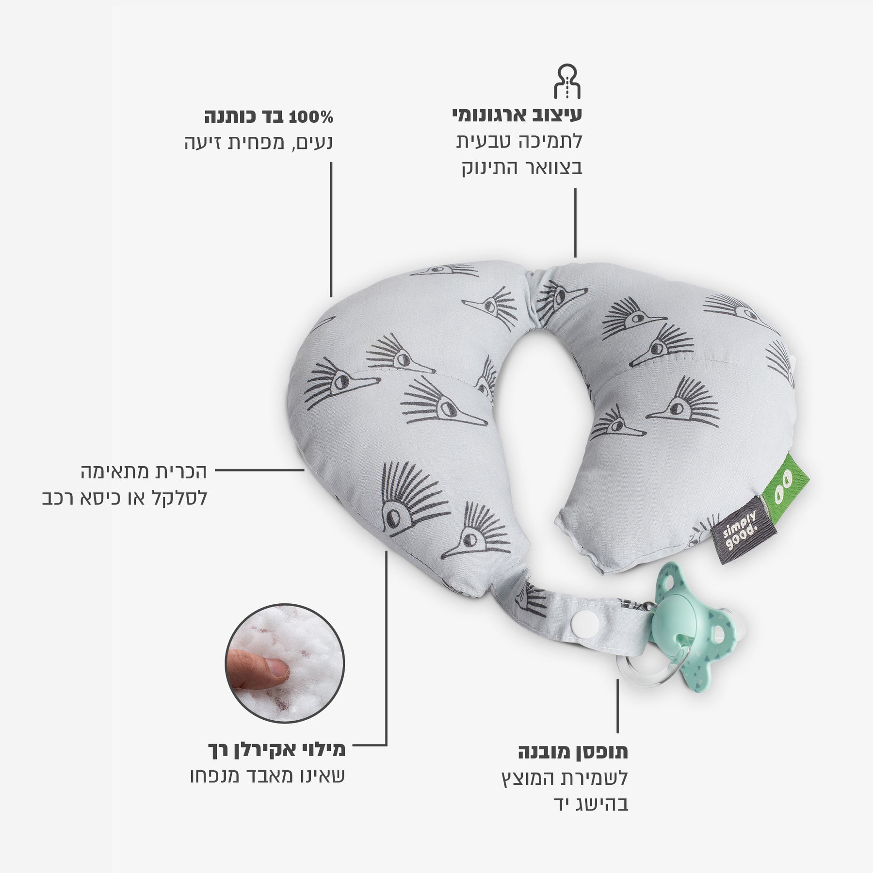 כרית לצוואר השומרת על צוואר התינוק במהלך הנסיעה משלבת תפסן למוצץ כחלק מעיצוב הכרית המאפשר להורה נהיגה בטוחה מבלי לשלוח יד אחורנית על מנת לחפש את המוצץ שהילד הפיל.