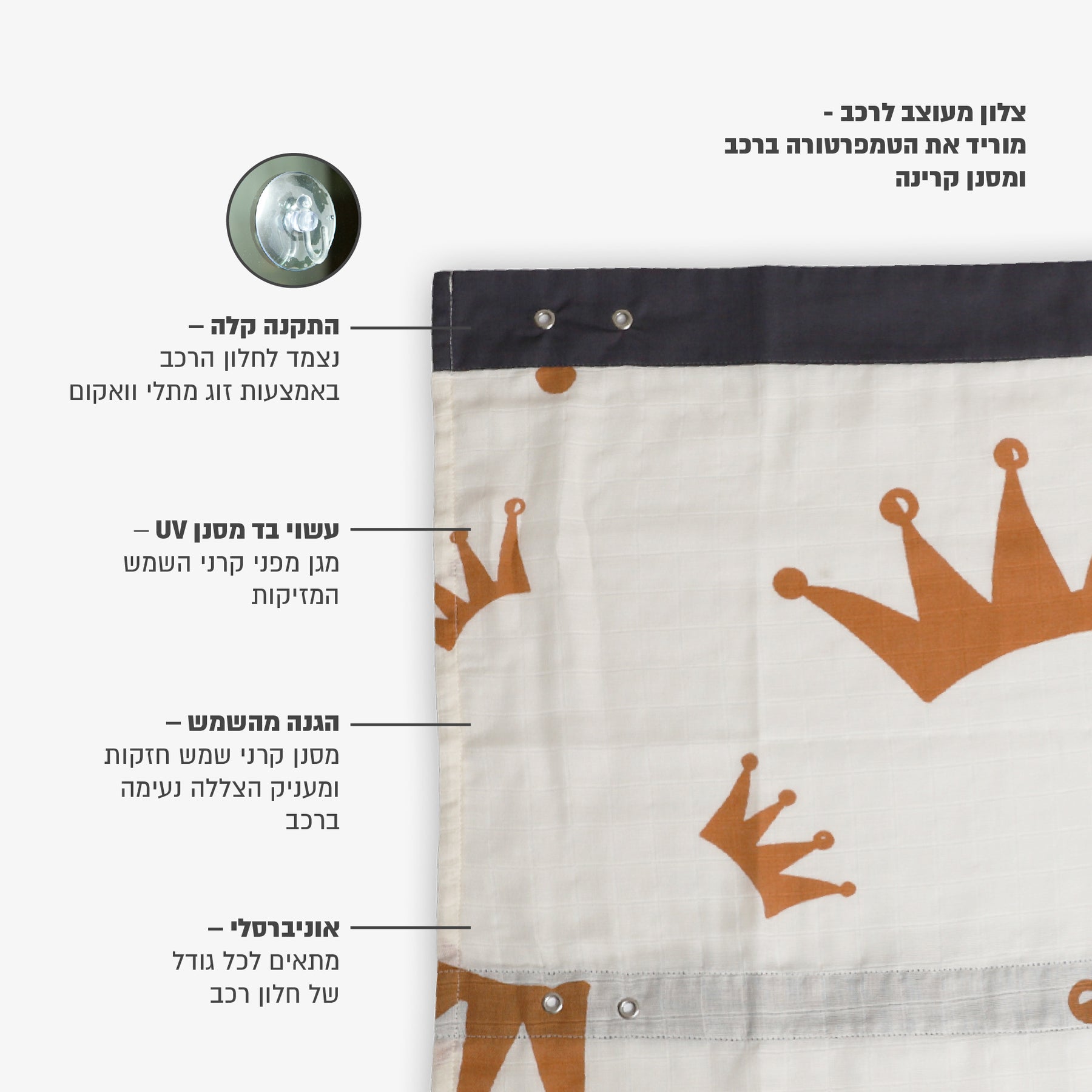 האריזה מכילה צלון וזוג תפסני וואקום.
