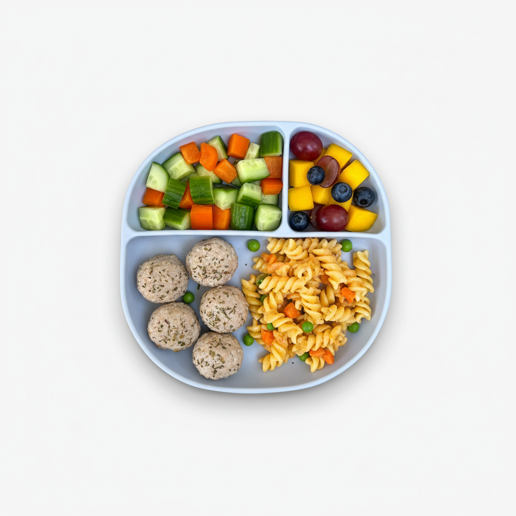 הצלחת מחולקת לשלושה תאים מעודדת את ההורה להגיש סוגים שונים של מאכלים מזינים