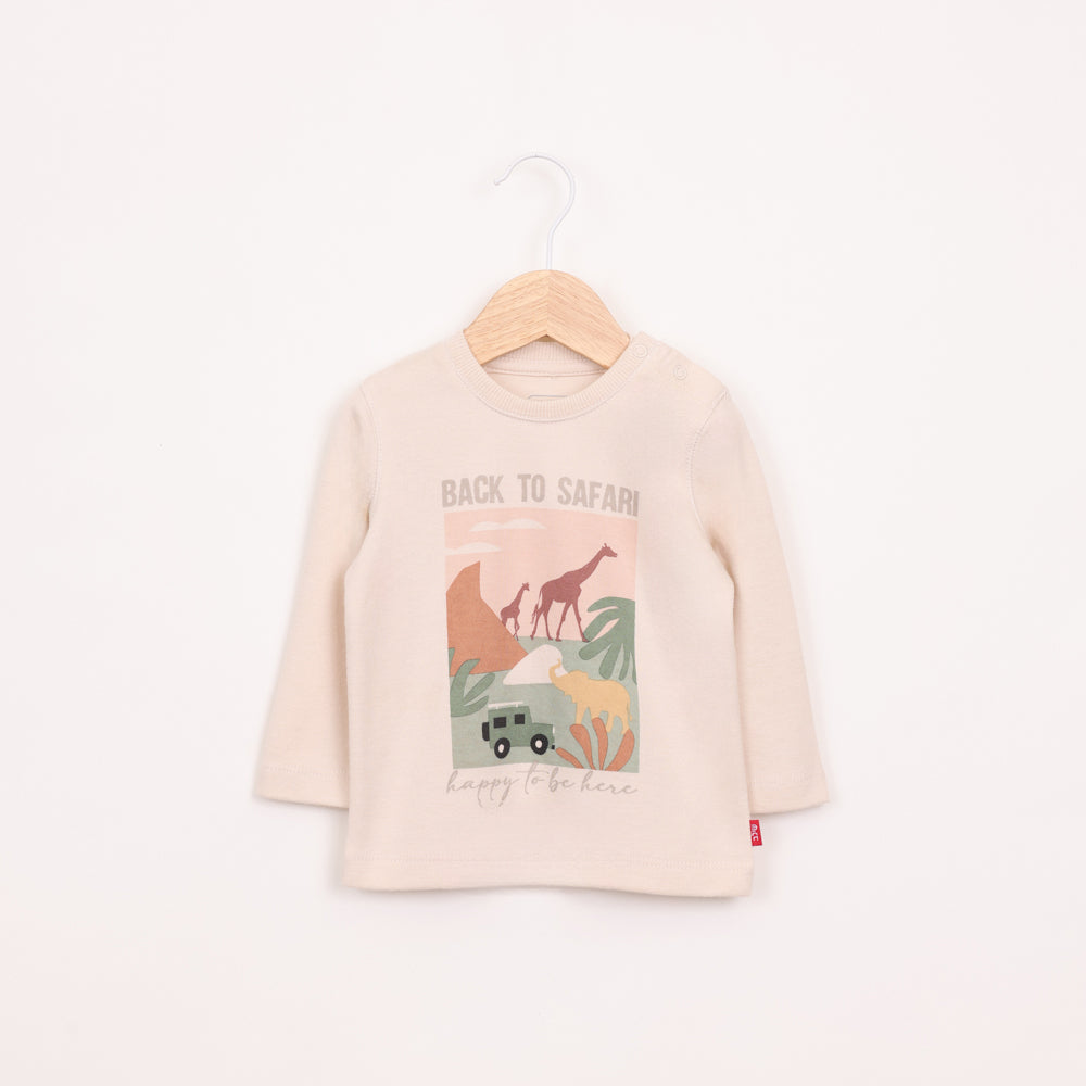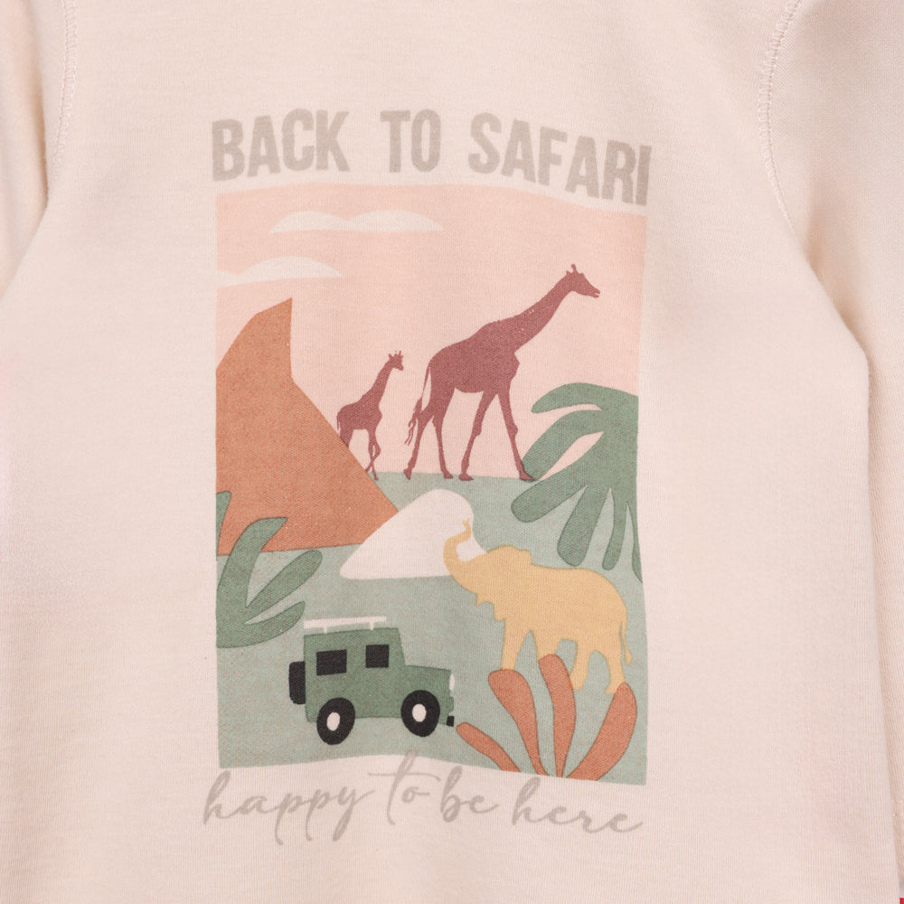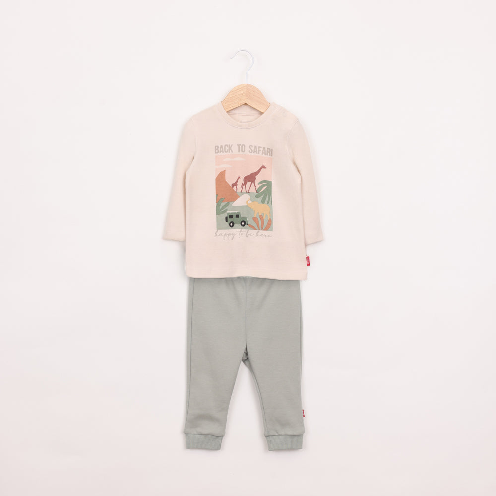 החליפה כוללת חולצה ארוכה בגוון אבן רך עם הדפס ספארי קסום ועדין.