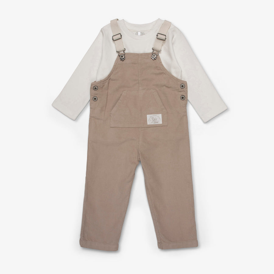 אוברול קורדרוי עדין בצבע חום מוקה וחולצה ארוכה.