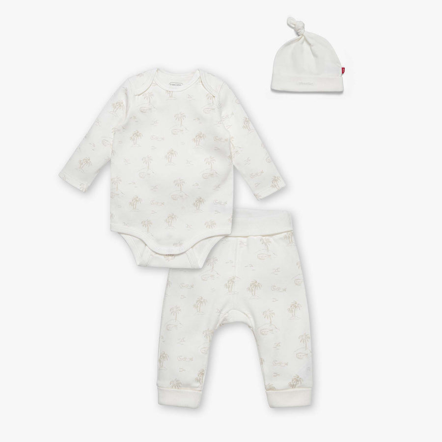 מארז מתנה של ביגוד ראשוני הכולל בגד גוף ארוך מכנסיים וכובע עם קשירה. הביגוד שמנת ועם הדפס של עצי דקל וחיות המים.