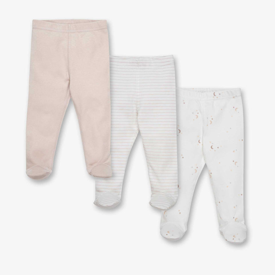 מארז ביגוד ראשוני כולל 3 מכנסי רגליות. המכנסיים בהדפסים שונים של פסים וירח וכוכבים.