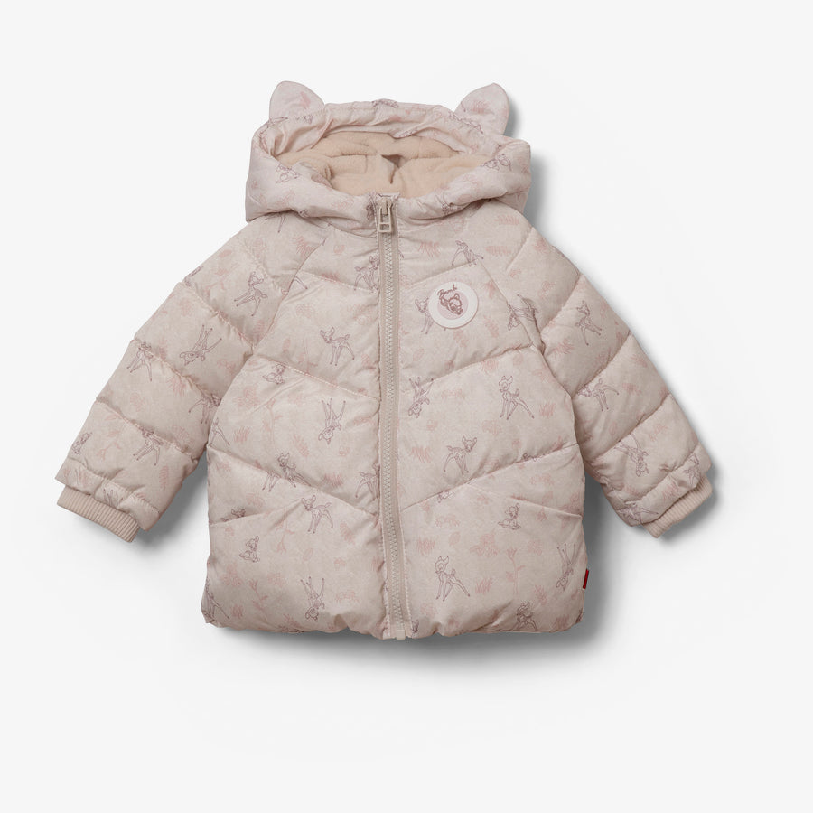 מעיל פאפר מרופד עם כובע קפוצ'ון ואוזניים מתוקות. המעיל בהדפס במבי נסיך היער.