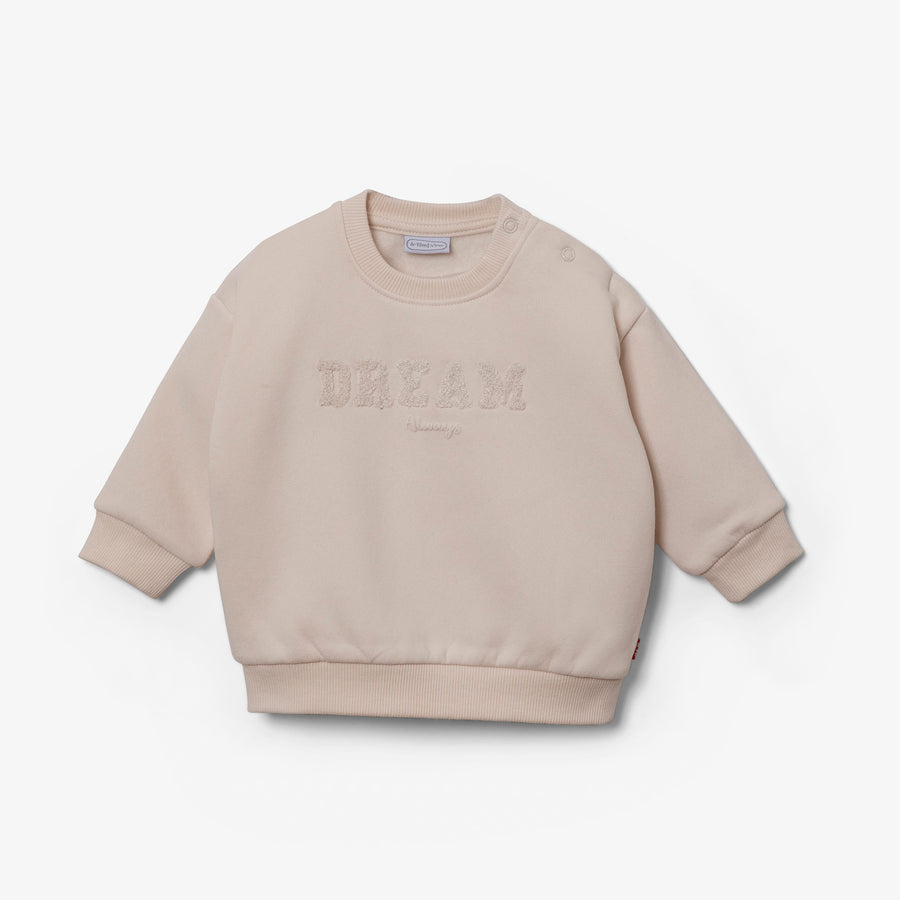 סוויטשירט אופנתי עם כיתוב פרוותי בחזית. הסוויטשירט בצבע אבן.