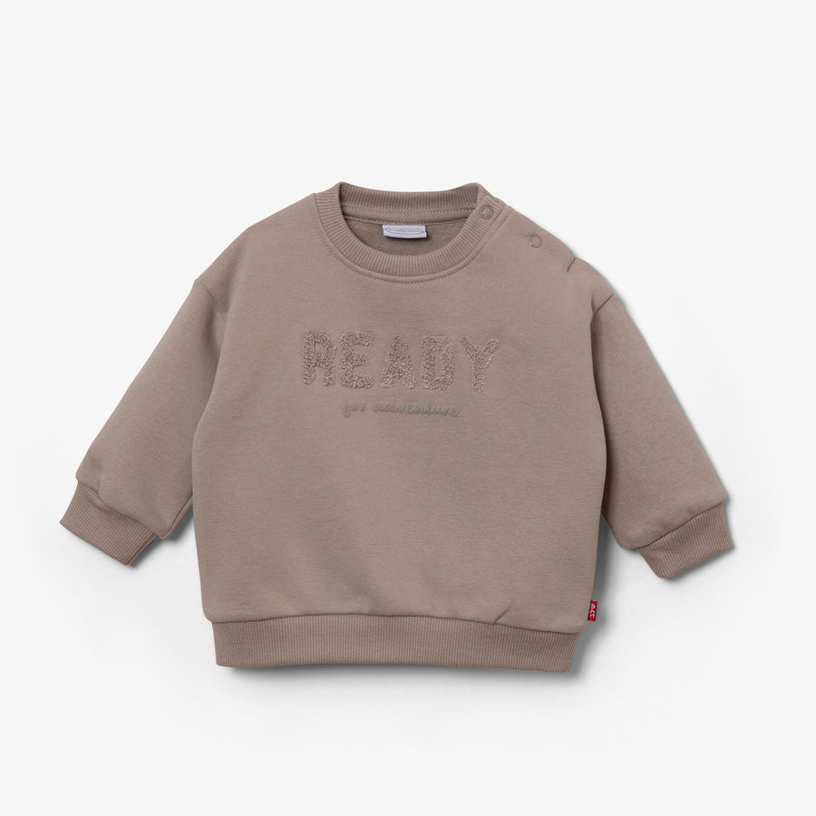 סוויטשירט אופנתי עם כיתוב פרוותי בחזית. הסוויטשירט בצבע חום מוקה.