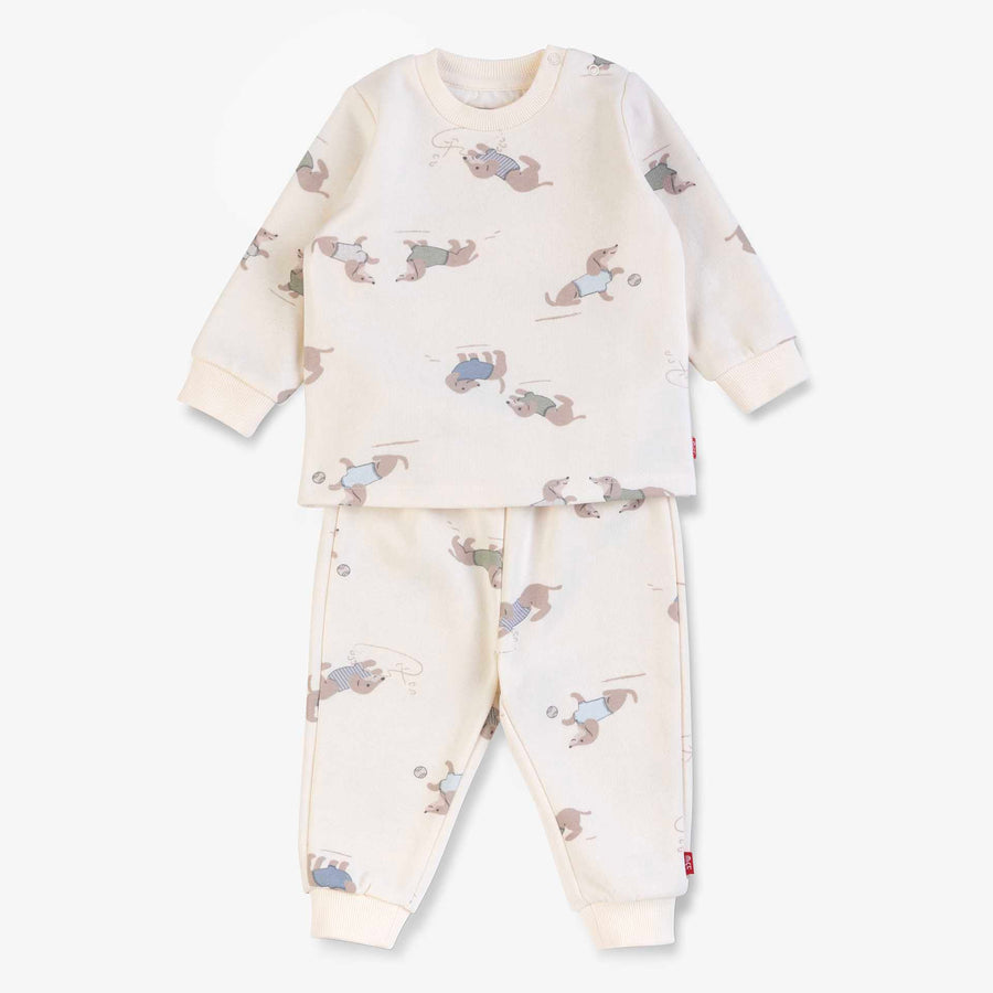 פיג'מה חורפית הכוללת סט 2 חלקים ארוכים בצבע חלב ובהדפס מתוק של כלבים.