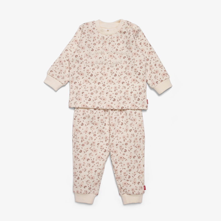 פיג'מה חורפית הכוללת סט 2 חלקים ארוכים בצבע חלב ובהדפס פרחוני.