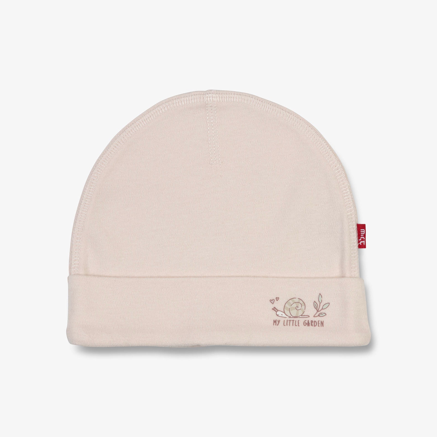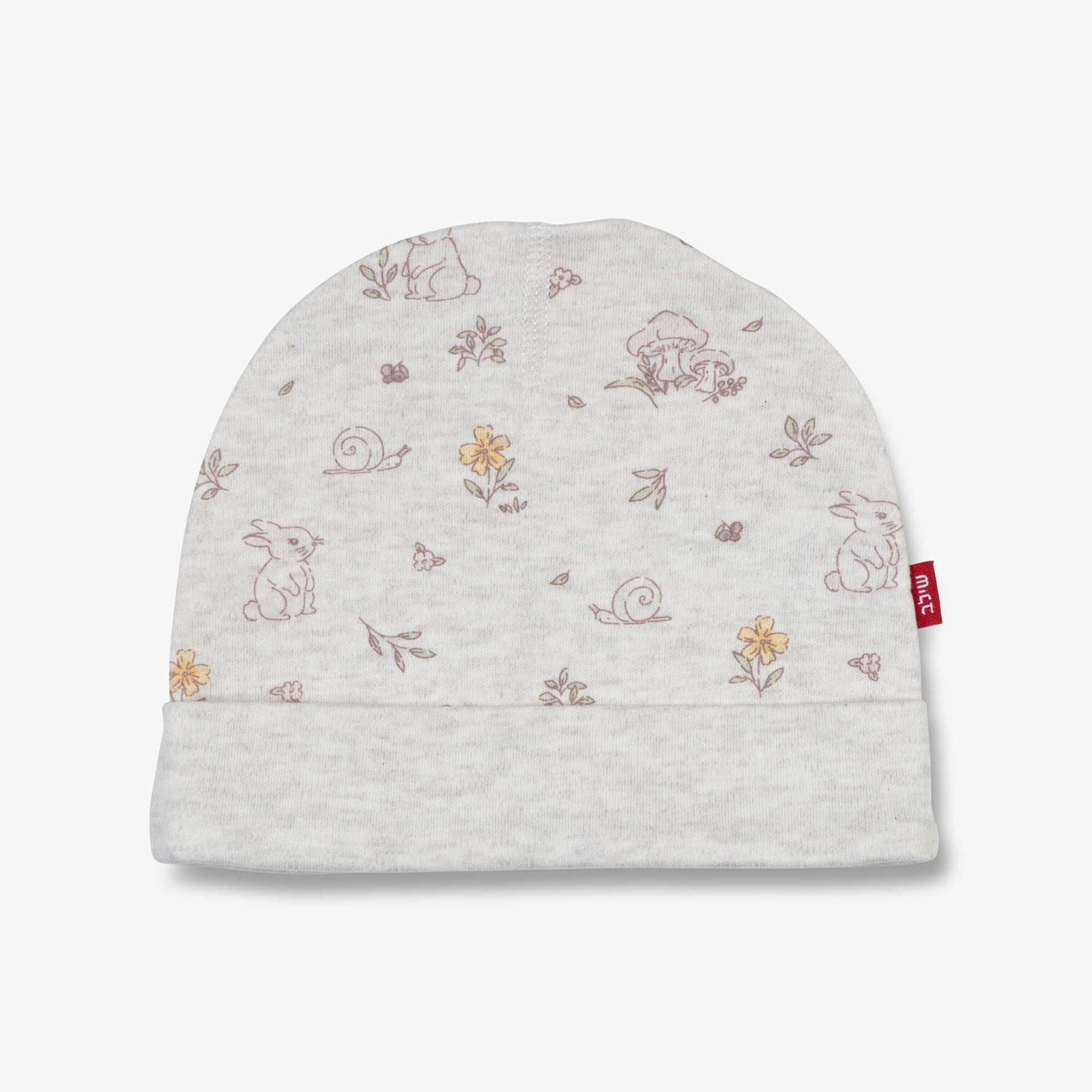 מארז 2 כובעים ראשוניים בצבעים אפור בהיר ואפרסק בהדפסים שונים של ארנבים וחלזונות.