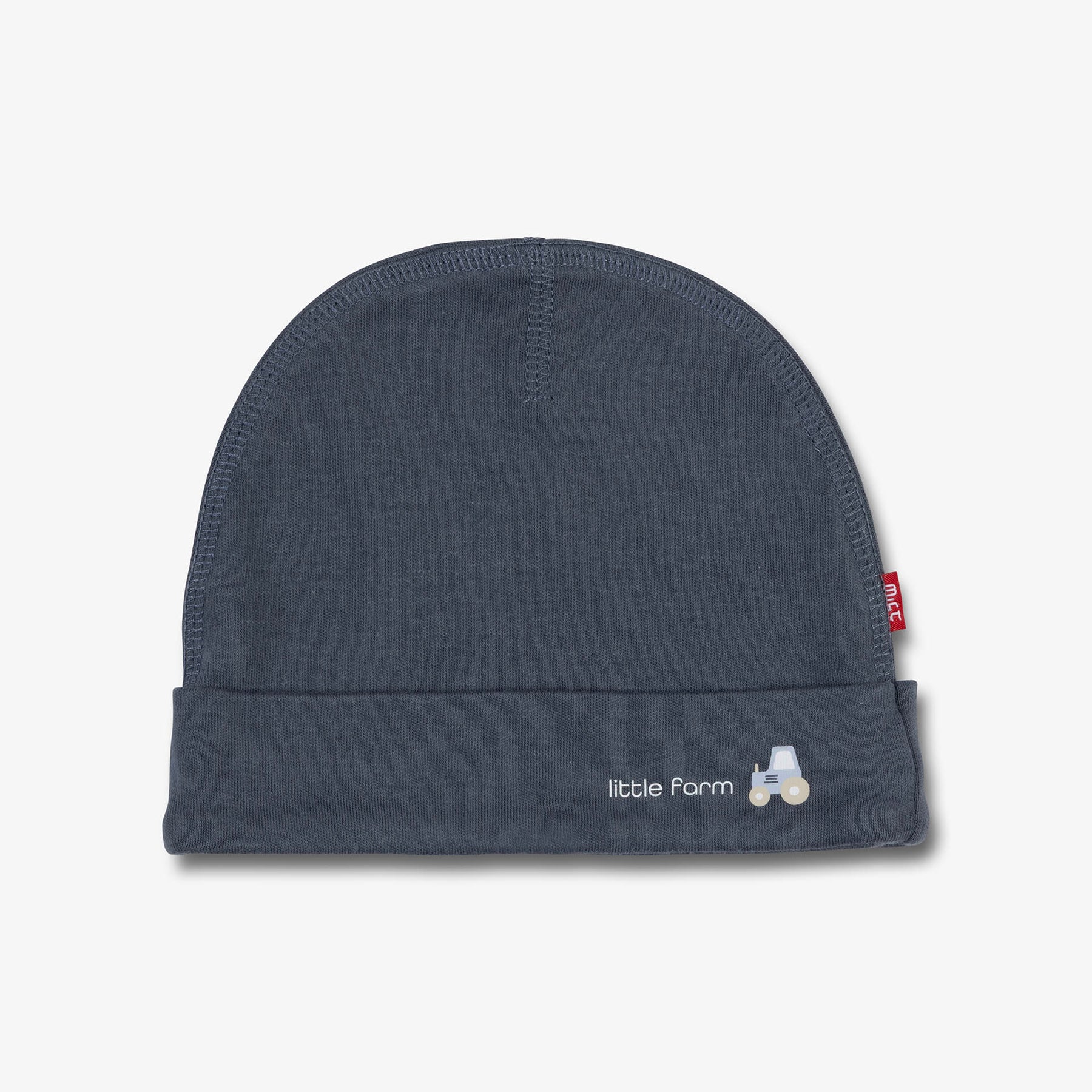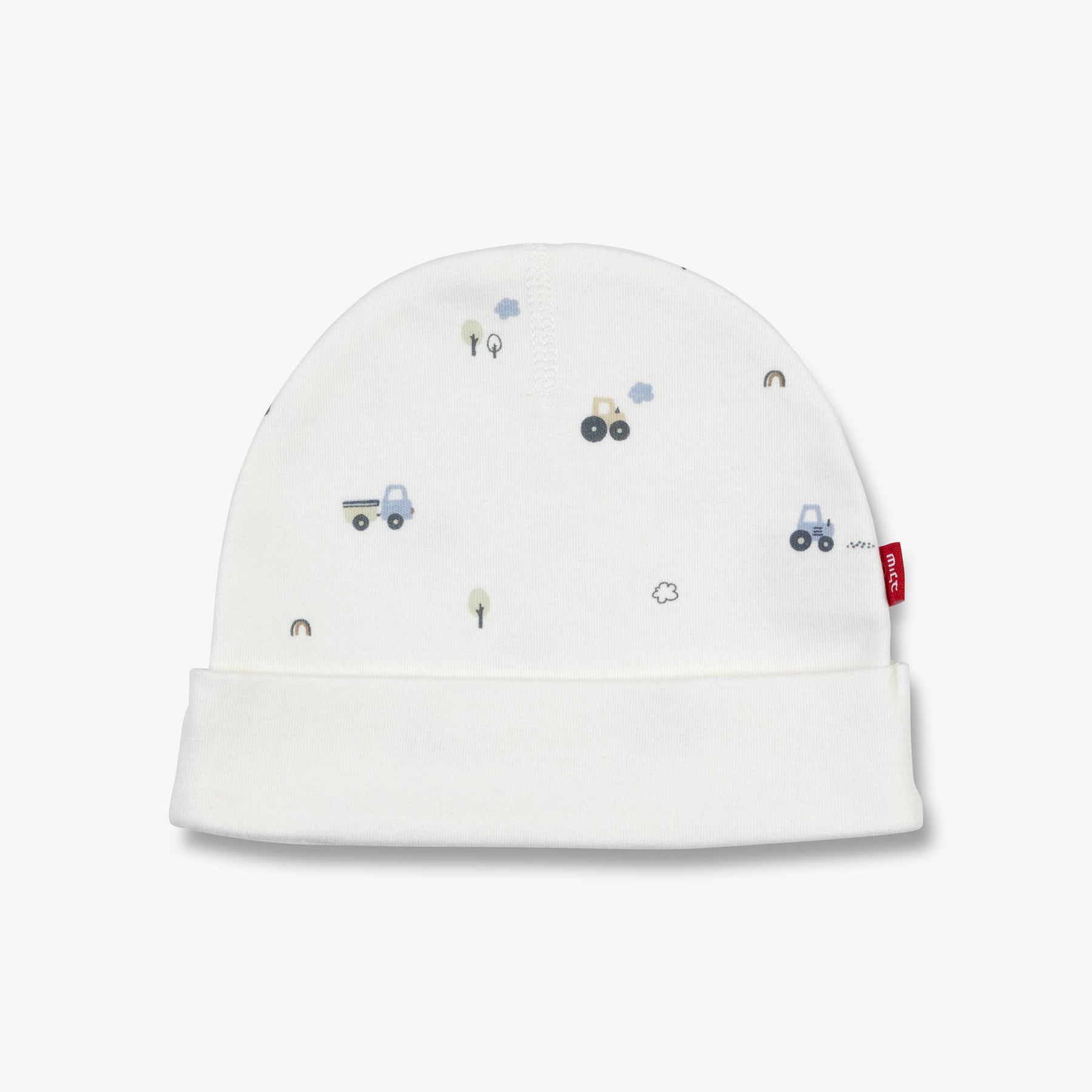 מארז 2 כובעים ראשוניים בצבעים שמנת וכחול לילה בהדפסים שונים של טרקטורים.