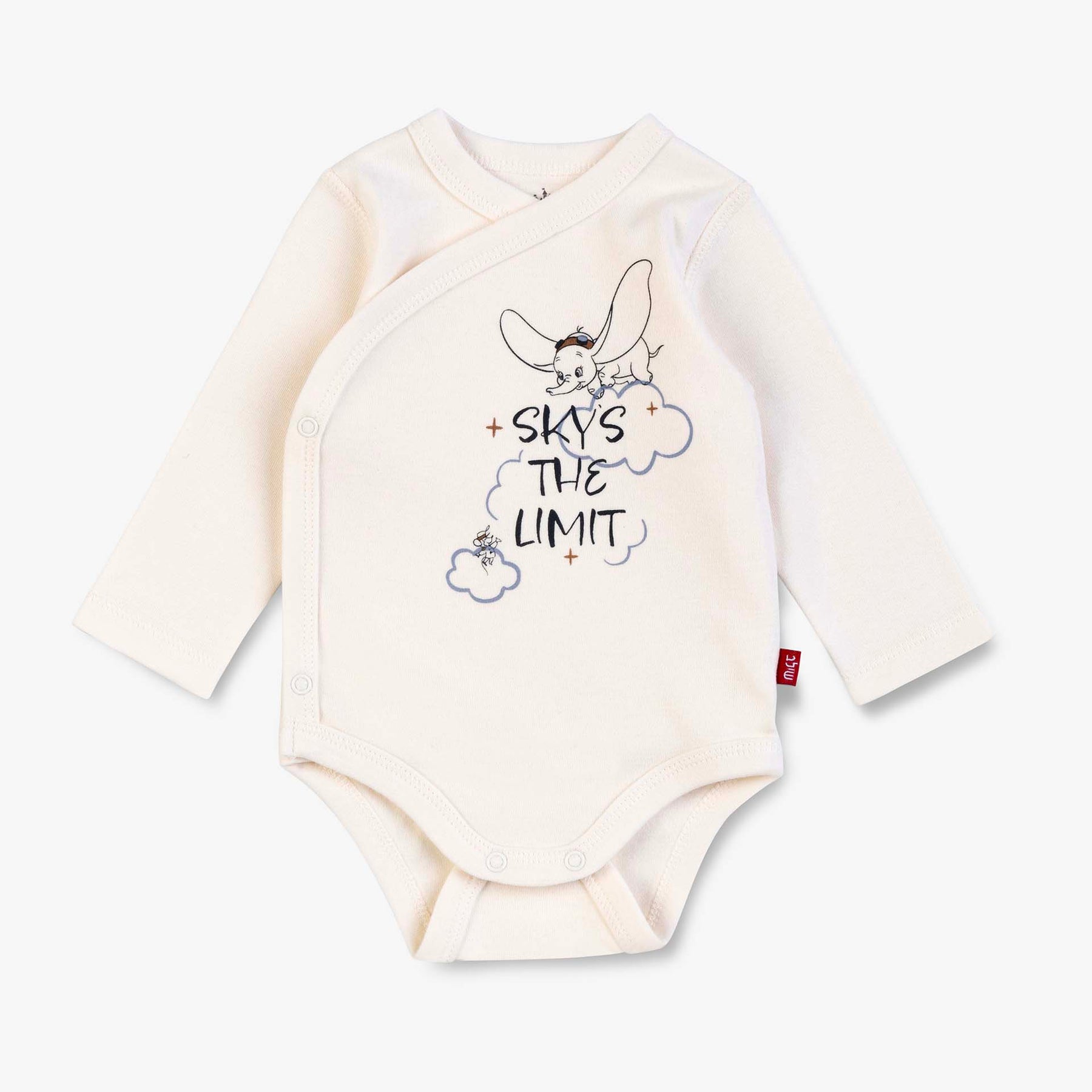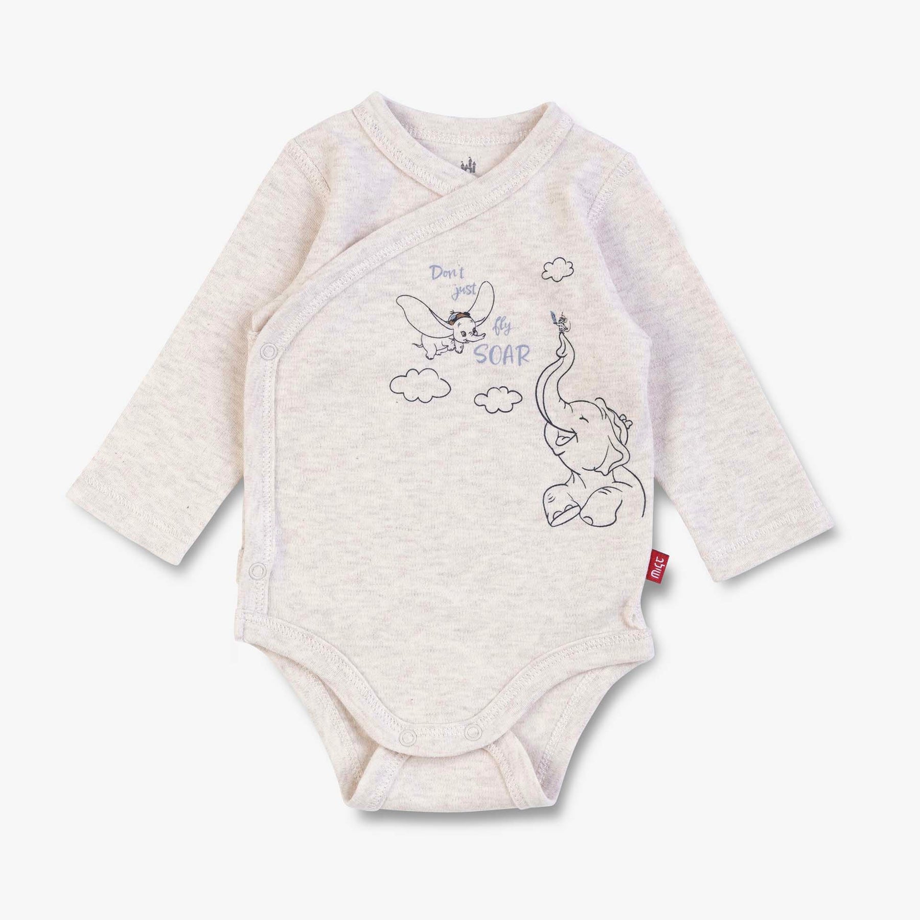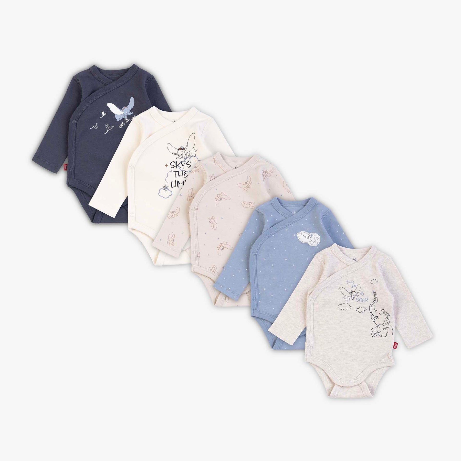מארז 5 בגדי גוף מעטפת ארוכים בצבעי קרם וכחול ובהדפסים מתוך דמבו. לבגדים סגירת לחצניות להלבשה קלה ונוחה.