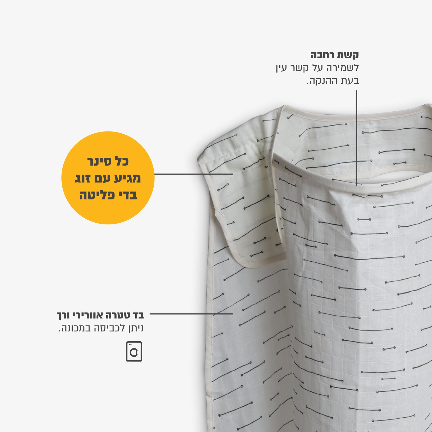 סינר הנקה גדול ועוטף עשוי בד טטרה רך אוורירי ורך לשמירת האינטימיות הנחוצה לך ולתינוקך בזמן ההנקה. קשת רחבה המאפשרת לך ולתינוקך לשמור על קשר עין בעת ההנקה.