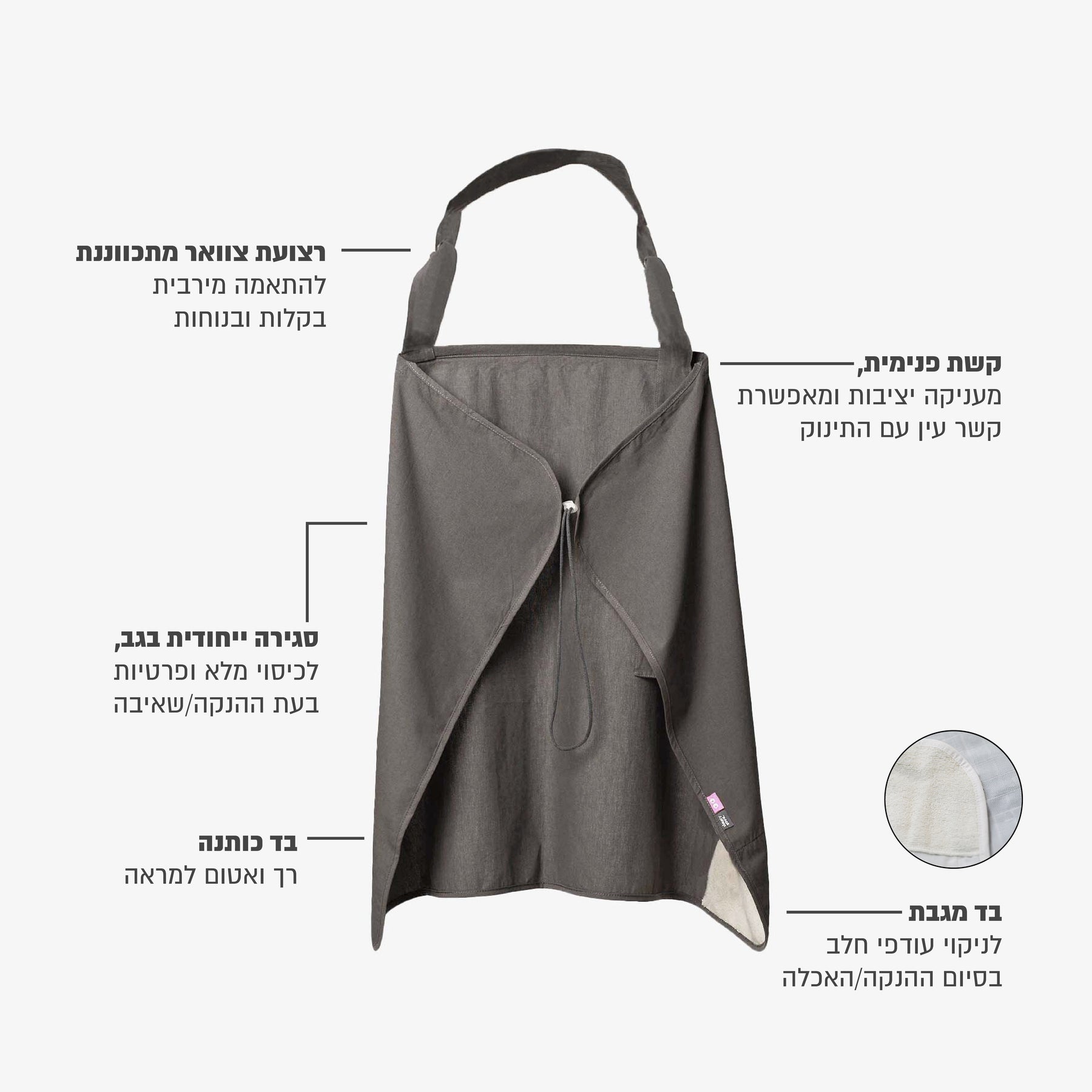 סינר 360° עשוי בד 100% כותנה אטום למראה הוא אינו שקוף ומצויד גם בבד מגבת איכותי באחת מפינותיו מה שמאפשר ניקוי עודפי חלב בסיום ההנקה או השאיבה.