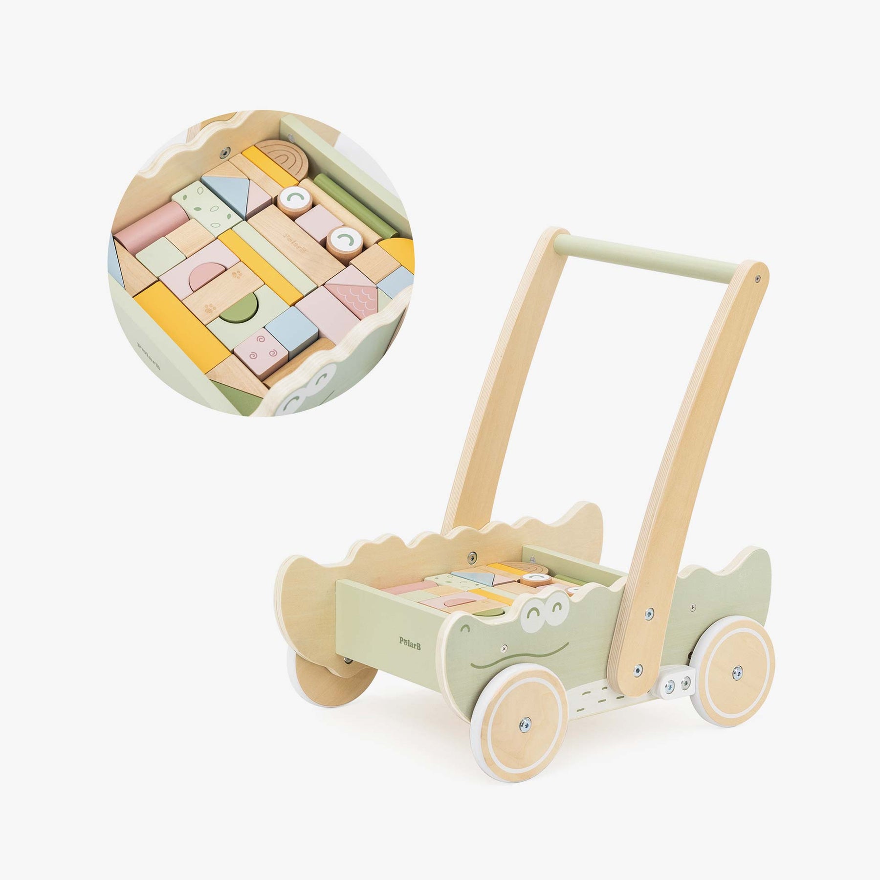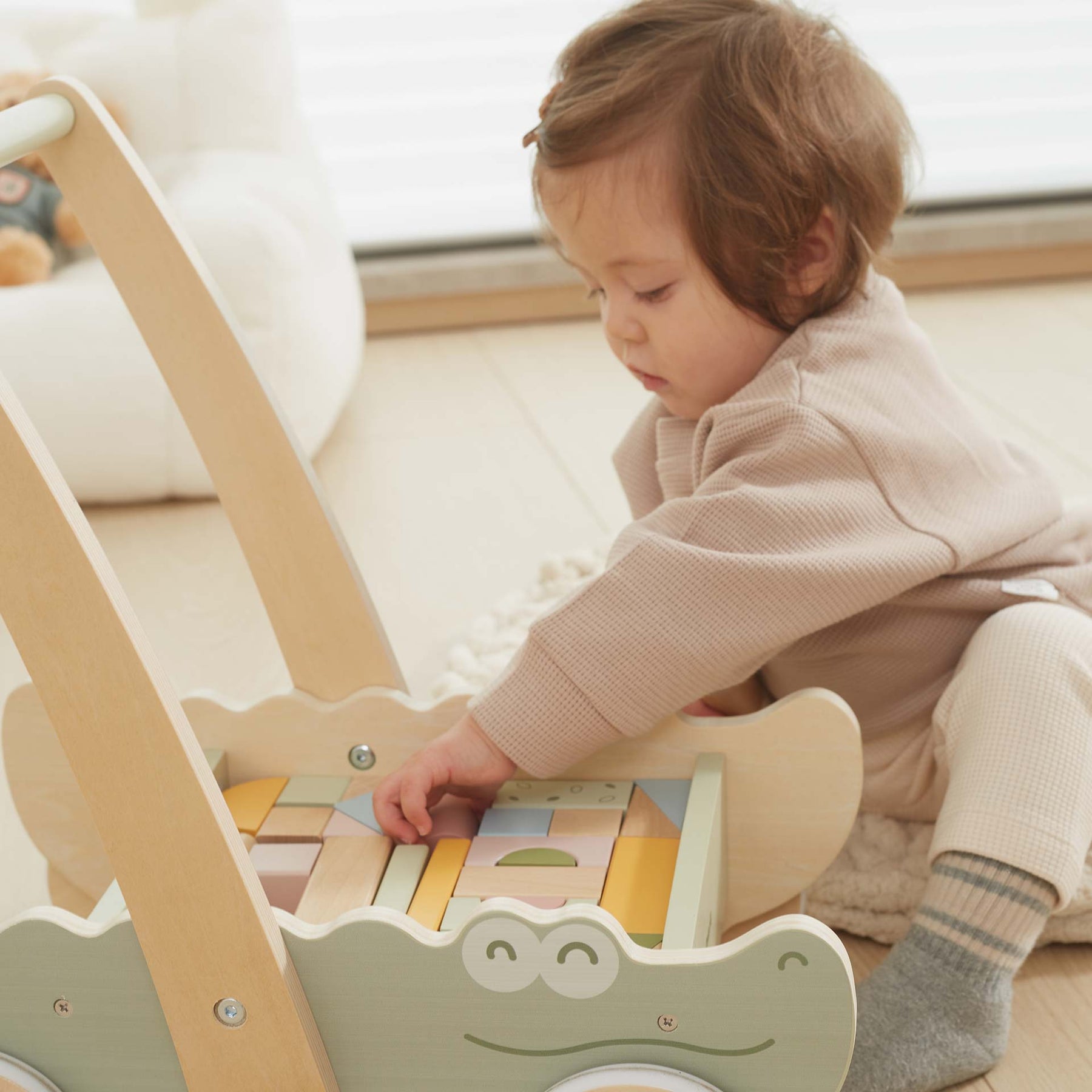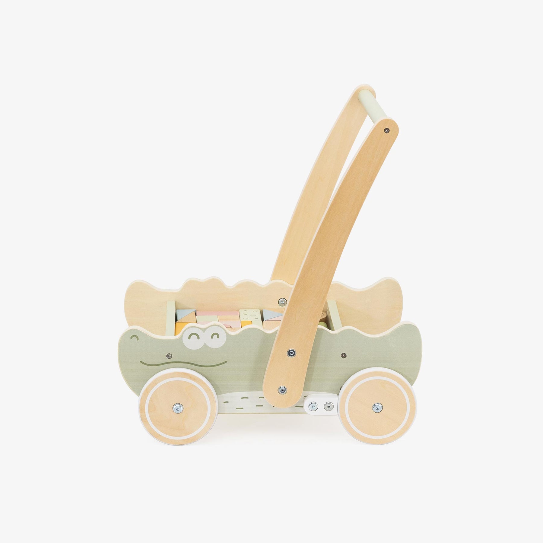 עגלת קוביות עץ בדמות תנין בצבעי פסטל רכים. העגלה משמשת גם בתור הליכון באמצעות מנגנון המאט את קצב הגלגלים לשימוש בטוח לתינוקות הלומדים ללכת. מכיל 40 חלקי משחק מעץ. גודל גובה 440 ממ. אורך 400 ממ. רוחב 275 ממ. מתאים לשימוש מגיל 12 חודשים ומעלה.