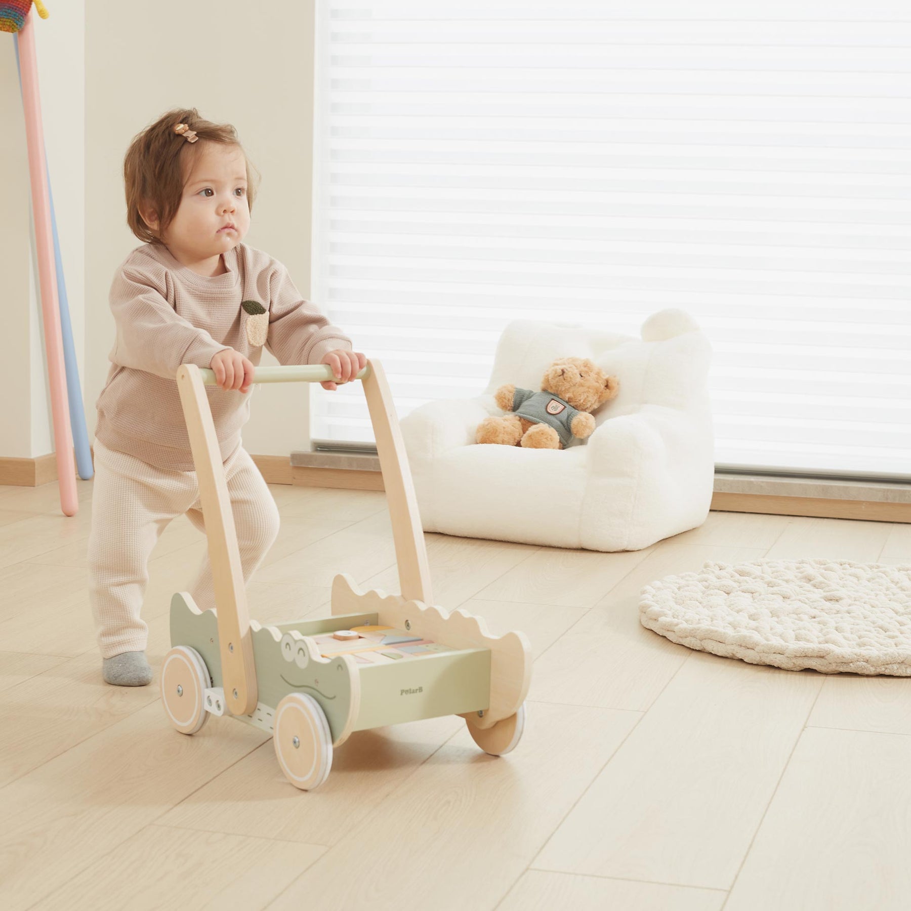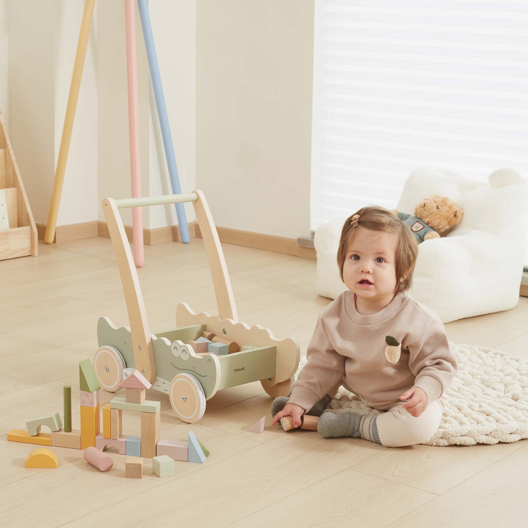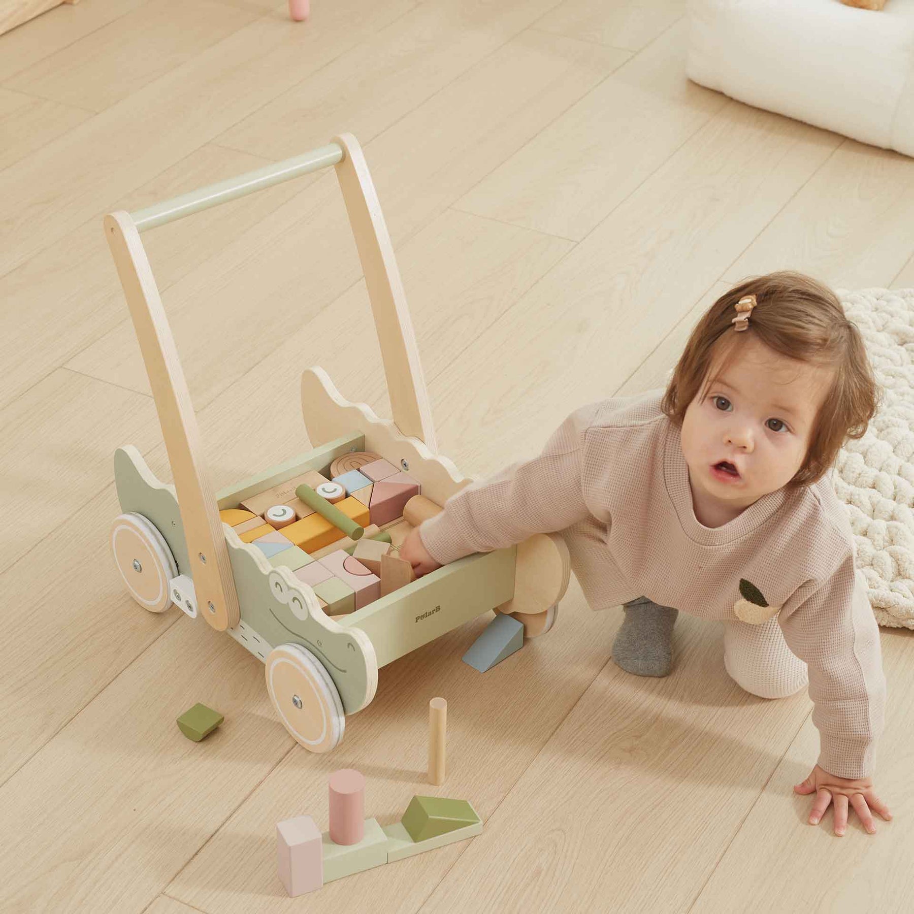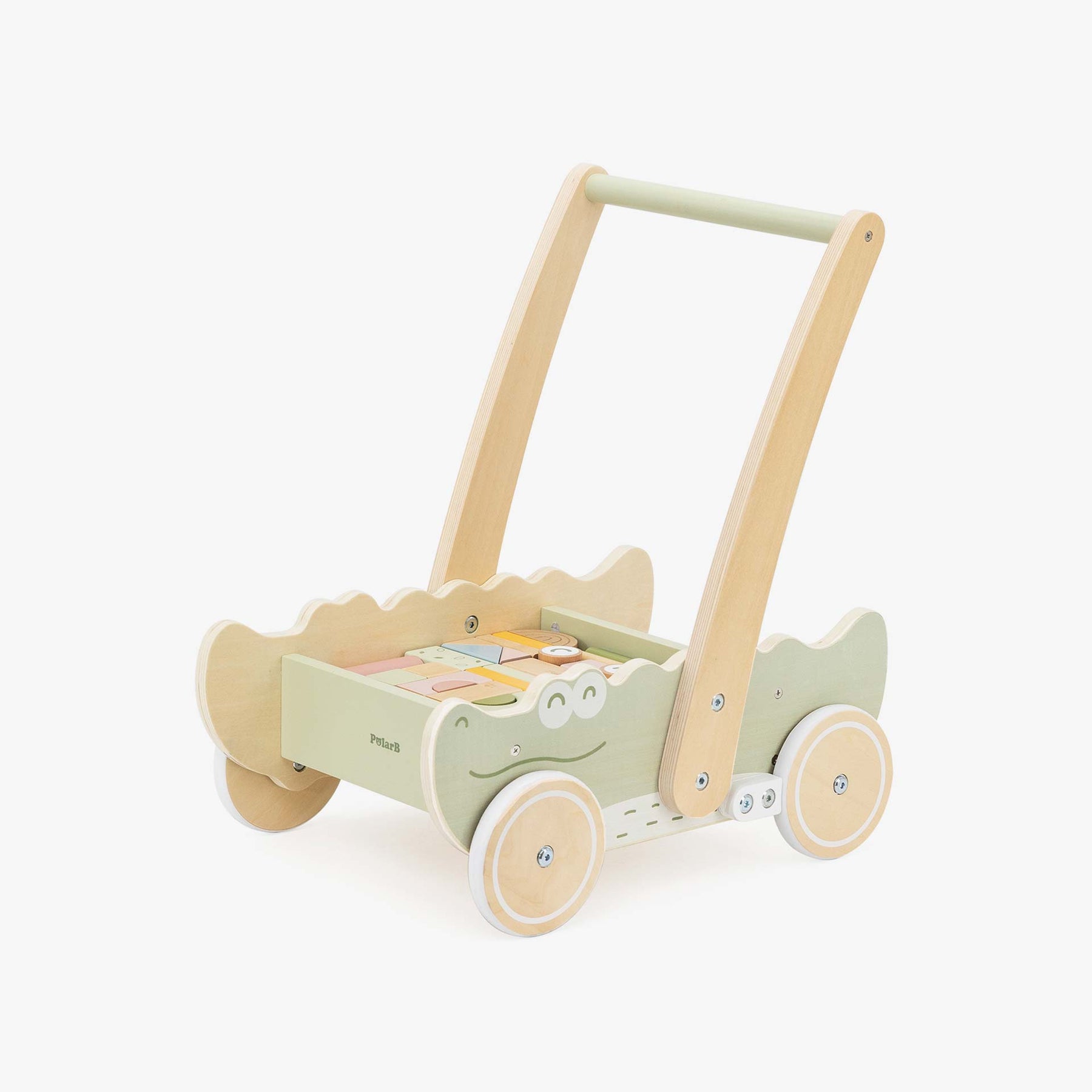 עגלת קוביות עץ בדמות תנין בצבעי פסטל רכים. העגלה משמשת גם בתור הליכון באמצעות מנגנון המאט את קצב הגלגלים לשימוש בטוח לתינוקות הלומדים ללכת. מכיל 40 חלקי משחק מעץ. גודל גובה 440 ממ. אורך 400 ממ. רוחב 275 ממ. מתאים לשימוש מגיל 12 חודשים ומעלה.