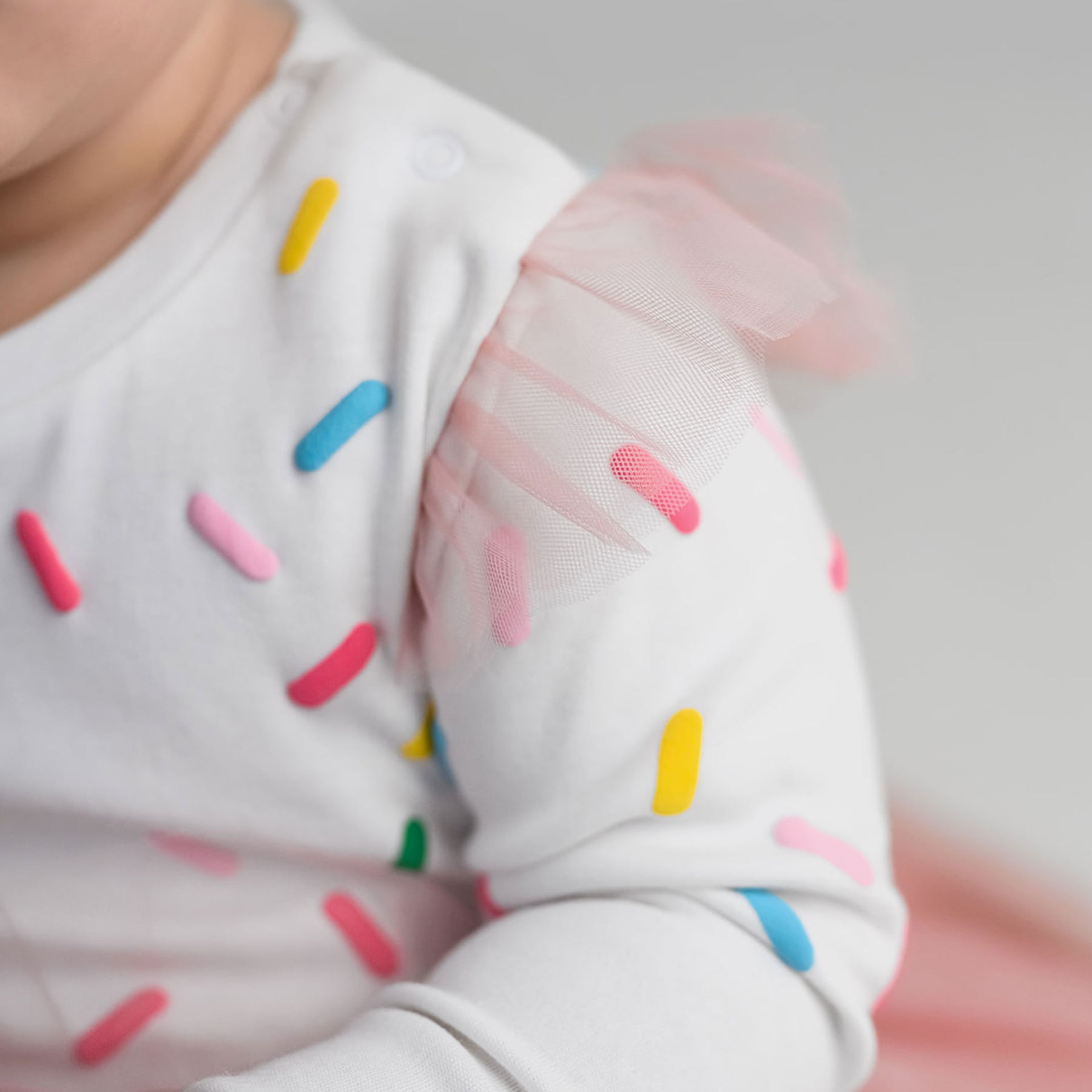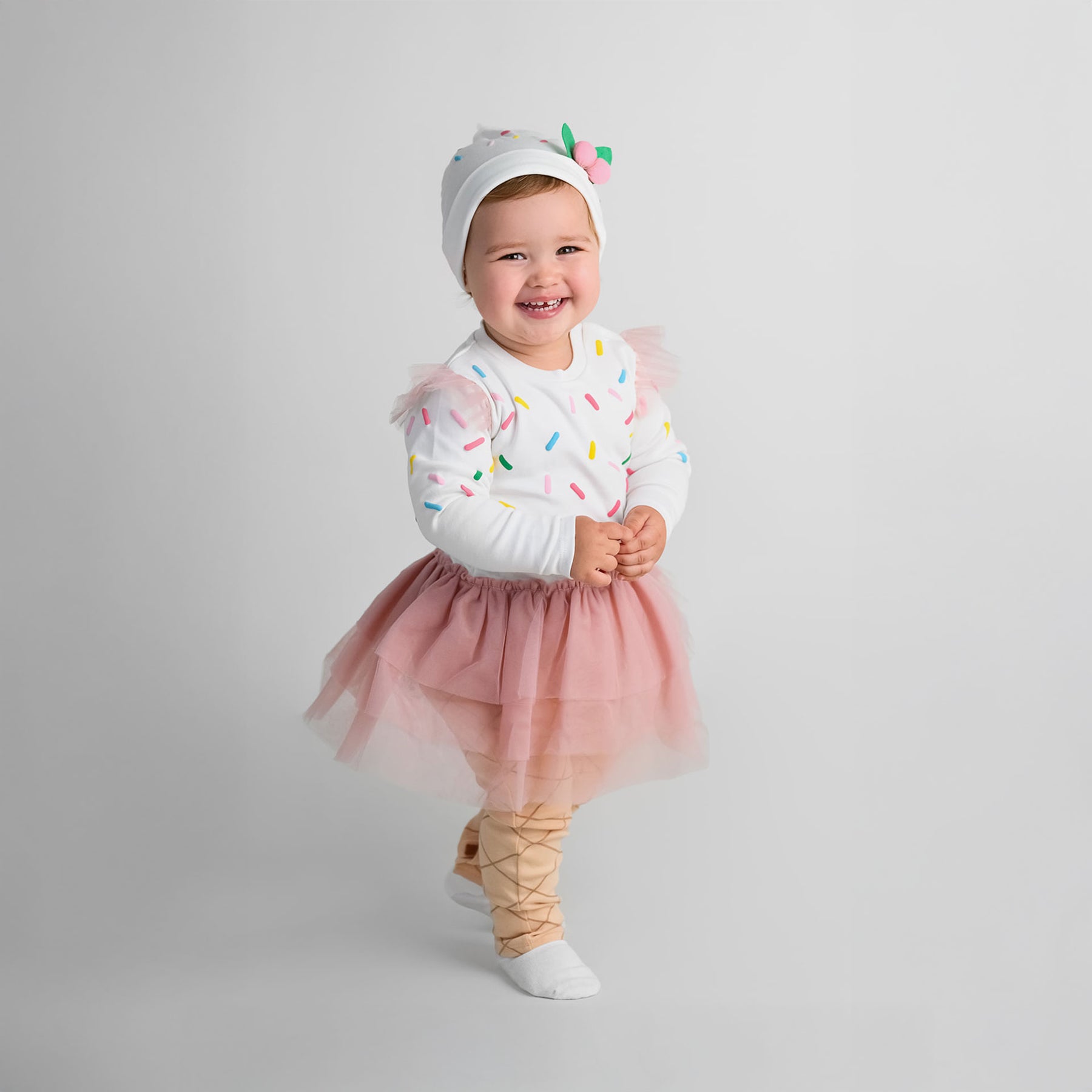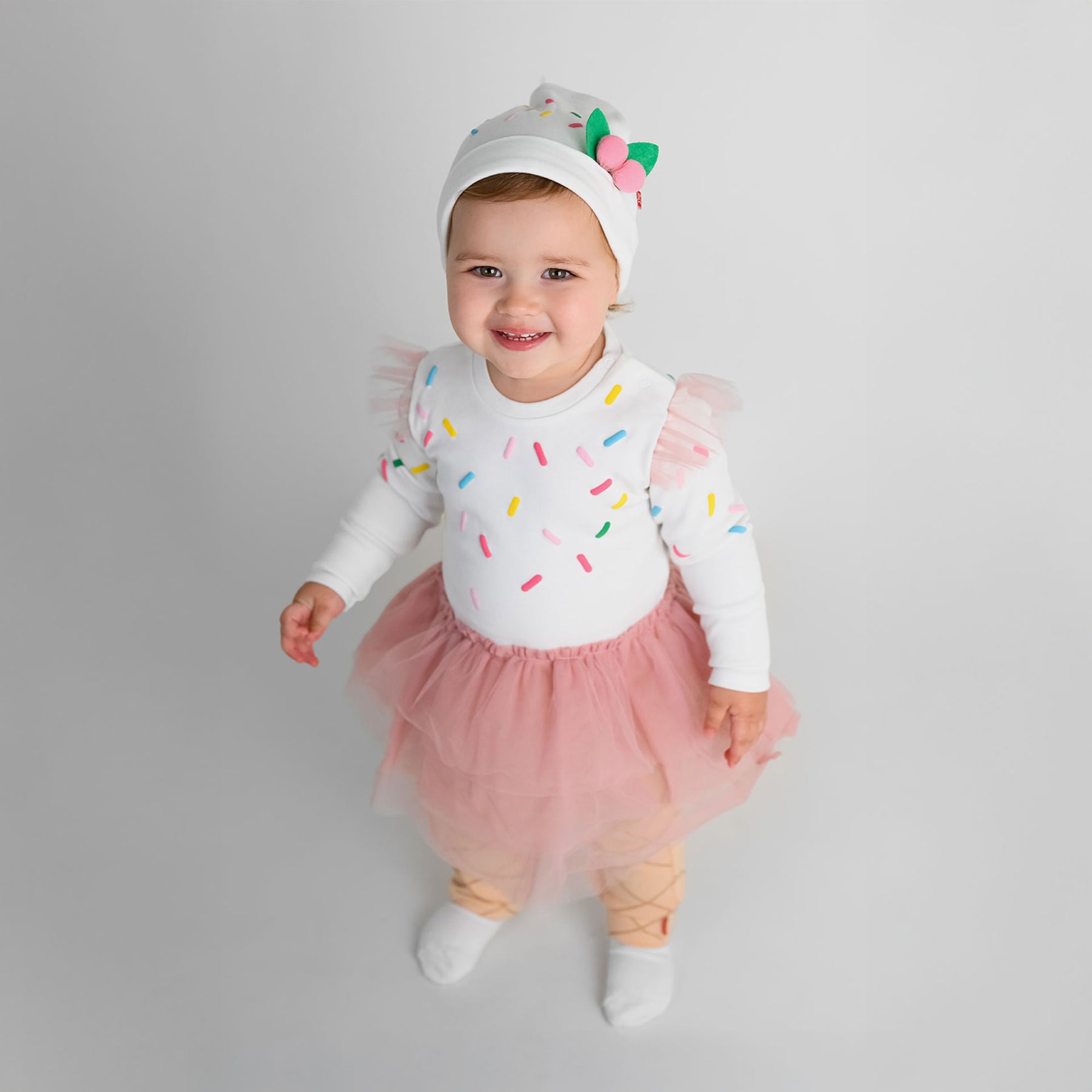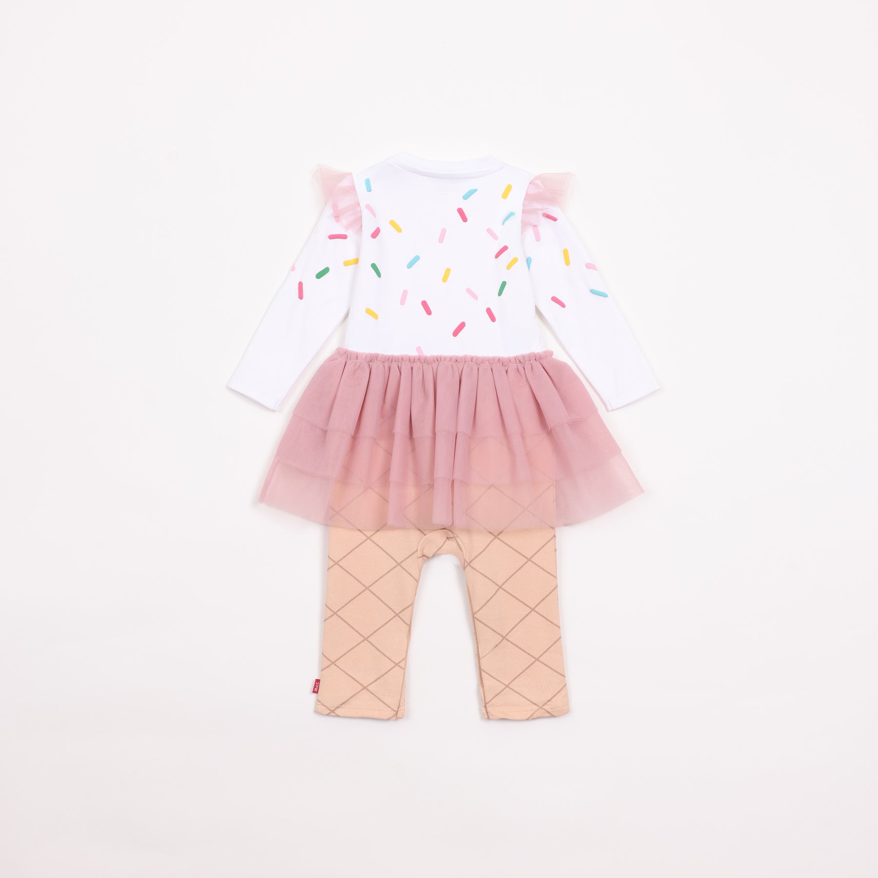 גזרה משולבת הכוללת חלק עליון מבד כותנה רך עם שרוול ארוך, בהדפס סוכריות צבעוניות, וחצאית טוטו קלה בשכבות בד סינטטי המחוברת לאוברול.
