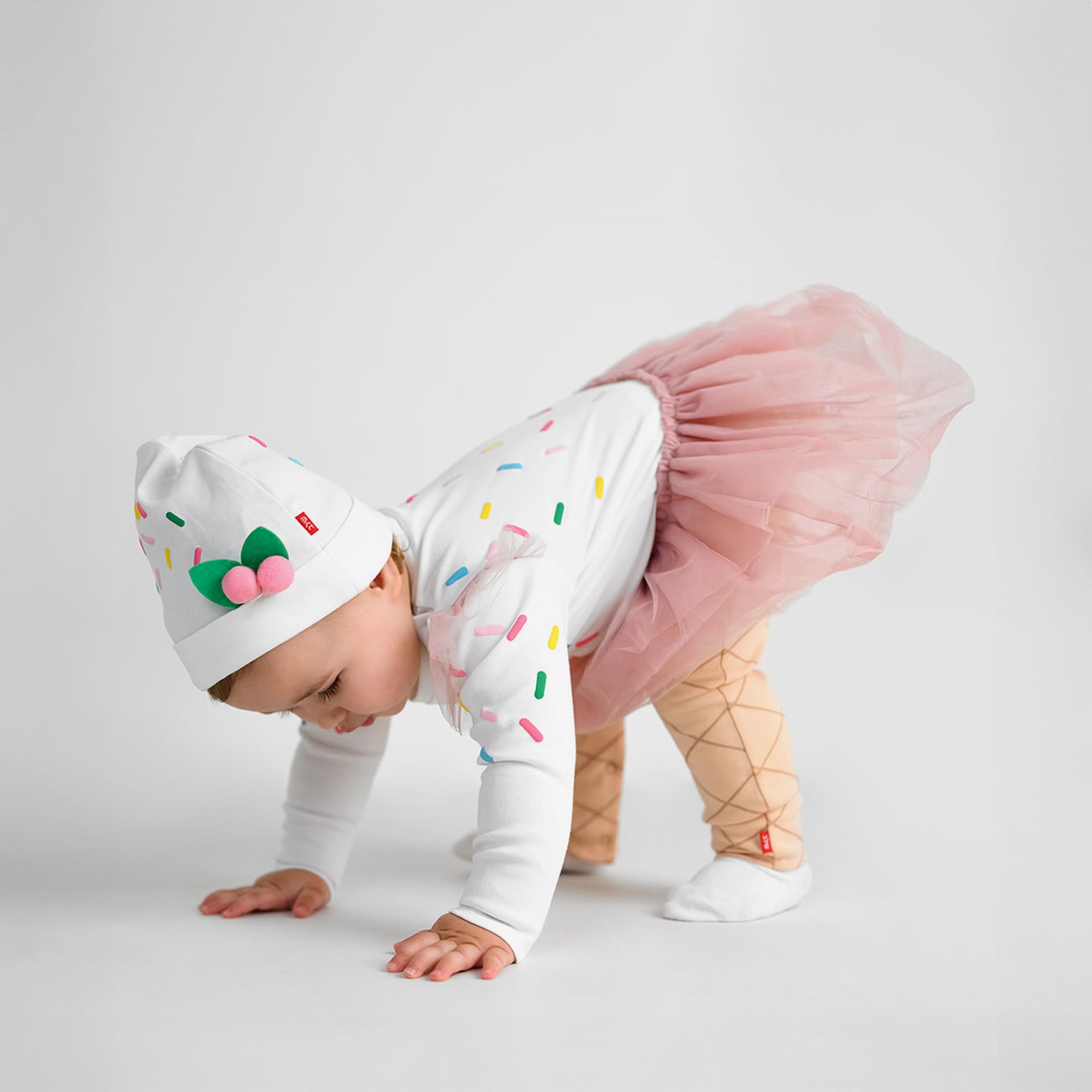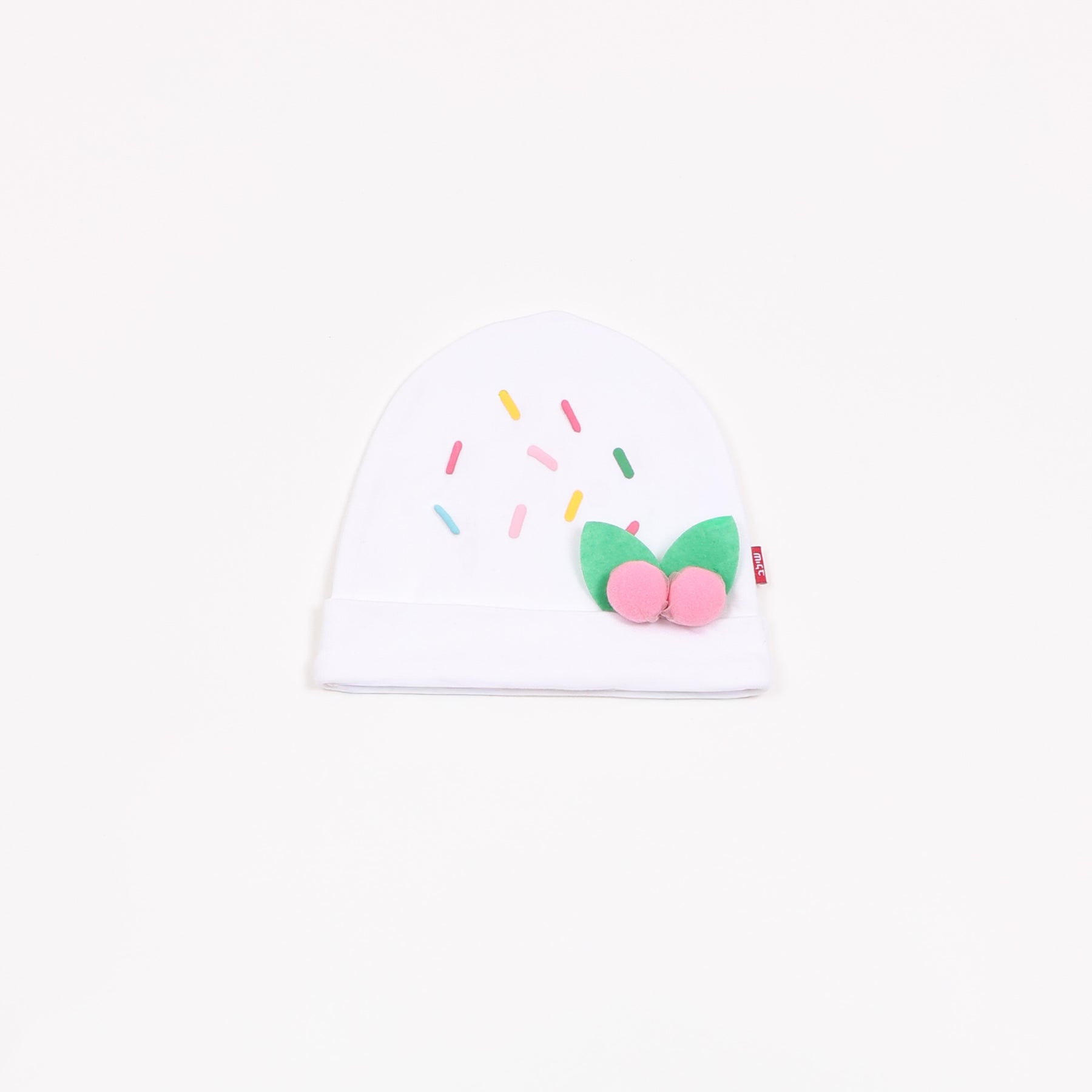 מגיע עם כובע תואם בעל הדפס סוכריות צבעוניות ופרח קטן בצד.