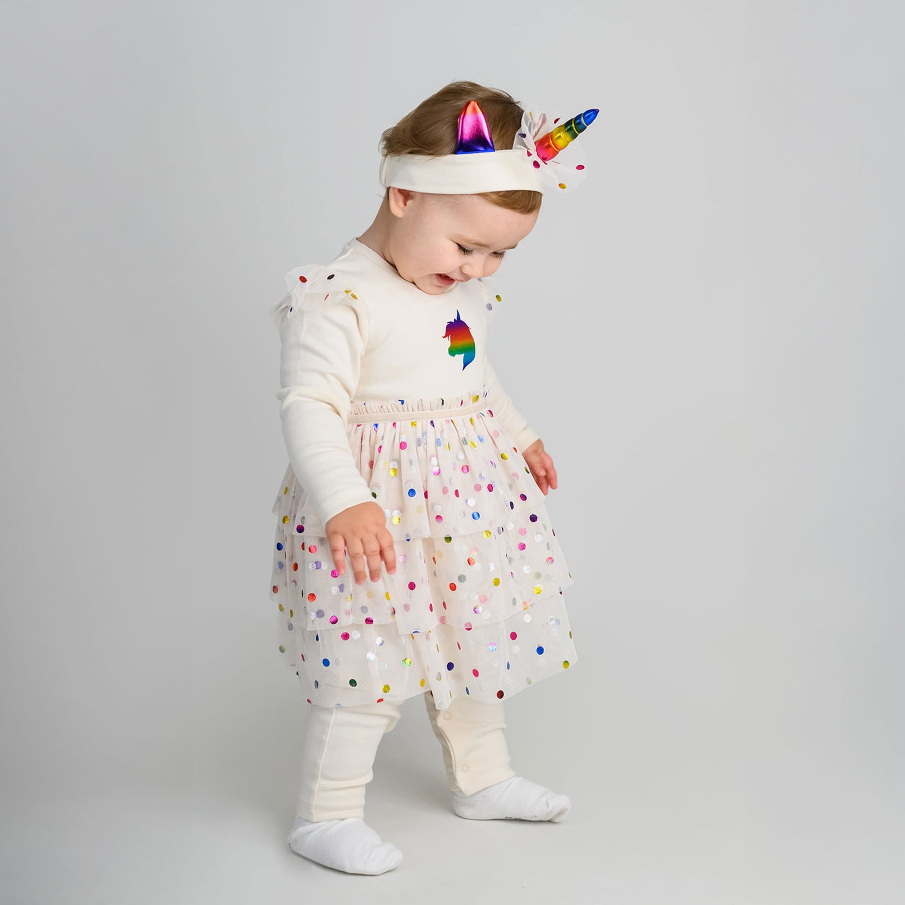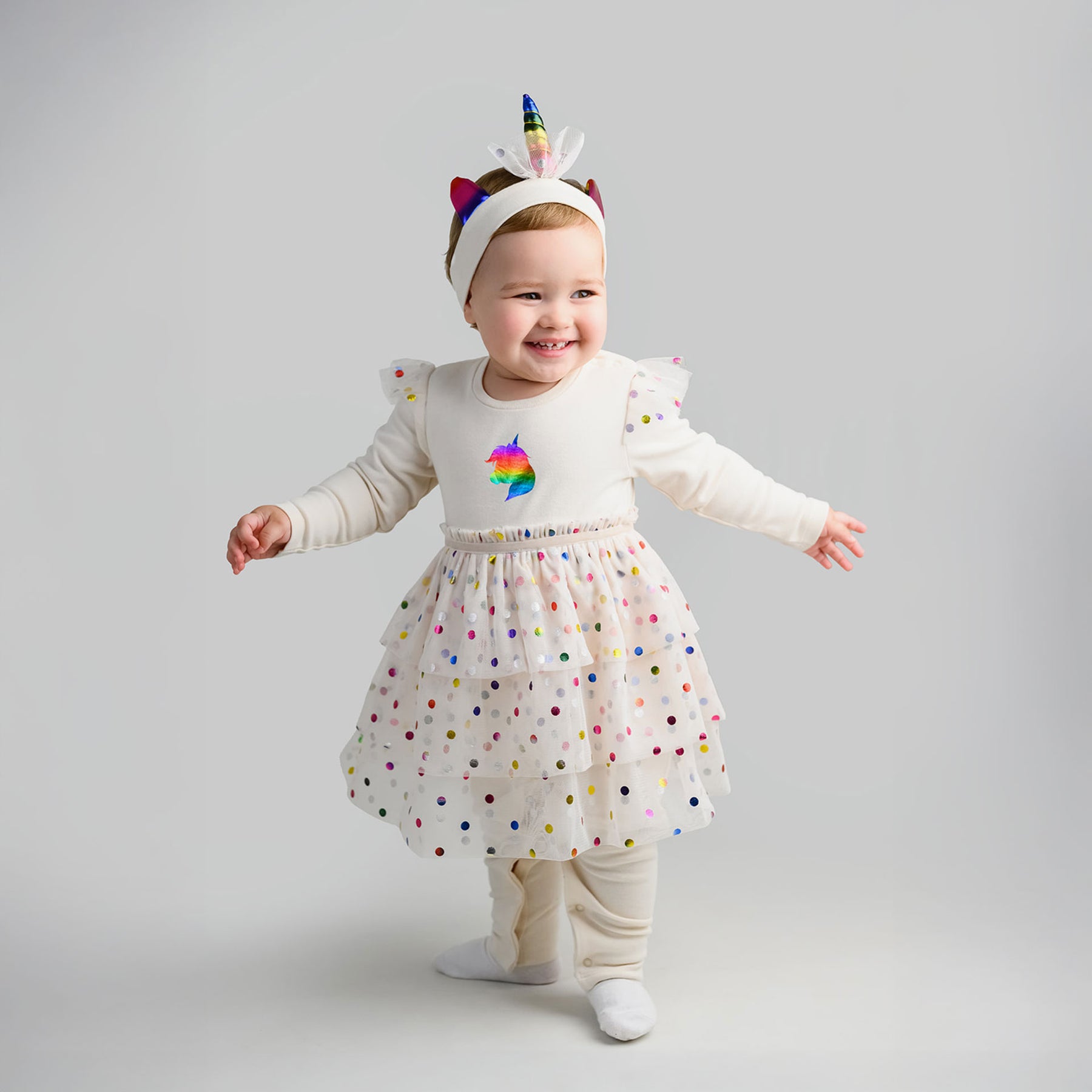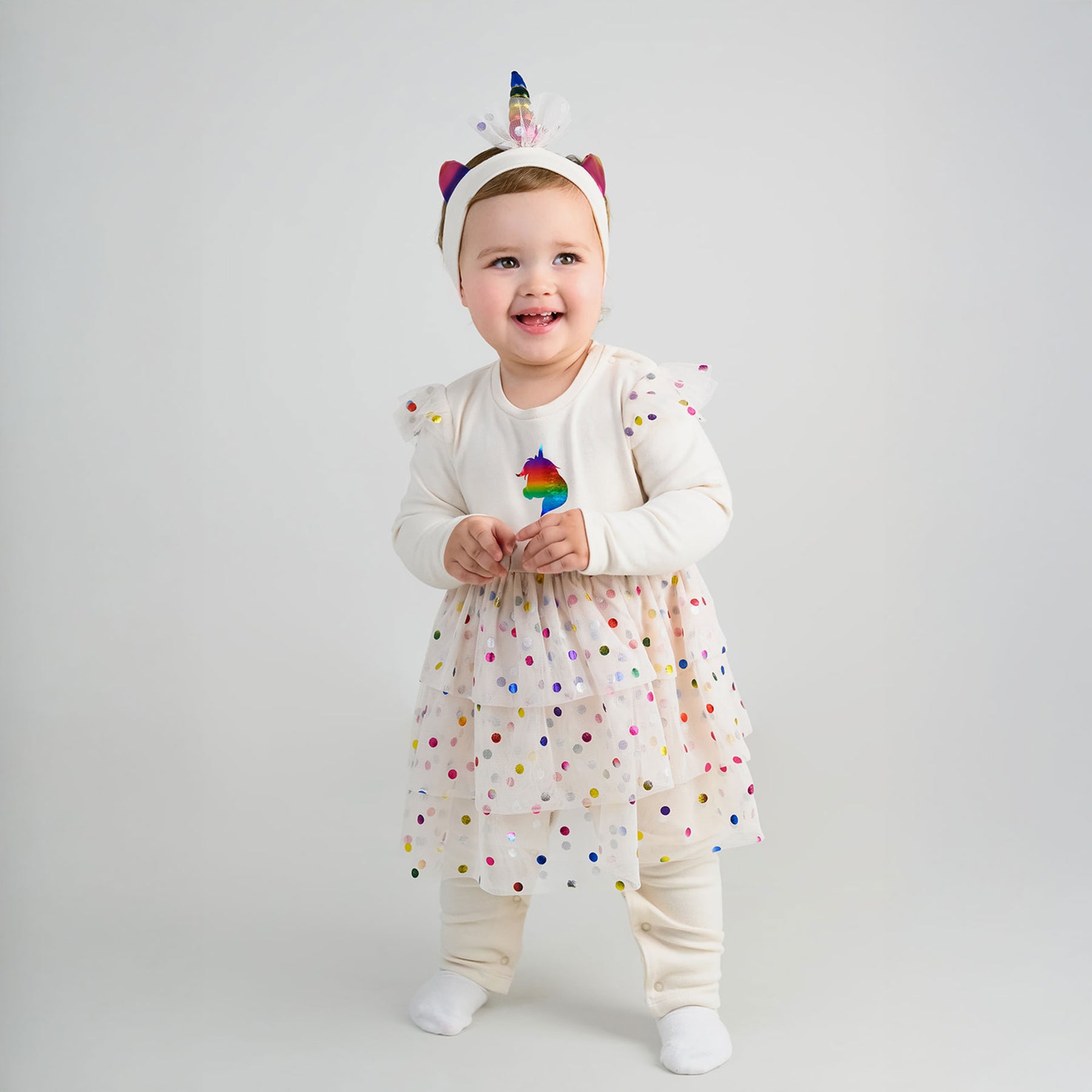 החלק העליון בצבע שמנת עם הדפס חד קרן צבעוני במרכז, ובכתפיים עיטורי בד טול