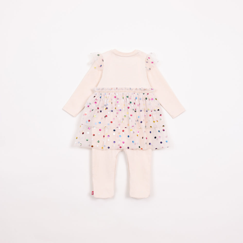 בחלק התחתון מחוברת חצאית שכבות מבד טול עם נקודות צבעוניות.