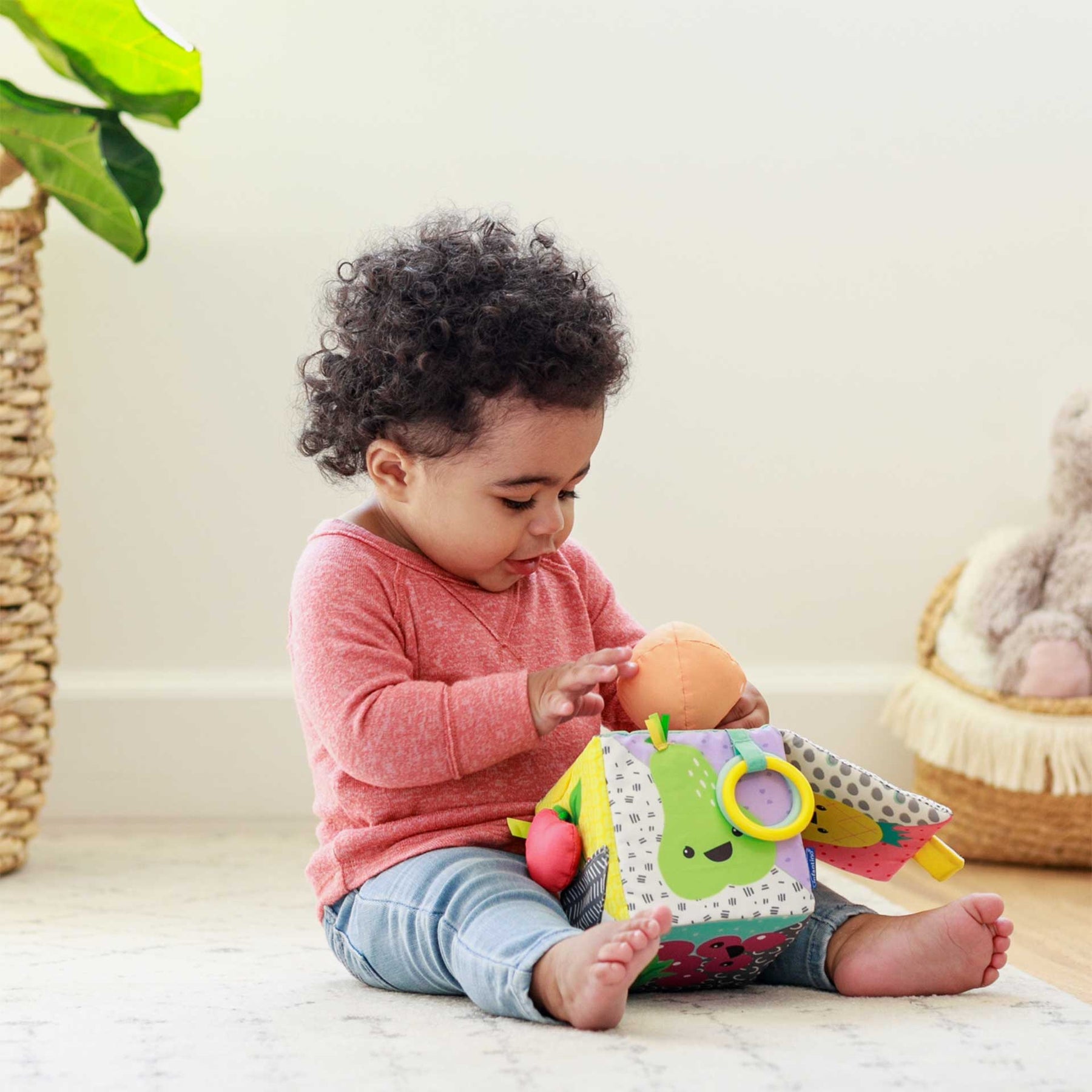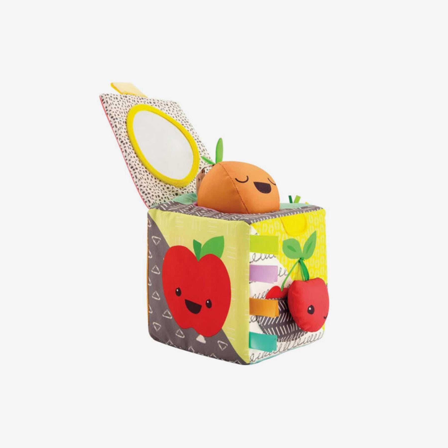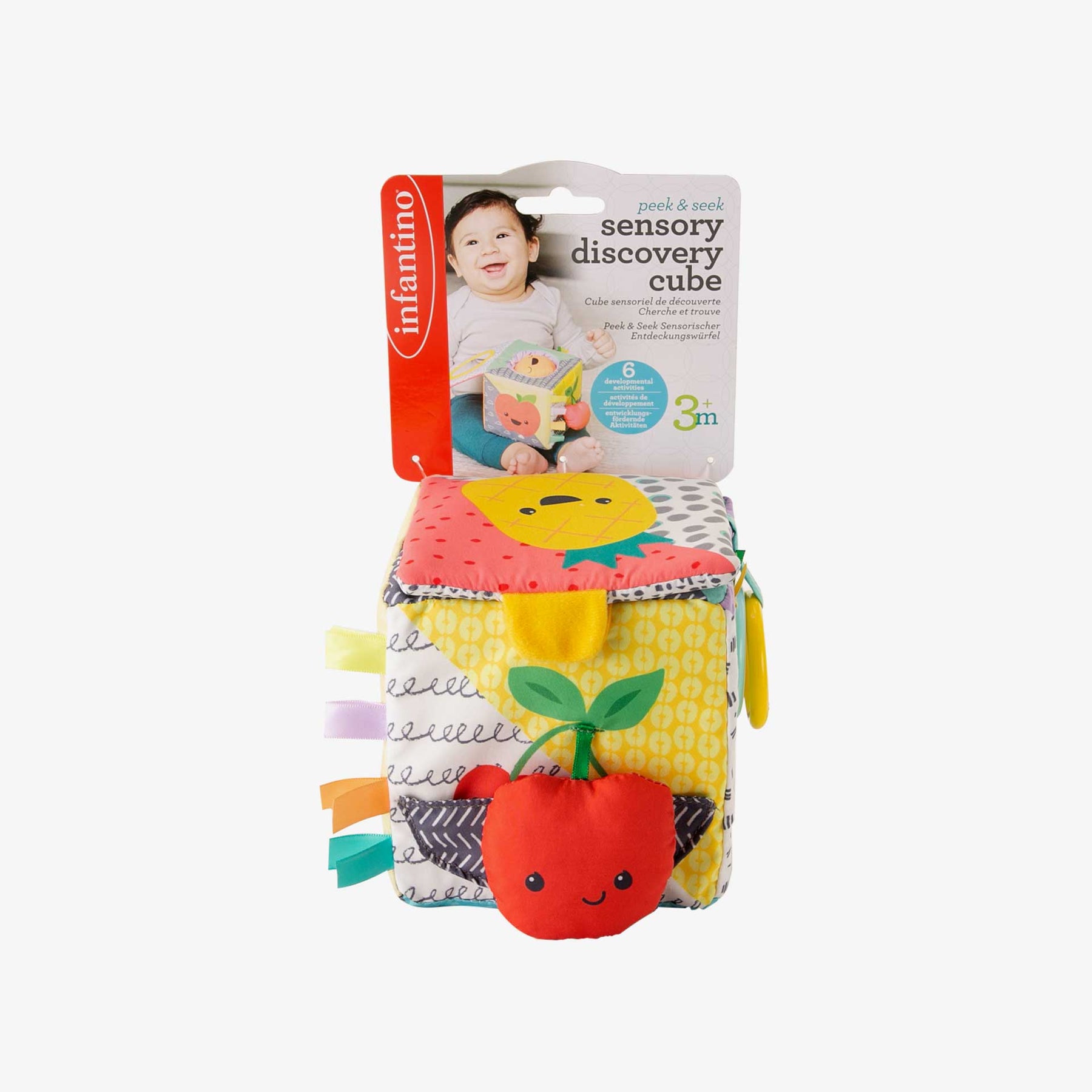 קוביית פעילות מבד בעלת מרקמים צבעים וצורות שונות. מגיל 3 חודשים ומעלה.