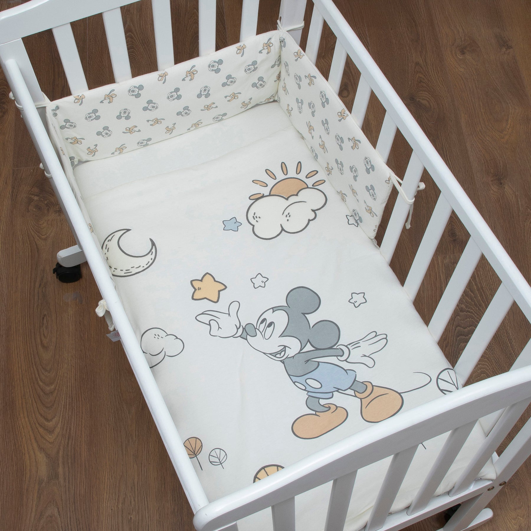 סט מצעים מפואר לעריסת התינוק מתוך קולקציית דיסני החדשה בעיצוב דמותו של מיקי מאוס. הסט כולל מגן ראש במידה 20X126 סמ 100% כותנה+ מילוי 100% הוליפייבר שמיכה דו צדדית 80X62 סמ 100% כותנה+ מילוי 100% הוליפייבר סדין 100% כותנה בצבע אבן 84X45 סמ.