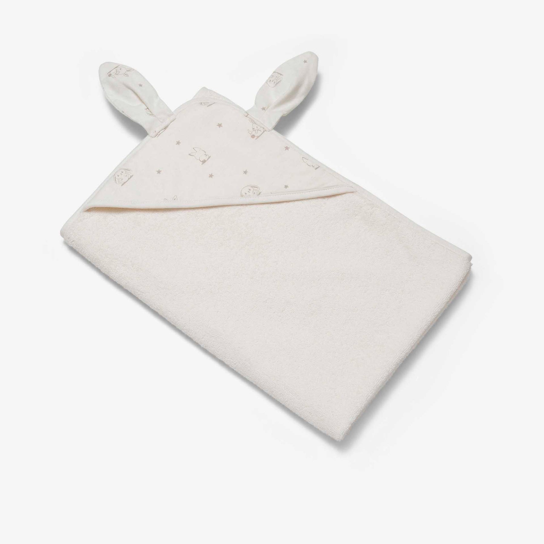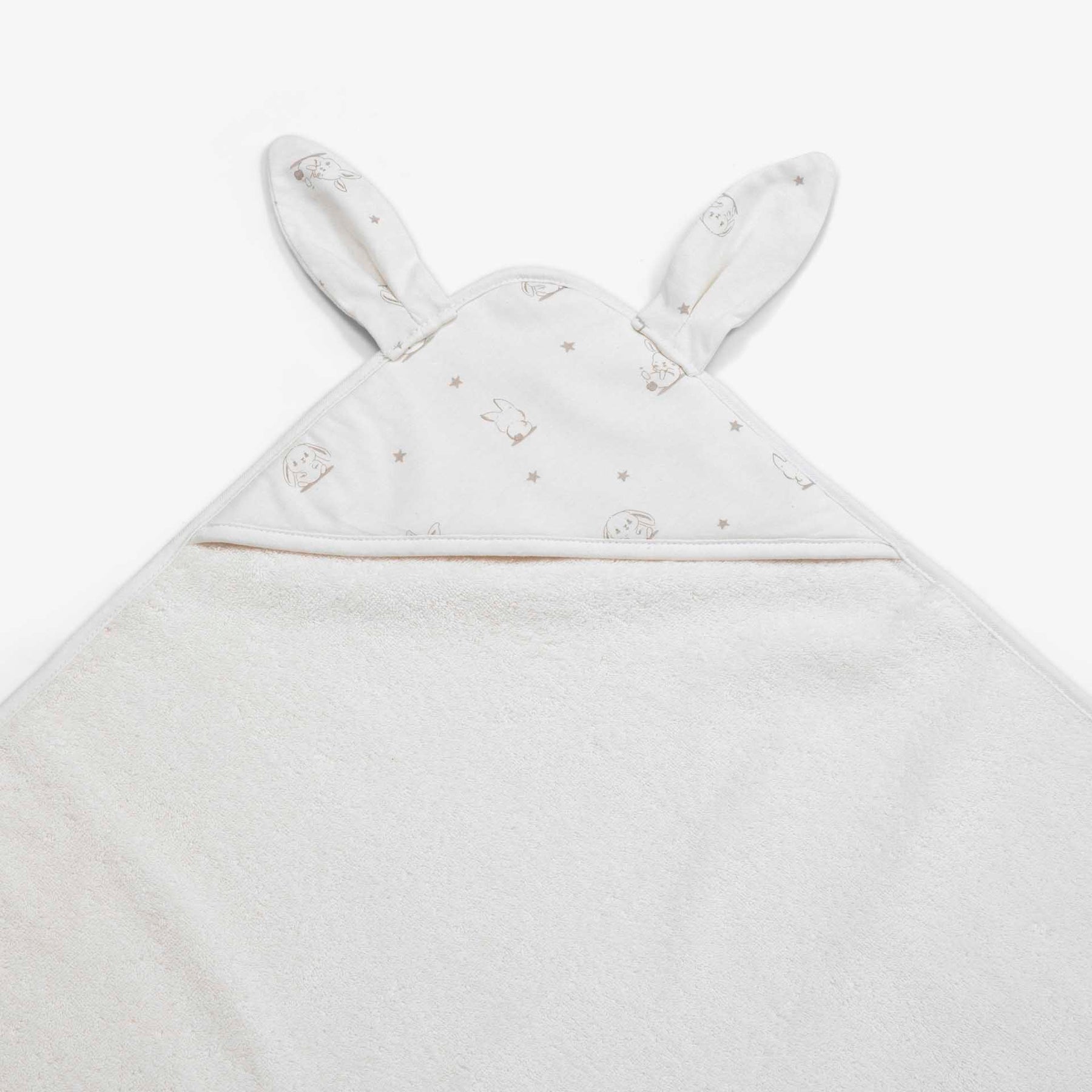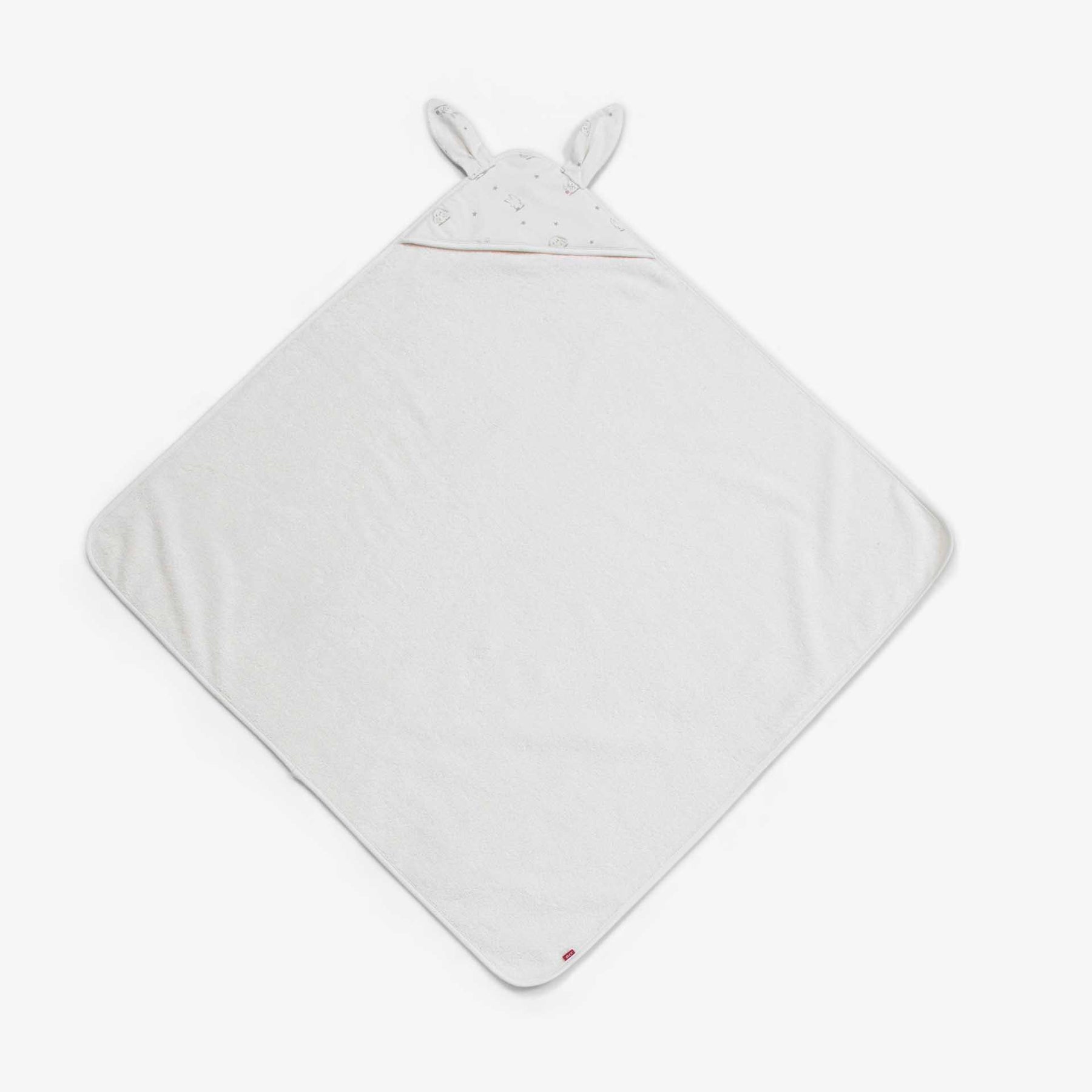 מגבת קפוצ'ון קטנה מעוצבת בהדפס ארנבים ואוזניים ארוכות. המגבת בצבע שמנת. מידה: 80X80מ סמ. 100% כותנה.